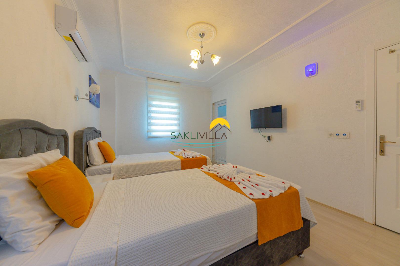 2. Yatak Odası: 2 tek kişilik yatak, klima, komodin, makyaj masası, elbise dolabı, banyo tuvalet bulunmaktadır