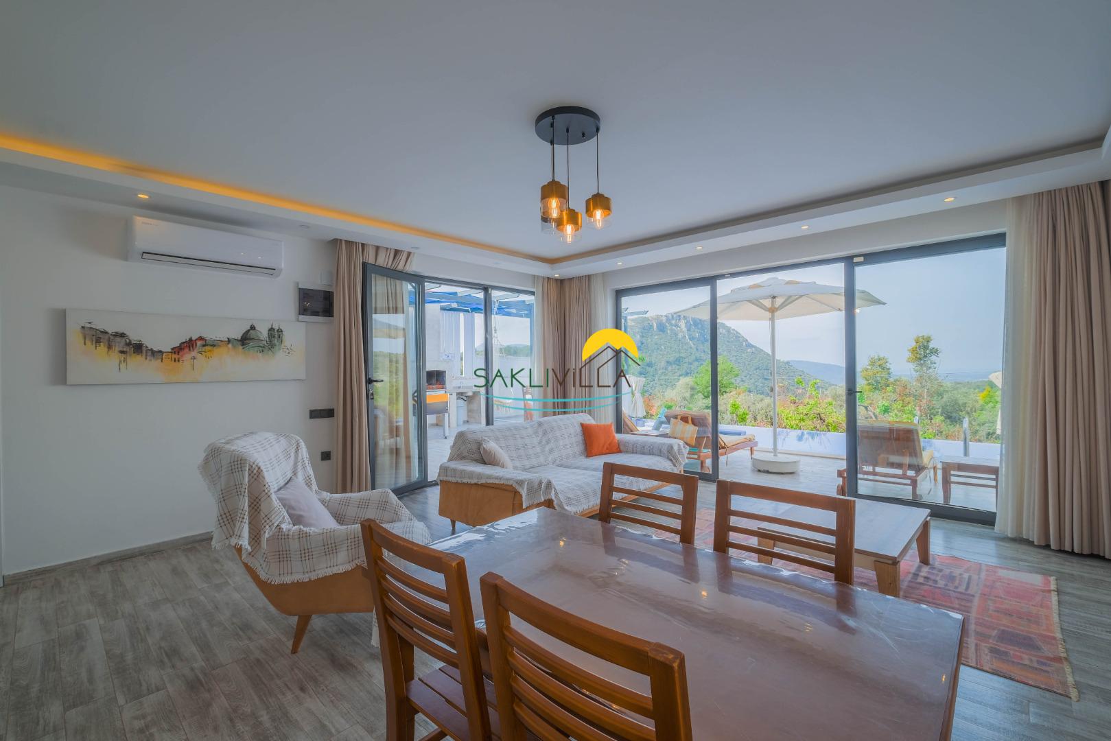 Villamız 2 yatak odası ve yüzme havuzuna açılan açık mutfaklı oturma/yemek odasından oluşur. Mutfak kısmında bulunan yemek masası 4 kişi kapasitelidir.