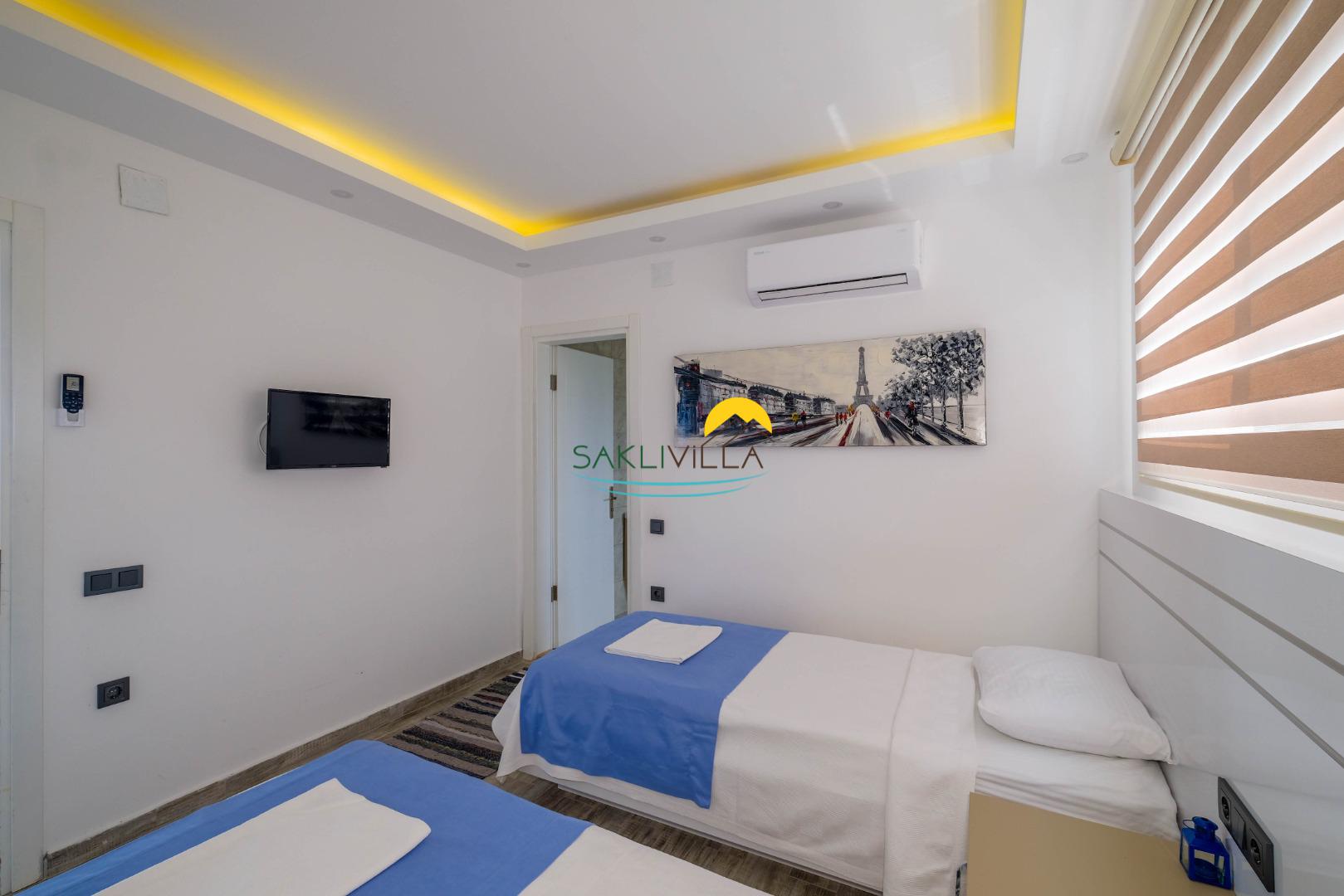 Villa Planı: villamız,1’i ensüit 2 yatak odasına sahip olup 4 kişi konaklama kapasitelidir. Suit yatak odasında jakuzide bulunmaktadır. 2 yatak odasında 1 çift kişilik ve 2 tek kişilik yatak bulunmaktadır.