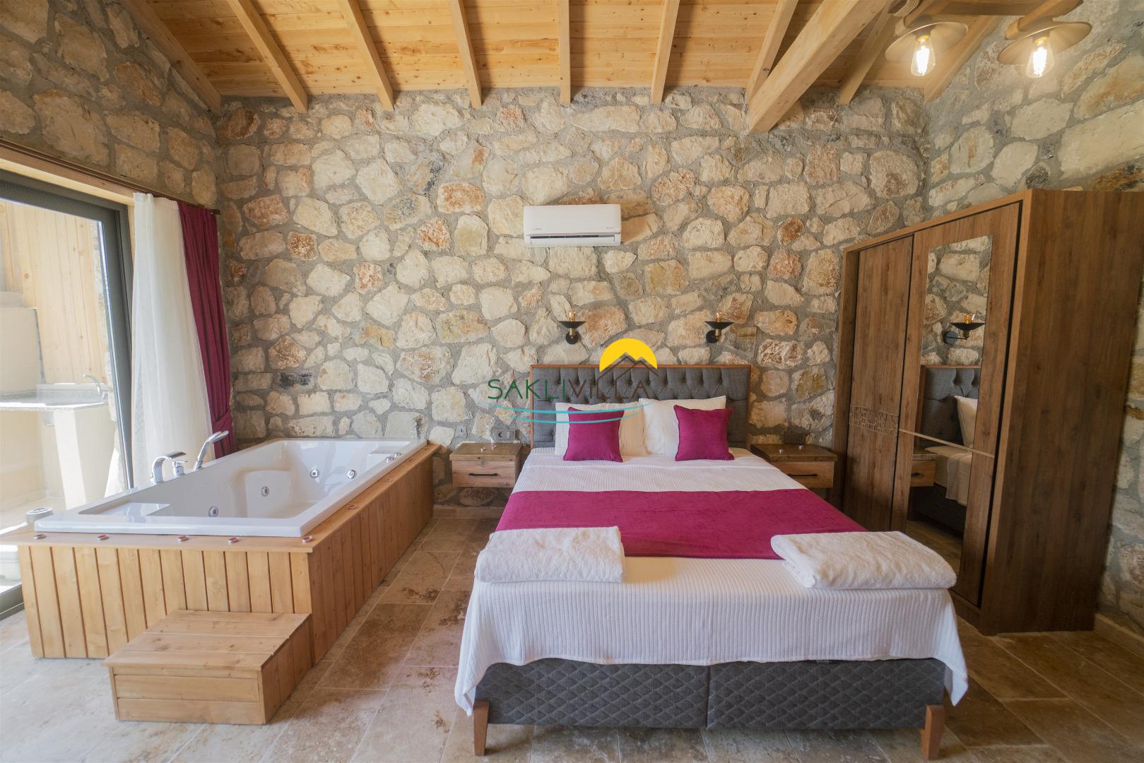 1. Yatak Odası: 1 çift kişilik yatak, klima, komodin, makyaj masası, elbise dolabı, jakuzi ve banyo tuvalet bulunmaktadır.