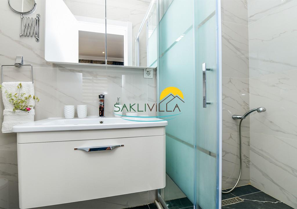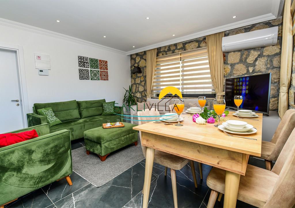 Salon : Şık dekore edilmiş salonda, oturma grubu, TV, uydu alıcı ve klima yer almaktadır. Ayrıca salondan havuz terasına çıkışta bulunmaktadır.