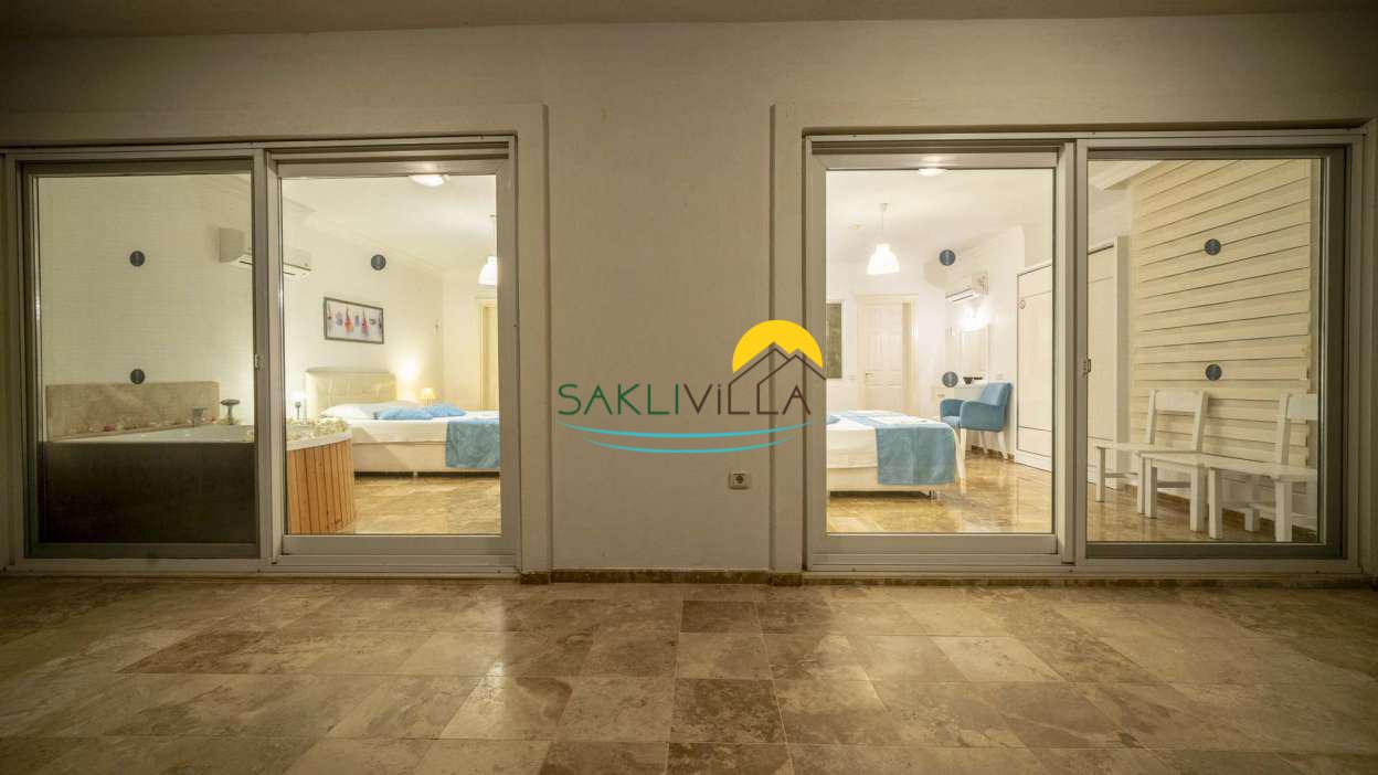 Villa Naz modern yapısı, özel havuzu, havuz etrafının özel taş duvar ve ahşap perde ile çevrili olduğu için muhafazakar balayı çitflerimiz için uygun bir villadır.