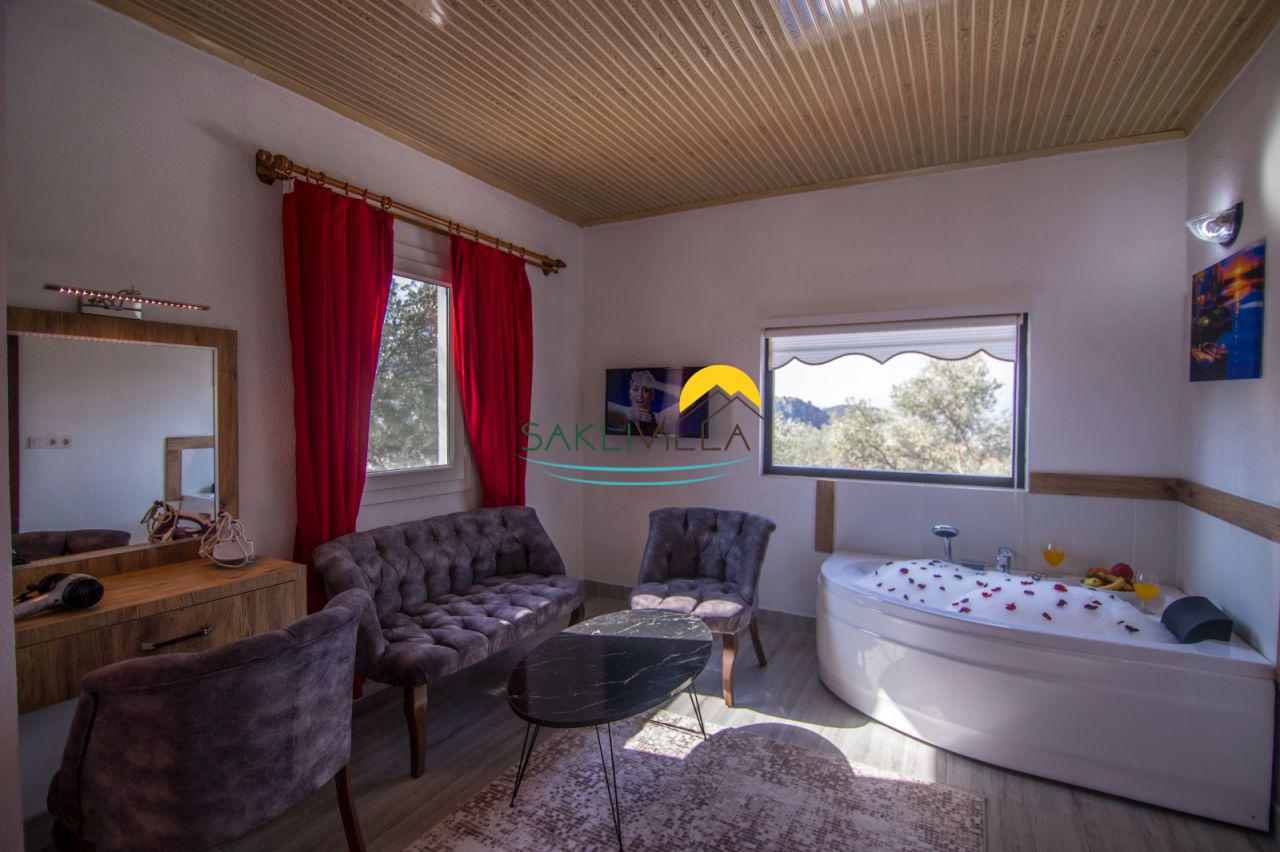 Villa Nerito, sade ve şık bir tasarıma sahiptir. Bu tasarım sayesinde misafirlerimiz, konforlu ve rahat bir konaklama deneyimi yaşayacaklardır. Villamızda bulunan jakuzi ise misafirlerimize ekstra bir konfor ve lüks sunmaktadır. Jakuzinin keyfini çıkarırken, doğanın güzelliklerini seyretmek misafirlerimiz için unutulmaz bir deneyim olacaktır. Fotoğraflardan da görüldüğü gibi korunaklı tatil evimiz sade ve şık bir mimariye sahiptir. İçerisinde kaliteli ve lüks eşyalar kullanılmış olup, siz değerli misafirlerimizin rahatlığı için her şey en ince ayrıntısına kadar düşünülmüştür.