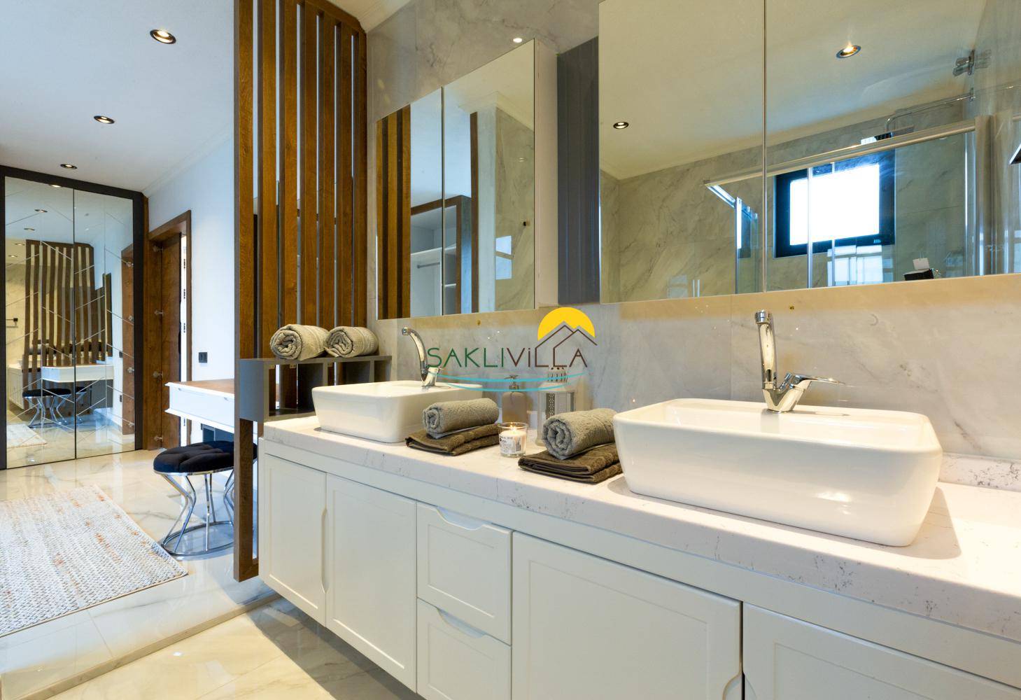 Salon: Villamızın salonu giriş katında yer almaktadır. Zarif dekore edilmiş salonumuzda oturma grubu, orta sehpa, TV ünitesi, akıllı TV, klima yer almaktadır. Giriş katında ayrı bir lavabo mevcuttur.