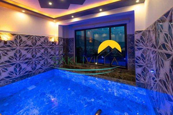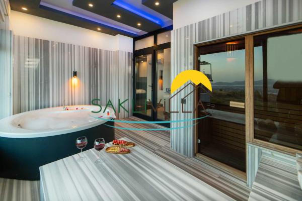 Yatak Odası:1 adet çift kişilik yatak, komodin, klima, kapalı ısıtmalı havuz, sauna, türk hamamı ve banyo bulunmaktadır.