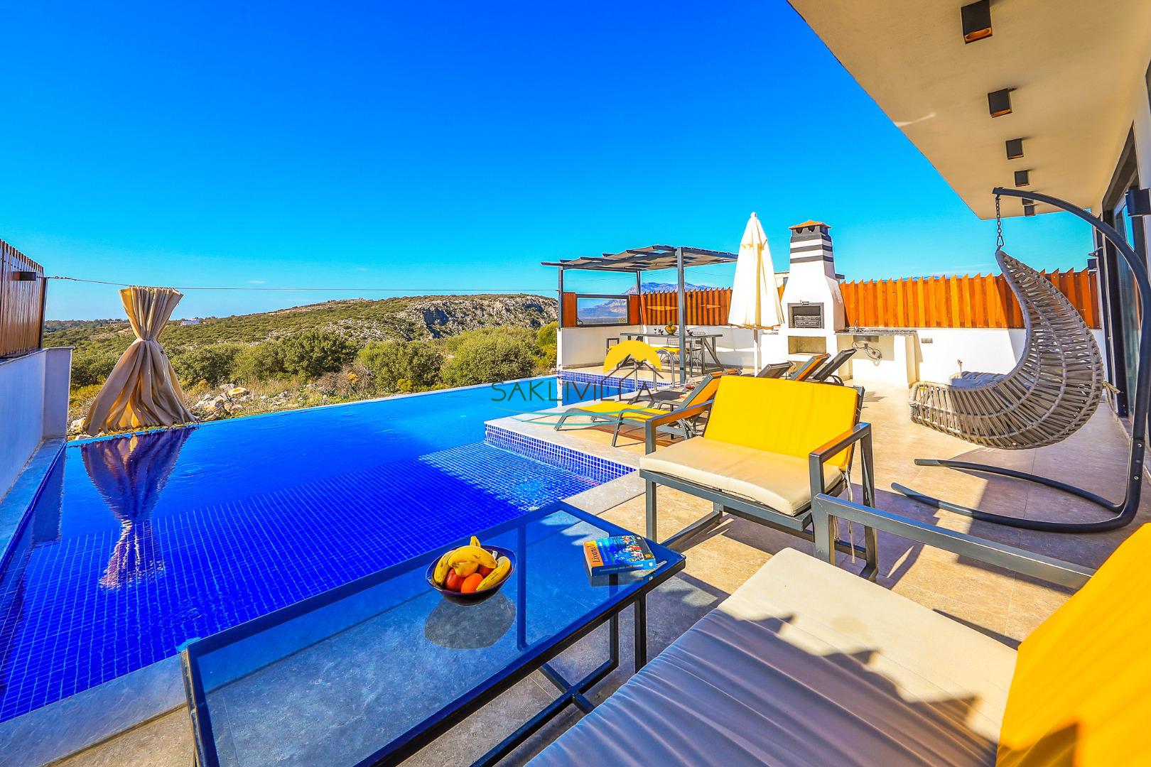 Villa Ahilya’nın konumu, tatiliniz süresince doğanın huzurunu doyasıya yaşamanıza olanak tanımaktadır. Kalkan ve Patara’nın göz kamaştıran deniz manzarası, villanın her köşesinden gözler önüne serilirken, misafirleri adeta büyülemektedir. Bu muhteşem manzarayı seyretmek için, villanın özel havuz başında keyifli anlar geçirebilir, doğanın sesleri eşliğinde stresli yaşamın tüm yüklerinden uzaklaşabilirsiniz.