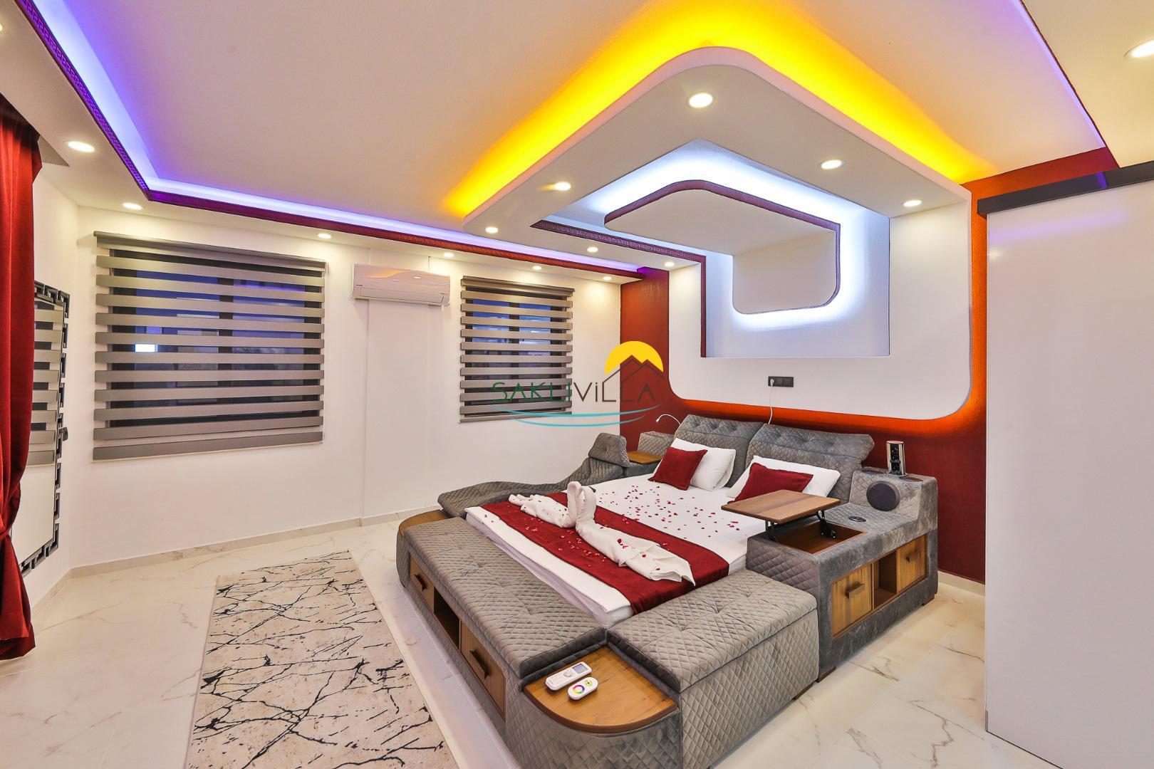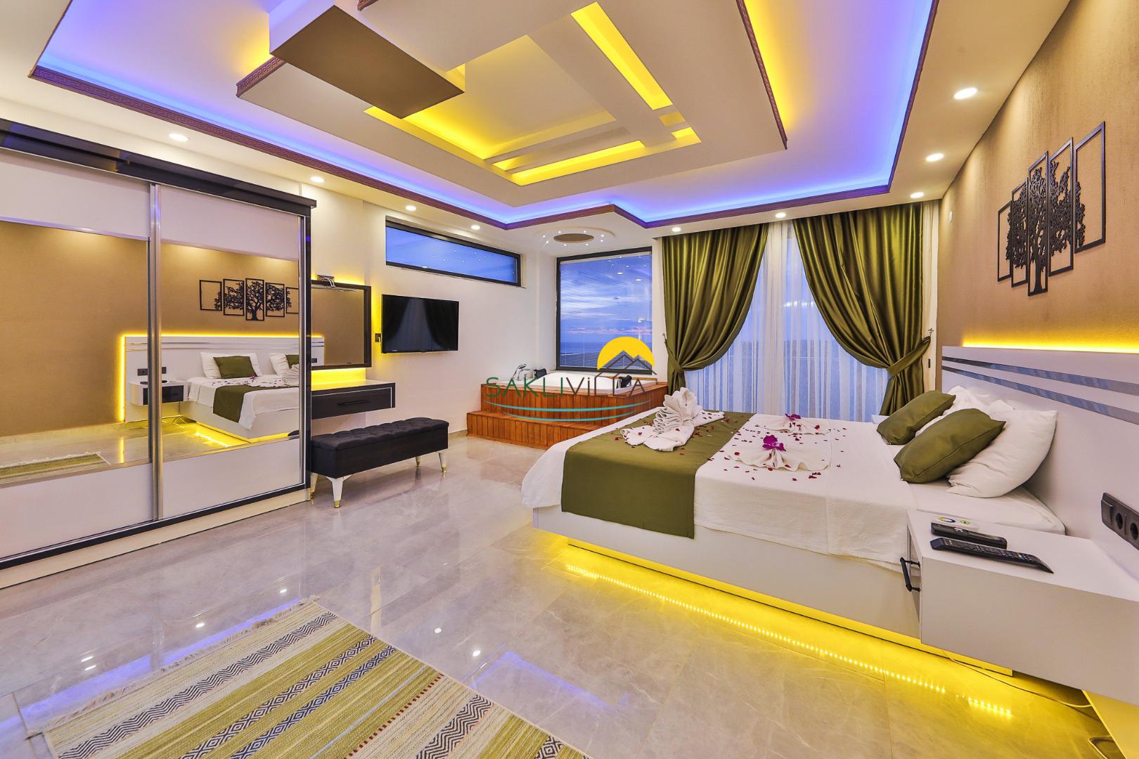 1. Yatak Odası: Süit yatak odası çift kişilik konfor yatak, jakuzi, tv, klima, gardırop, komodin ve banyo-WC yer almaktadır.