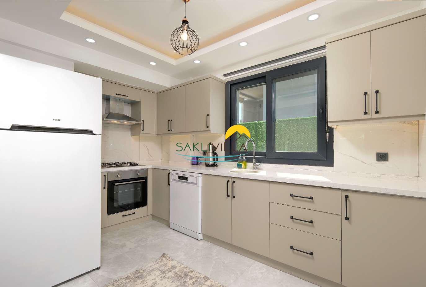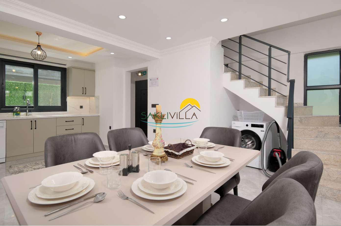 Villa Aras’ın sunduğu bir diğer önemli avantaj ise tam donanımlı mutfağıdır. Modern mutfak ekipmanları ile donatılan bu alan, tatil süresince misafirlerin kendi damak zevklerine uygun yemekler hazırlamasına olanak tanımaktadır. Mutfakta bulunan fırın, ocak, buzdolabı gibi araç gereçlerin yanı sıra, gerekli tüm mutfak eşyaları ve gereçler de temin edilmiştir. Ayrıca, mutfak ile bağlantılı salon alanı, misafirlerin bir arada vakit geçirebilmesini sağlayan sosyal ve samimi bir ortam sunmaktadır.