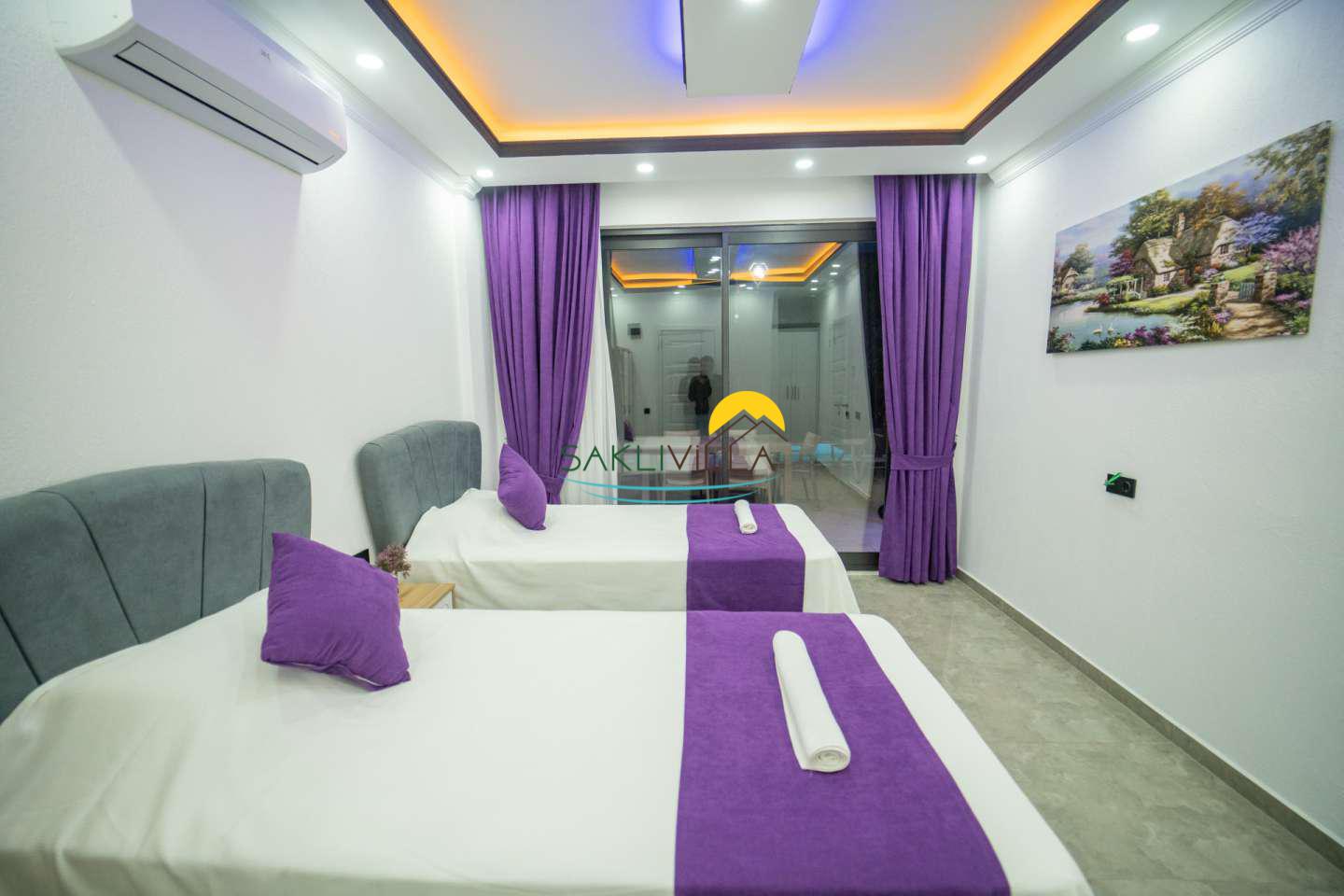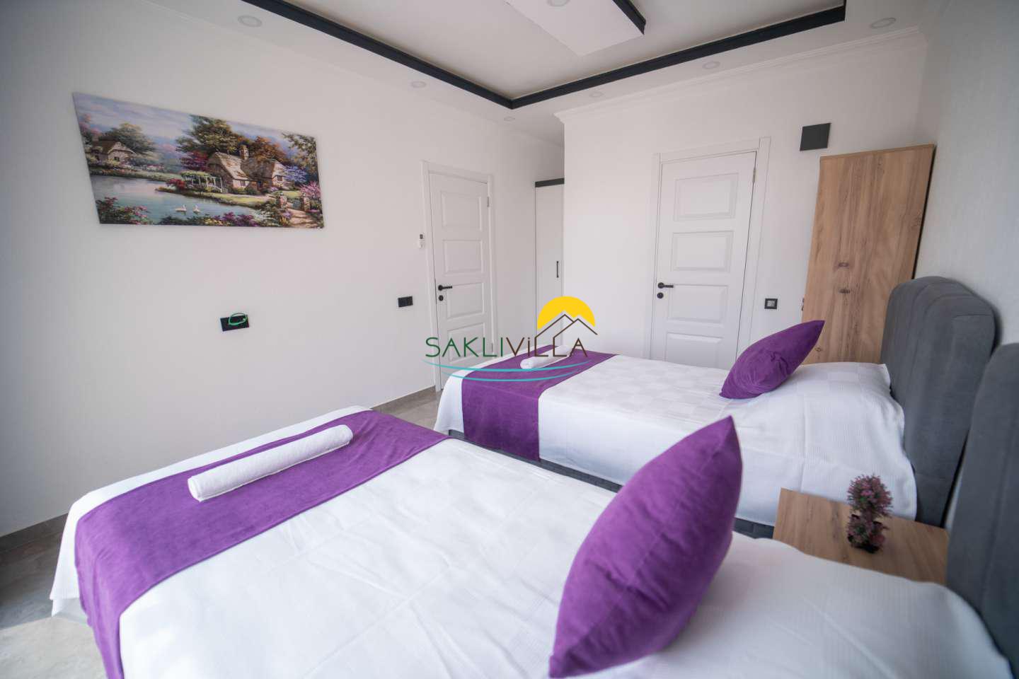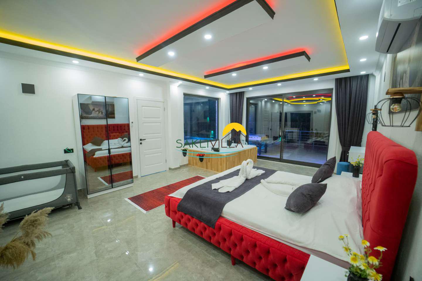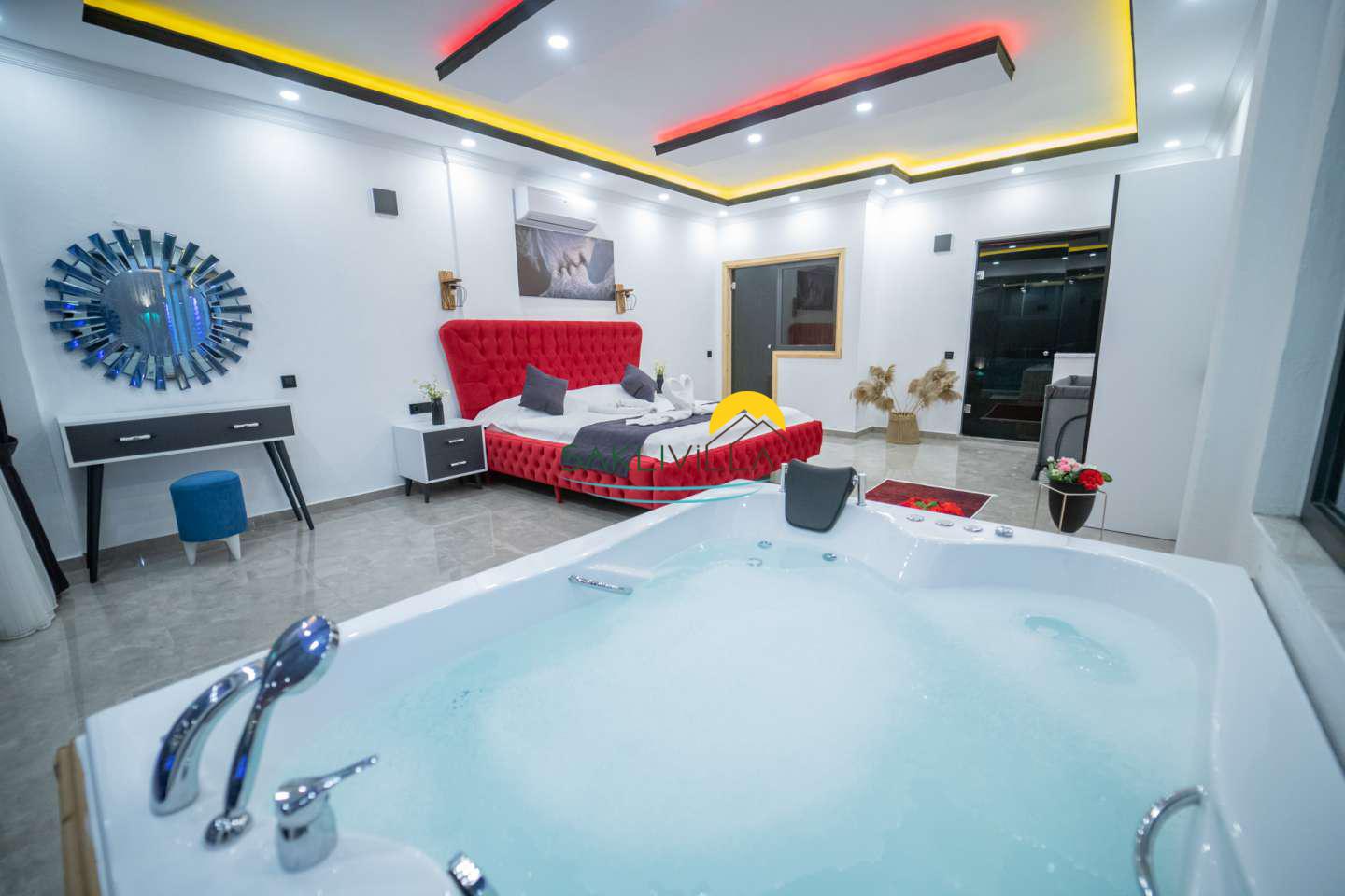Kiralık Villa Aslanbey, 2 yatak odası ile maksimum 4 kişiye kadar konaklama imkânı sağlamakta olup, küçük aileler veya arkadaş grupları için ideal kapasitededir. Yatak odalarındaki konfor unsurları titizlikle düşünülmüş, modern ve şık bir şekilde dizayn edilmiştir. Ebeveyn odasında bulunan çift kişilik jakuziise misafirlere ekstra bir lüks ve rahatlama imkânı tanır. Jakuzi keyfi, hem fiziksel yorgunluğun atılmasına hem de ruhsal anlamda dinlenmeye katkıda bulunarak, tatilin çok daha özel ve unutulmaz geçmesini sağlar.