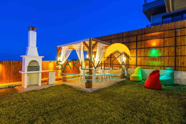 Tatilinizi eğlenceli hale getirmek için bahçesinde salıncak, hamak, mini kaleler gibi ekstra özelliklere ve yeşil bir bahçeye sahiptir.