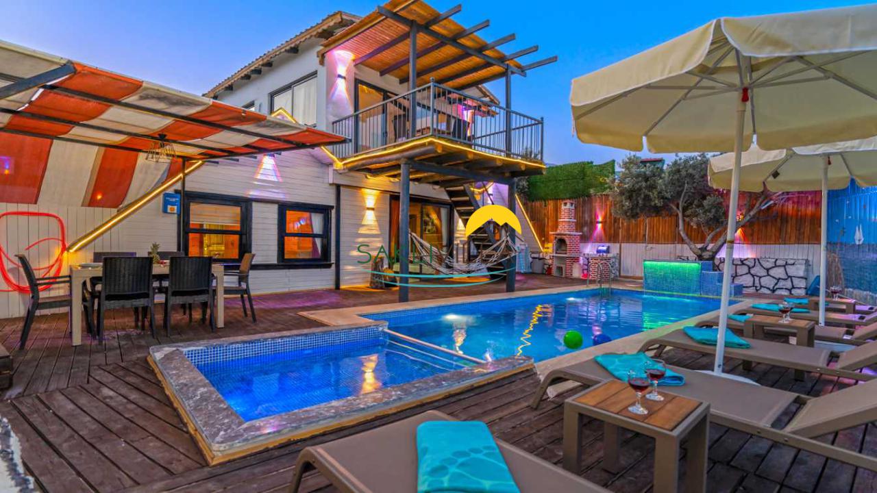 Villamız, özel korunaklı havuzu jakuzileri ve denize olan yakınlığıyla dikkat çekmektedir. 2 ana yatak odasında bulunan jakuziler sayesinde konuklarımızın rahatlamasına olanak tanımaktadır. Ayrıca, villamızda çocuklar için özel olarak tasarlanmış bir oyun alanı, çocuk havuzu ve hatta bir sinema odası da bulunmaktadır. Bu imkanlar sayesinde tüm aile üyeleri için keyifli bir tatil sunmaktadır.