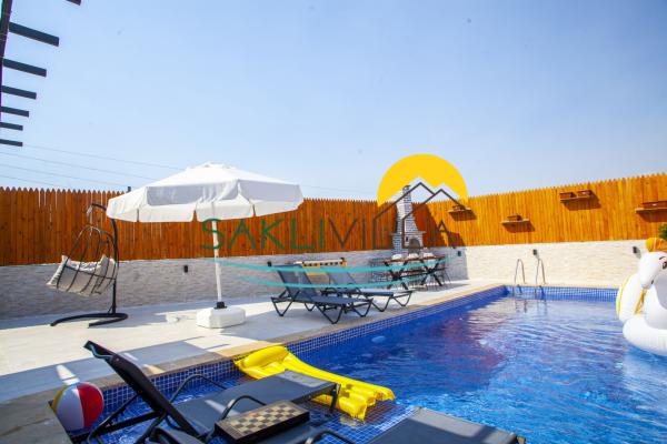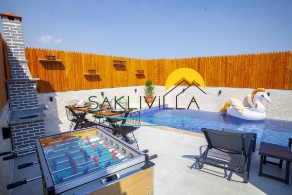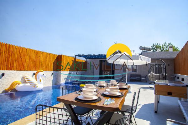 Kiralık Villanın iç mekanında kullanılan kaliteli ve lüks eşyalar, modern bir yaşam alanı sunmanın yanı sıra, misafirlerin konforunu da ön planda tutacak şekilde dizayn edilmiştir. Tüm detaylar en ince ayrıntısına kadar düşünülmüş olup, ziyaretçilerin ihtiyaçlarına yönelik özel olarak tasarlanmıştır. Estetik ve işlevselliği bir arada sunan dekorasyon, tatilin her anını keyifli hale getirmek için titizlikle hazırlanmıştır. Villamızda bulunan jakuzili alan, misafirlerimize güne stres atma ve rahatlama imkanı sunarak, gün sonunda yorgunluklarını giderme fırsatı vermektedir.