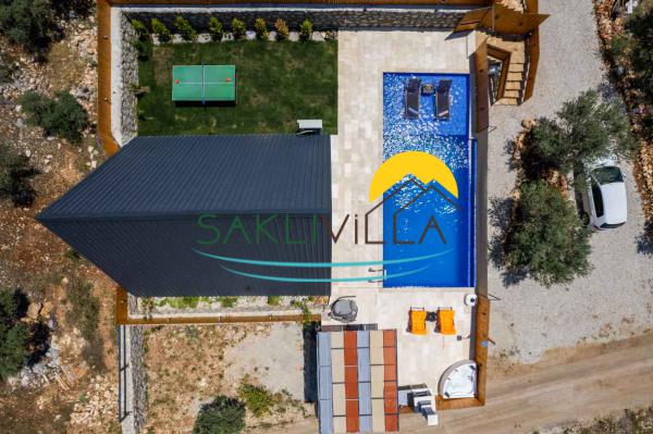 Etrafı tamamen korunaklı hale getirilmiş olup özel havuzlu kiralık villa tatili yapmak isteyenaile ve balayı çiftlerine ideal balayı villasıdır.