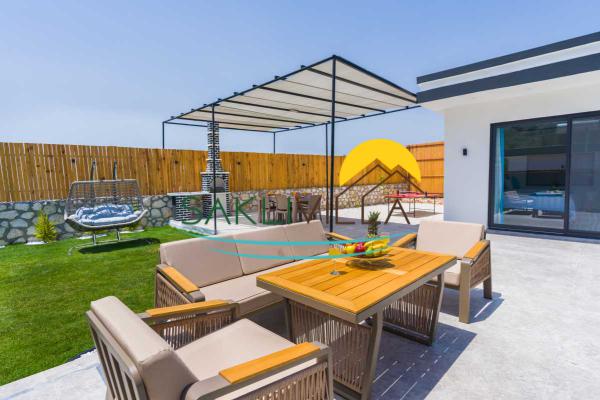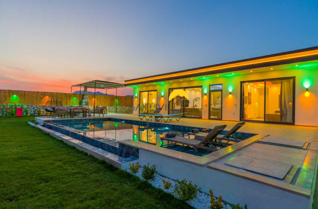 Villa Bella Patara'nın iç mekanları da konfor ve şıklıkla döşenmiştir. Geniş ve ferah bir oturma odası, tam donanımlı bir mutfak, modern bir banyo ve konforlu yatak odalarıyla donatılmıştır. Villanın geniş çim bahçe alanı ise doğanın tadını çıkarmak isteyen konuklar için harika bir seçenektir. Sabahları kuş sesleri eşliğinde kahvaltı yapabilir, akşamları ise güneş batarken manzaranın keyfini çıkarabilirsiniz.
