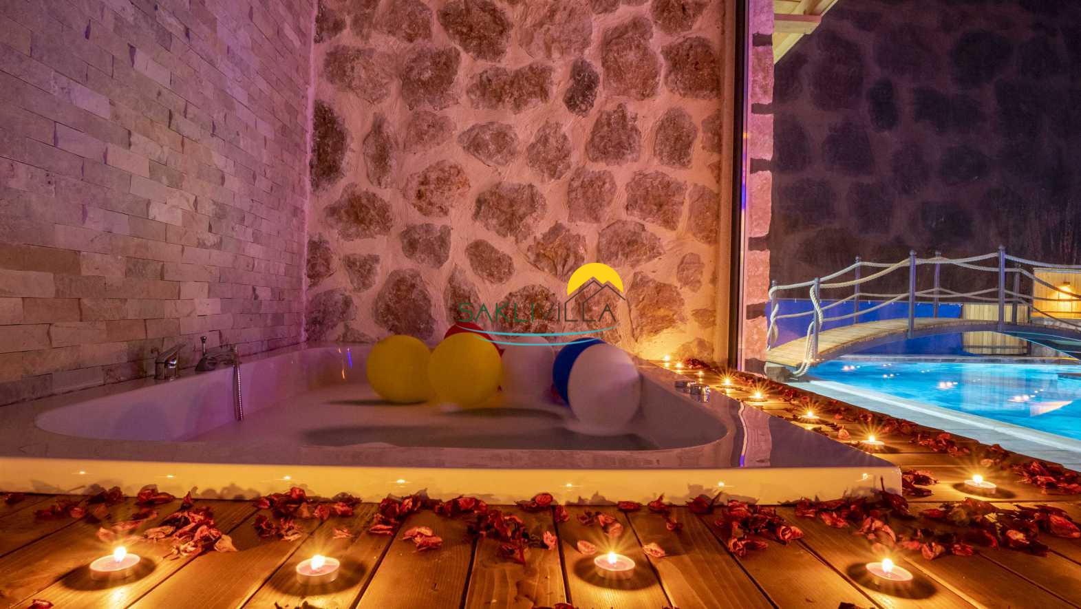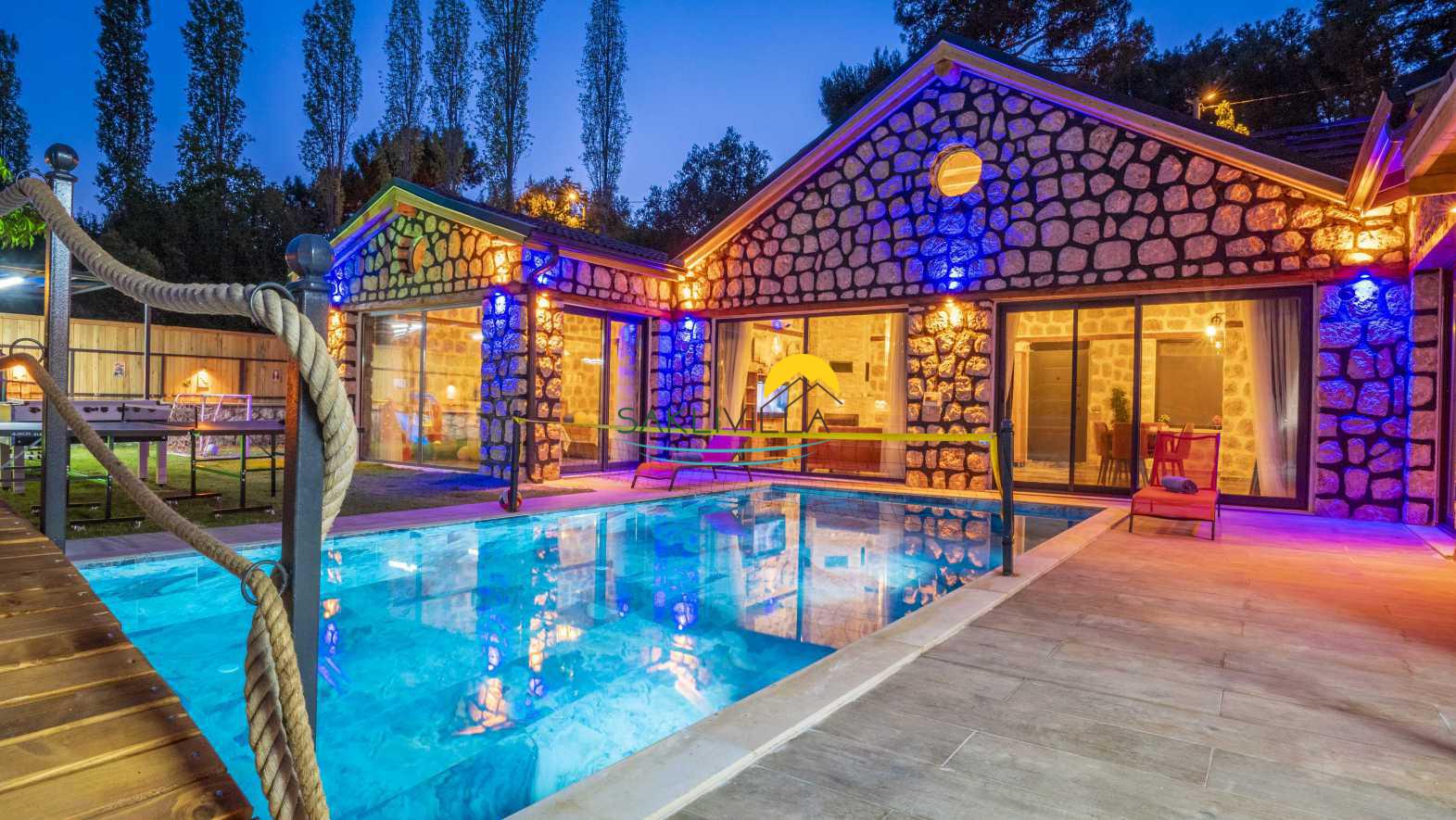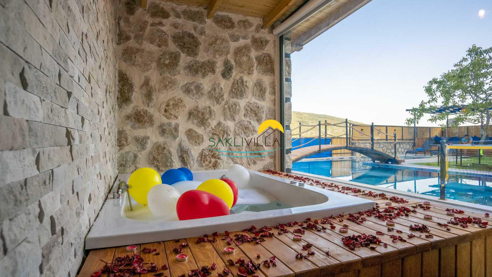 Kiralık Villa BigBoss, geleneksel Türk mimarisinin modern unsurlarla harmanlandığı bir yapıya sahiptir. Taş dış cephe, villaya hem estetik bir görünüm kazandırmakta hem de bölgenin doğal güzellikleri ile uyum sağlamaktadır. Dış mekanın yanı sıra, iç mekanda kullanılan sofistike tasarımlar ve modern eşyalar, tatilinizi daha keyifli hale getirmek için düşünülmüştür. Geniş salon ve mutfak alanları, misafirlerin sosyal etkinliklerini rahatça gerçekleştirmelerine olanak tanırken, odaların büyüklüğü konforu bir üst seviyeye taşımaktadır. Özellikle, odalarda bulunan jakuzi, misafirlerin rahatlaması ve yılın stresini üzerlerinden atması için ideal bir alan sunmaktadır.