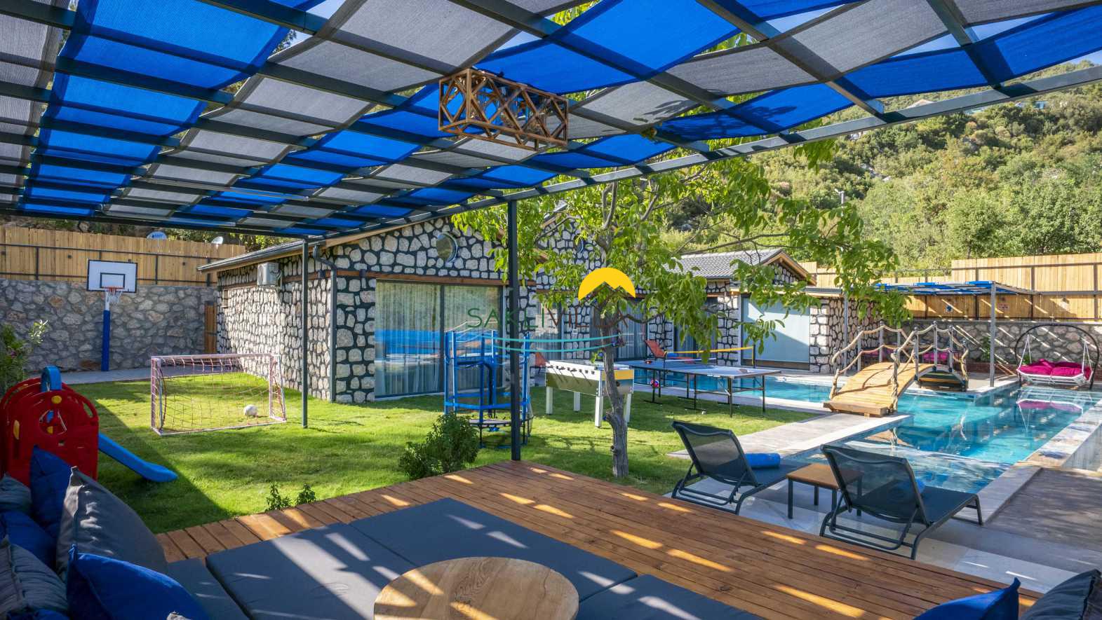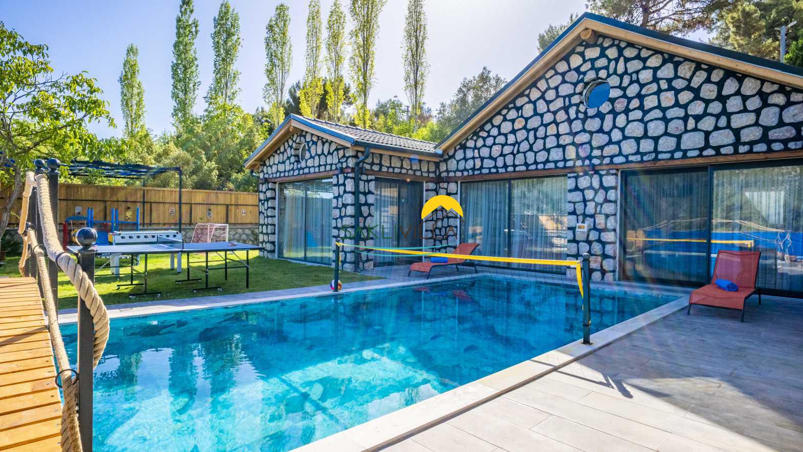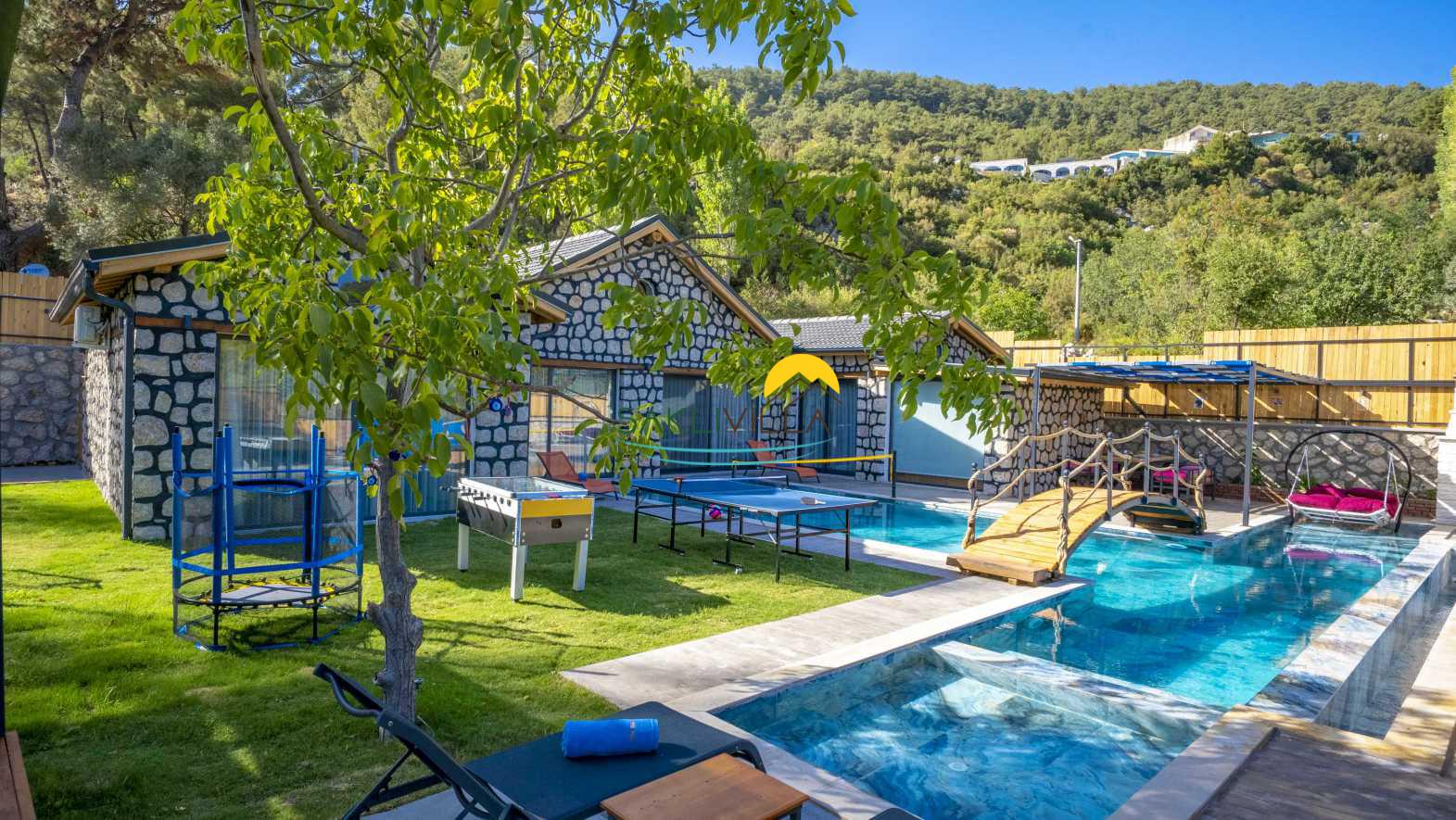 Villa BigBoss, sadece bir konaklama yeri değil, aynı zamanda bir eğlence merkezidir. Geniş bahçesi içinde yer alan özel korunaklı havuzu, villa konuklarına hem serinleme hem de eğlence imkanı sunmaktadır. Havuz terası, geniş alanı, şezlongları ve yemek masası ile ailelerin birlikte keyifli zaman geçirebileceği bir atmosfer sağlamaktadır. Ayrıca, villa bünyesindeki çeşitli eğlence olanakları, özellikle aileler ve balayı çiftleri için büyüleyici bir deneyim sunmaktadır. Masa tenisi, langırt ve oyun parkı gibi aktivitelerle, çocuklarınızın da eğlenceli saatler geçirmesi mümkün olacaktır.