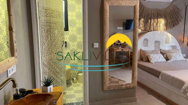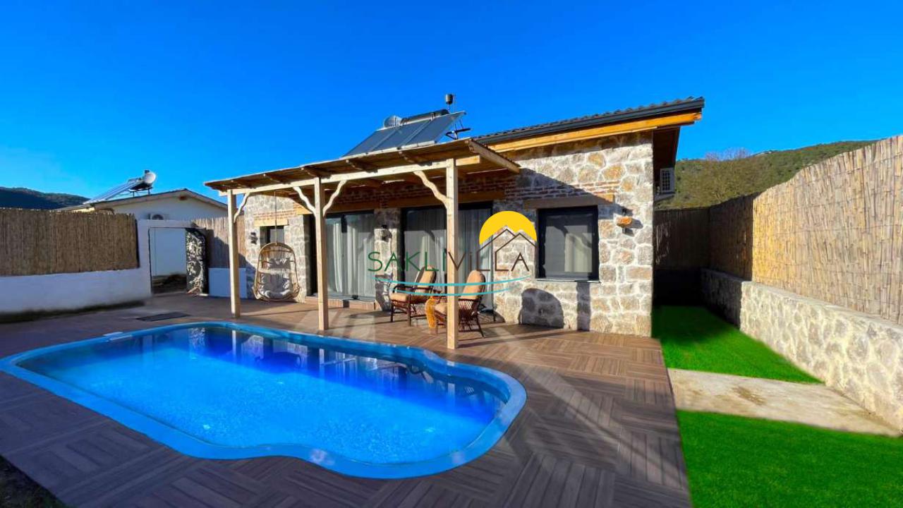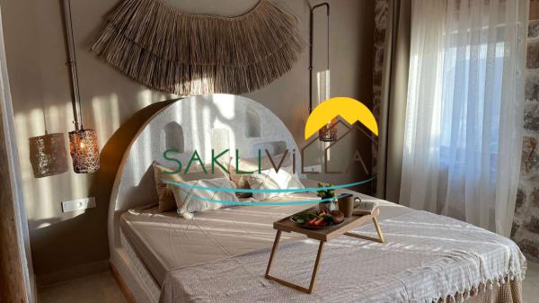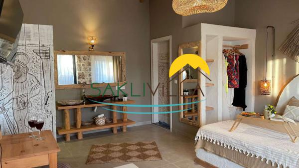 Özellikler: Özel açık yüzme havuzu, güneşlenme alanı, şezlonglar, özel bahçe, özel park yeri ve mangal alanı. 75 m2 1+1 özel korunaklı havuzu olan taş villadır, sedir ağaçlarında imal edilmiş yüksek tavanı ve ardıç ağacından oyulmuş özel lavabosu, 16 jetli jakuzisi ve boheme tasarımı ile ön plana çıkmaktadır.