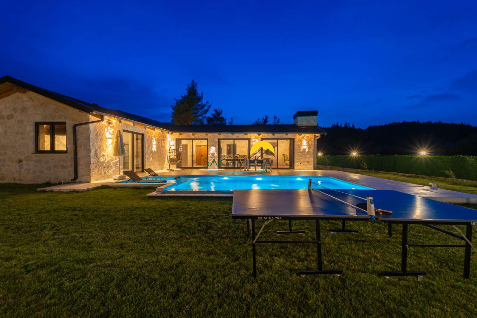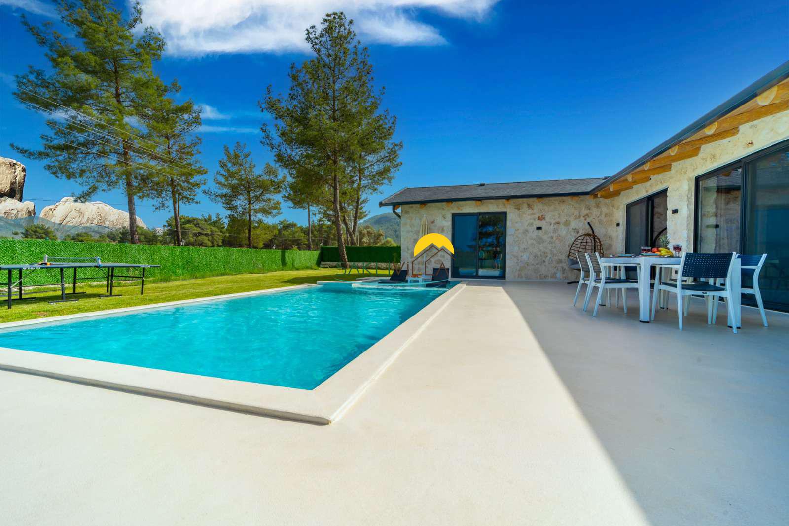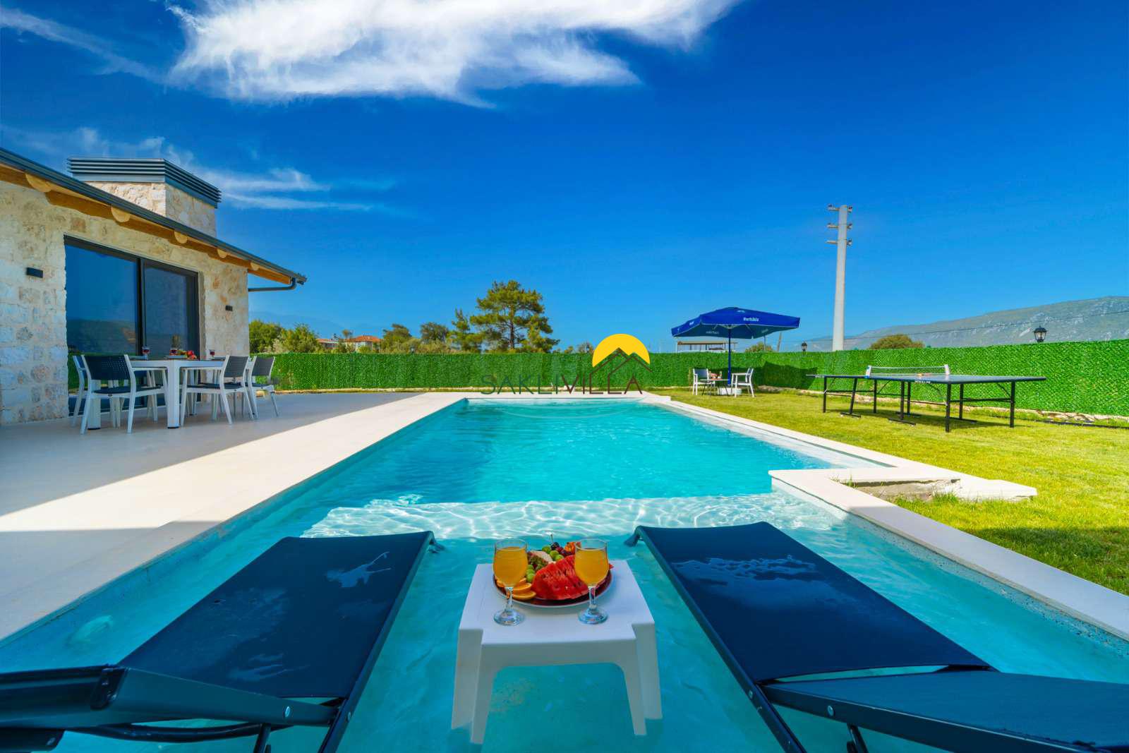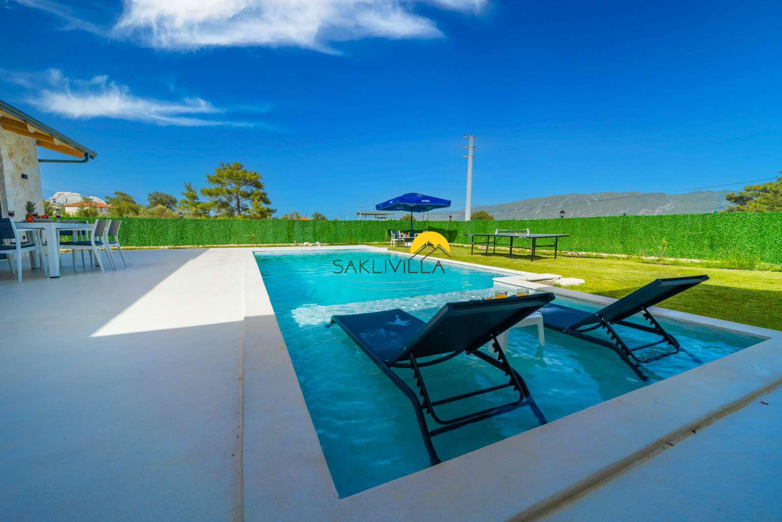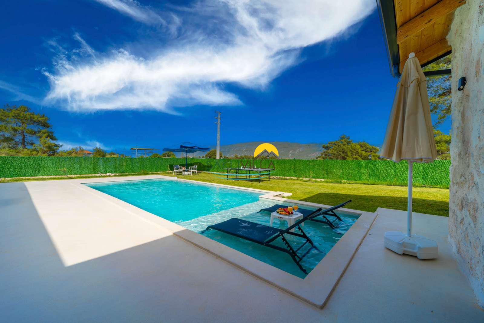 Havuz : Villamızın bahçesi içerisinde 160 cm derinlik, 10 m uzunluk ve 4 m genişlikte korunaklı özel havuz bulunmaktadır. Korunaklı özel açık yüzme havuzu, güneşlenme alanı, şezlonglar, özel bahçe, özel park yeri ve mangal alanı.