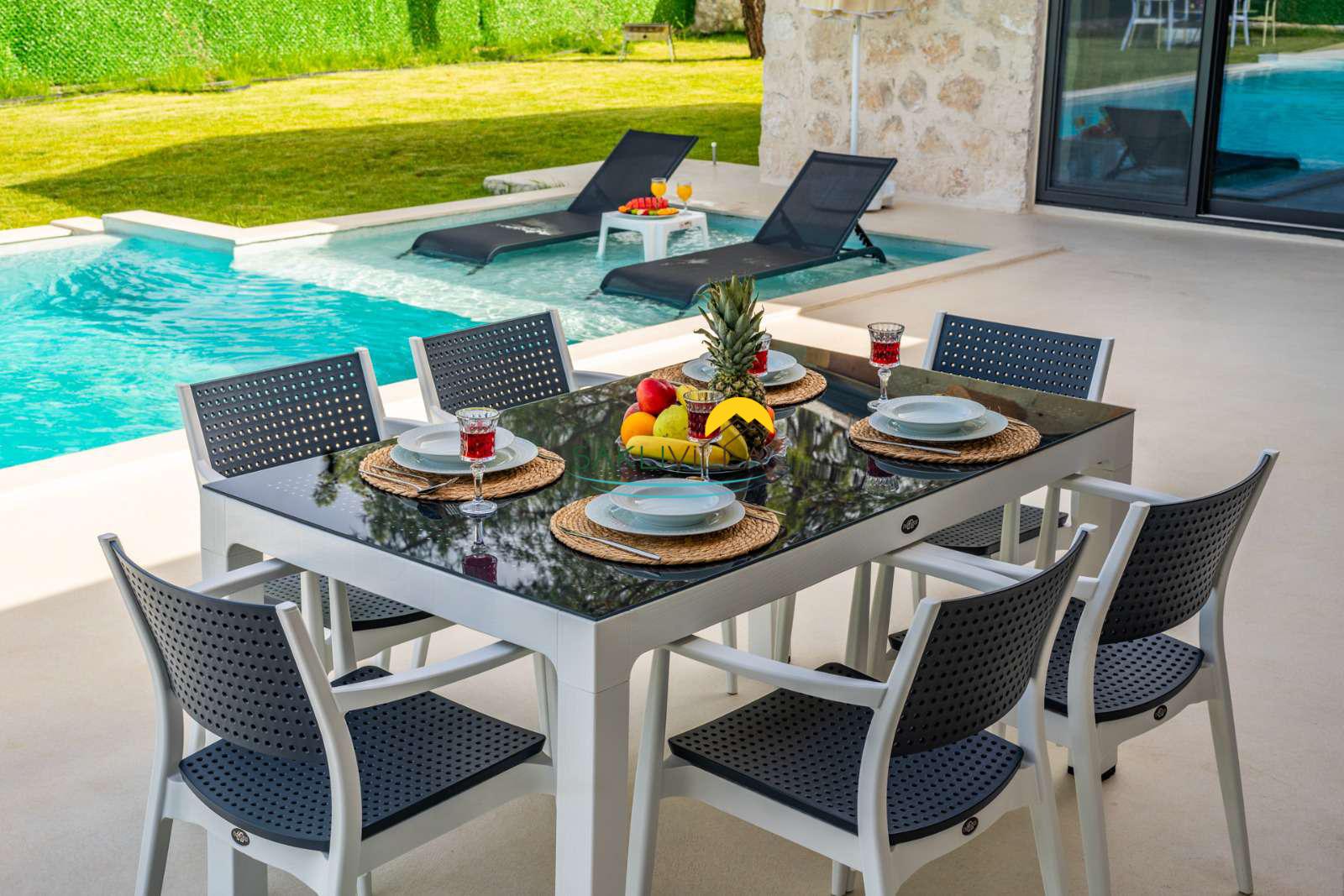 Özel Havuz Alanı: Kiralık Villa Casaba'nın en önemli özelliklerinden biri, özel korunaklı havuzudur. Özellikle muhafazakâr aileler için tasarlanmış olan bu alan, mahremiyetinize büyük bir özen göstermektedir. Havuz başında geçireceğiniz zamanlarda, kendinizi hem dinlenmiş hem de yenilenmiş hissedeceksiniz. Günün yorgunluğunu atmak için şezlonglarda uzanabilir ya da havuzda serinleyebilirsiniz. Gündüzleri güneşin tadını çıkarırken, akşam saatlerinde ise jakuzi keyfi yaparak, günü tamamen unutulmaz bir hale getirebilirsiniz.