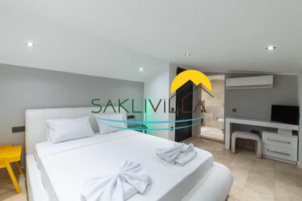 Salon: Salonunda oturma grubu, plazma TV, uydu alıcısı, elektrikli süpürge, ütü ve ütü masası, sehpa, klima ve havuz başına çıkış bulunmaktadır.