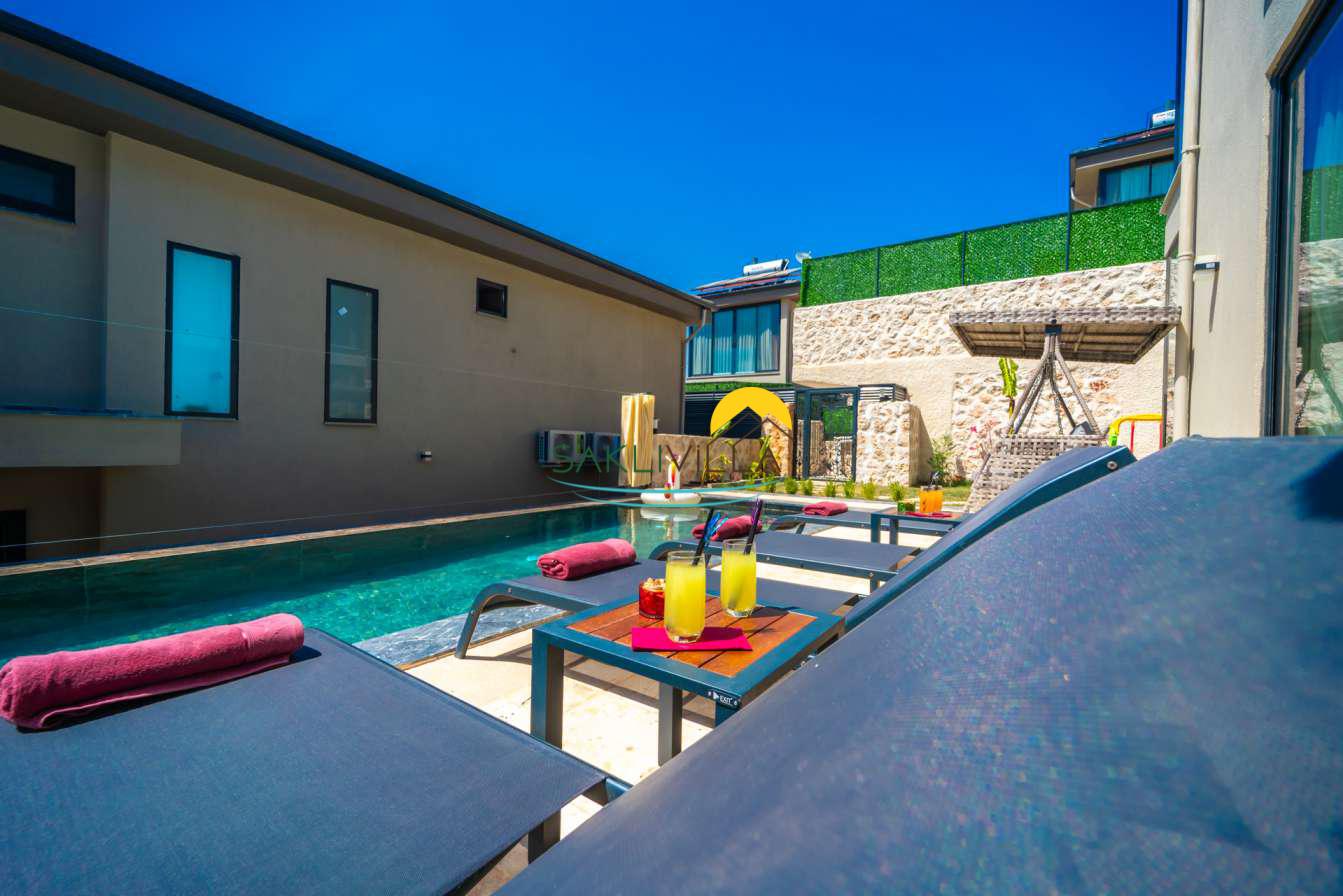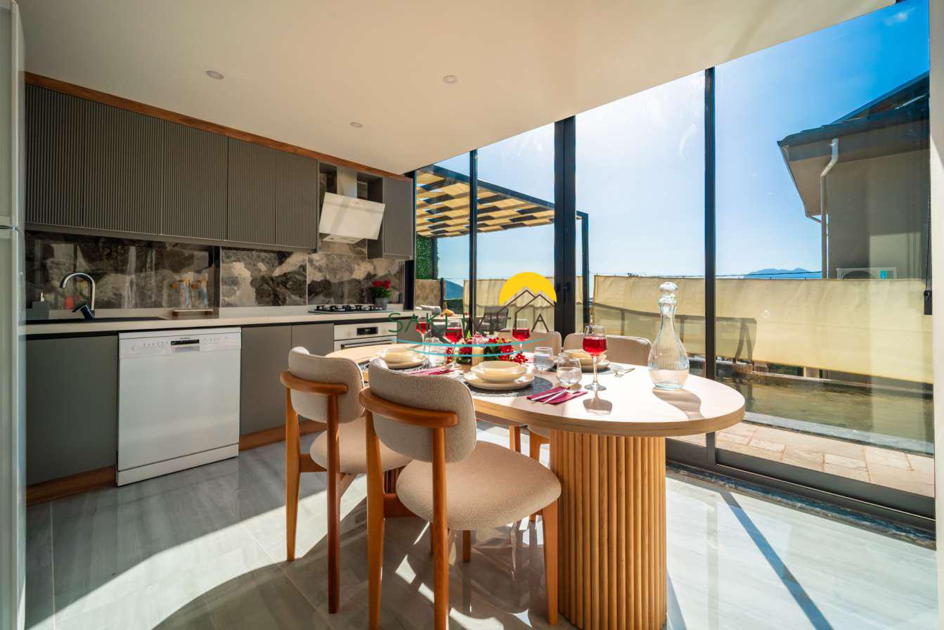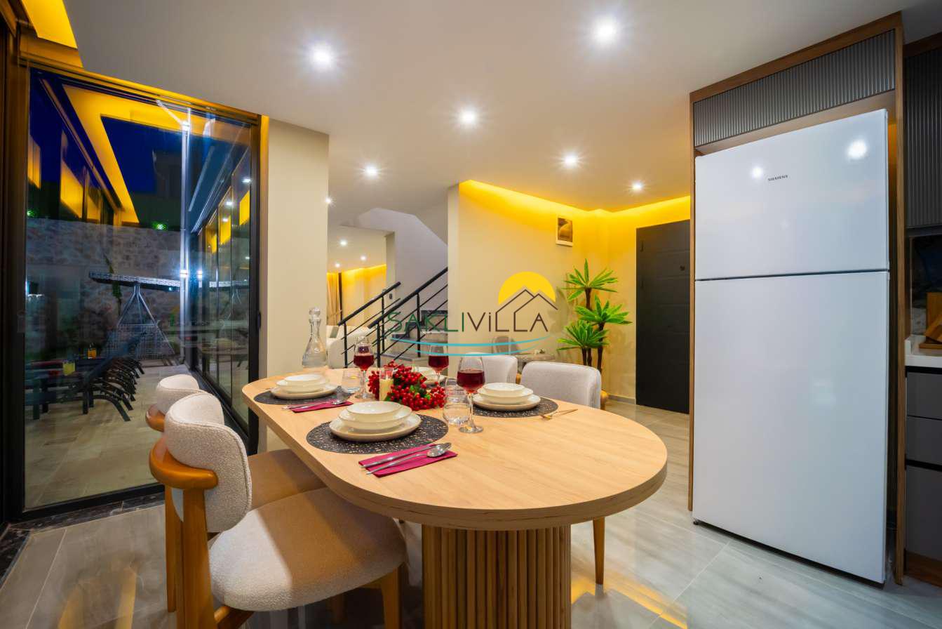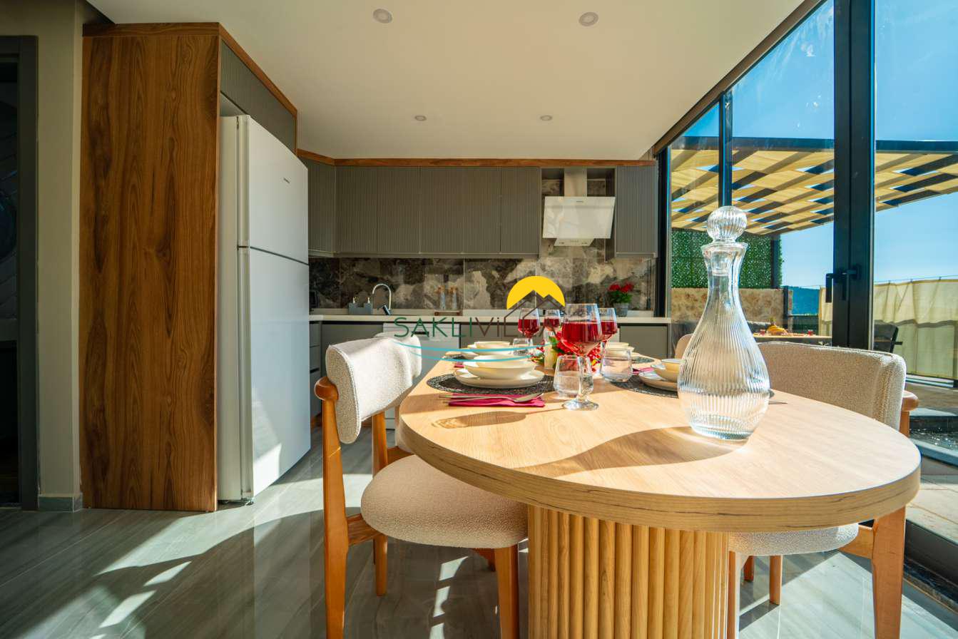 Villa içi mimarisi de göz dolduran özellikler taşımaktadır. Dubleks yapısı ile ferah bir yaşam alanı sunarken, iki yatak odası modern tasarım öğeleriyle döşenmiş ve her türlü konfora uygun olacak şekilde donatılmıştır. Yatak odalarındaki geniş ve rahat yataklar, kaliteli uyku deneyimi sağlamakta ve tatil süresince konukların yenilenmesini mümkün kılmaktadır. Salon ve oturma alanları ise, açık plan yerleşimi sayesinde sosyal etkileşimler ve dinlenme ihtiyacına optimal şekilde cevap vermektedir. Ayrıca, modern mutfak imkanı da konukların villa içerisindeyken kendi yemeklerini hazırlayabilmelerine olanak tanımaktadır.