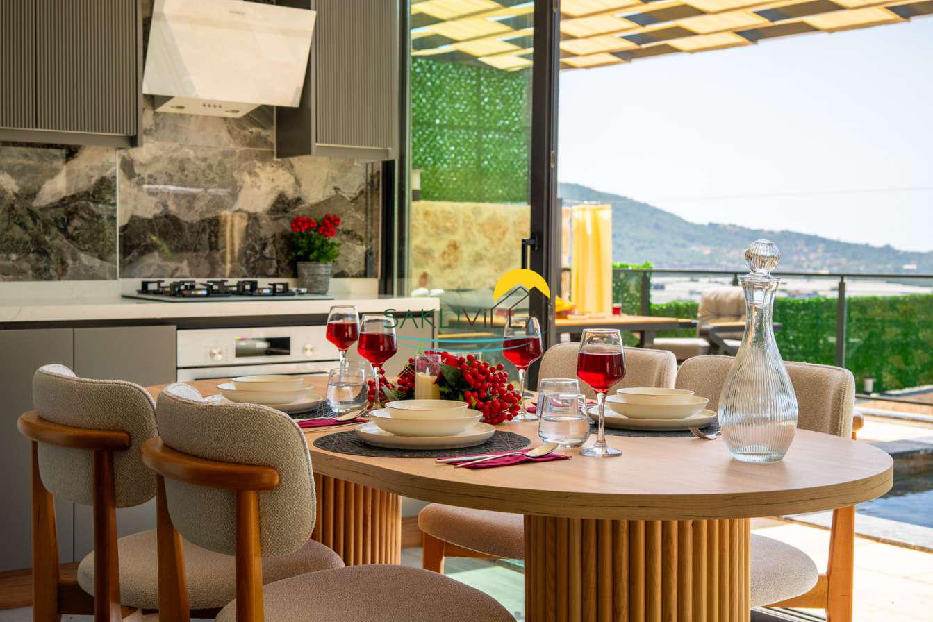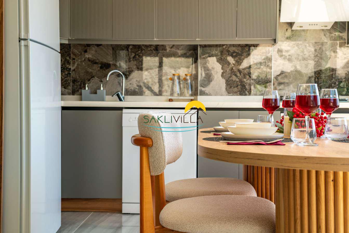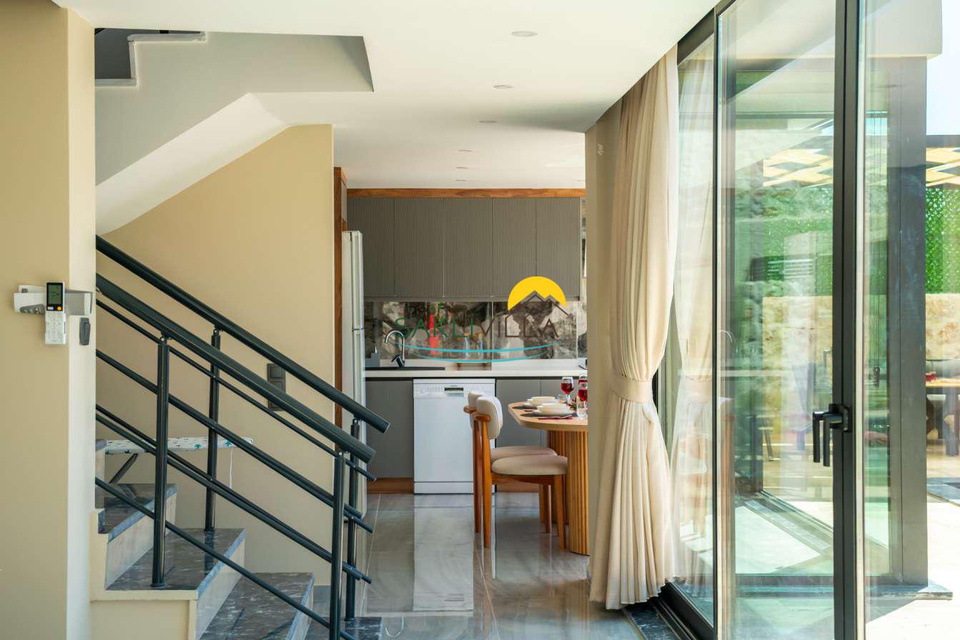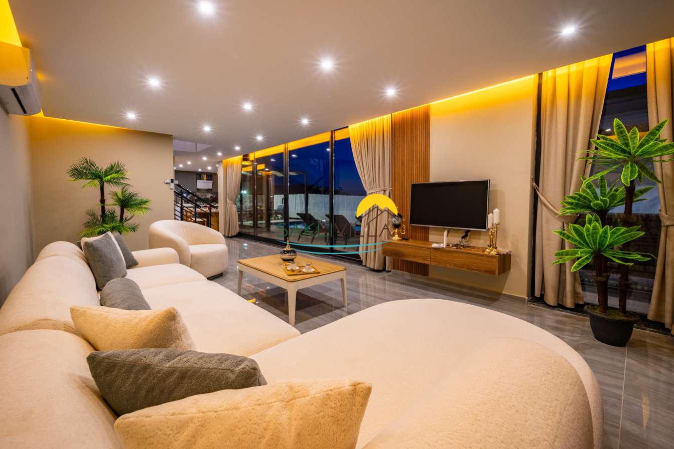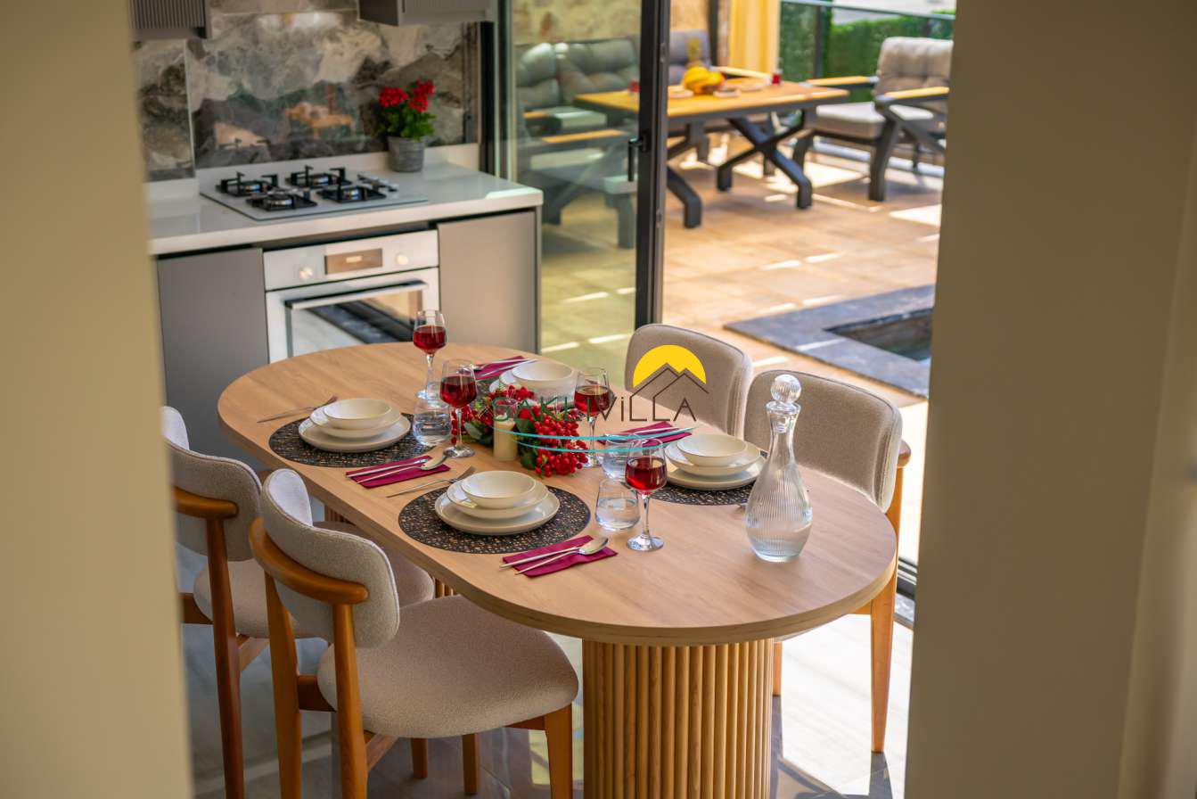 Villa içi mimarisi de göz dolduran özellikler taşımaktadır. Dubleks yapısı ile ferah bir yaşam alanı sunarken, iki yatak odası modern tasarım öğeleriyle döşenmiş ve her türlü konfora uygun olacak şekilde donatılmıştır. Yatak odalarındaki geniş ve rahat yataklar, kaliteli uyku deneyimi sağlamakta ve tatil süresince konukların yenilenmesini mümkün kılmaktadır. Salon ve oturma alanları ise, açık plan yerleşimi sayesinde sosyal etkileşimler ve dinlenme ihtiyacına optimal şekilde cevap vermektedir. Ayrıca, modern mutfak imkanı da konukların villa içerisindeyken kendi yemeklerini hazırlayabilmelerine olanak tanımaktadır.