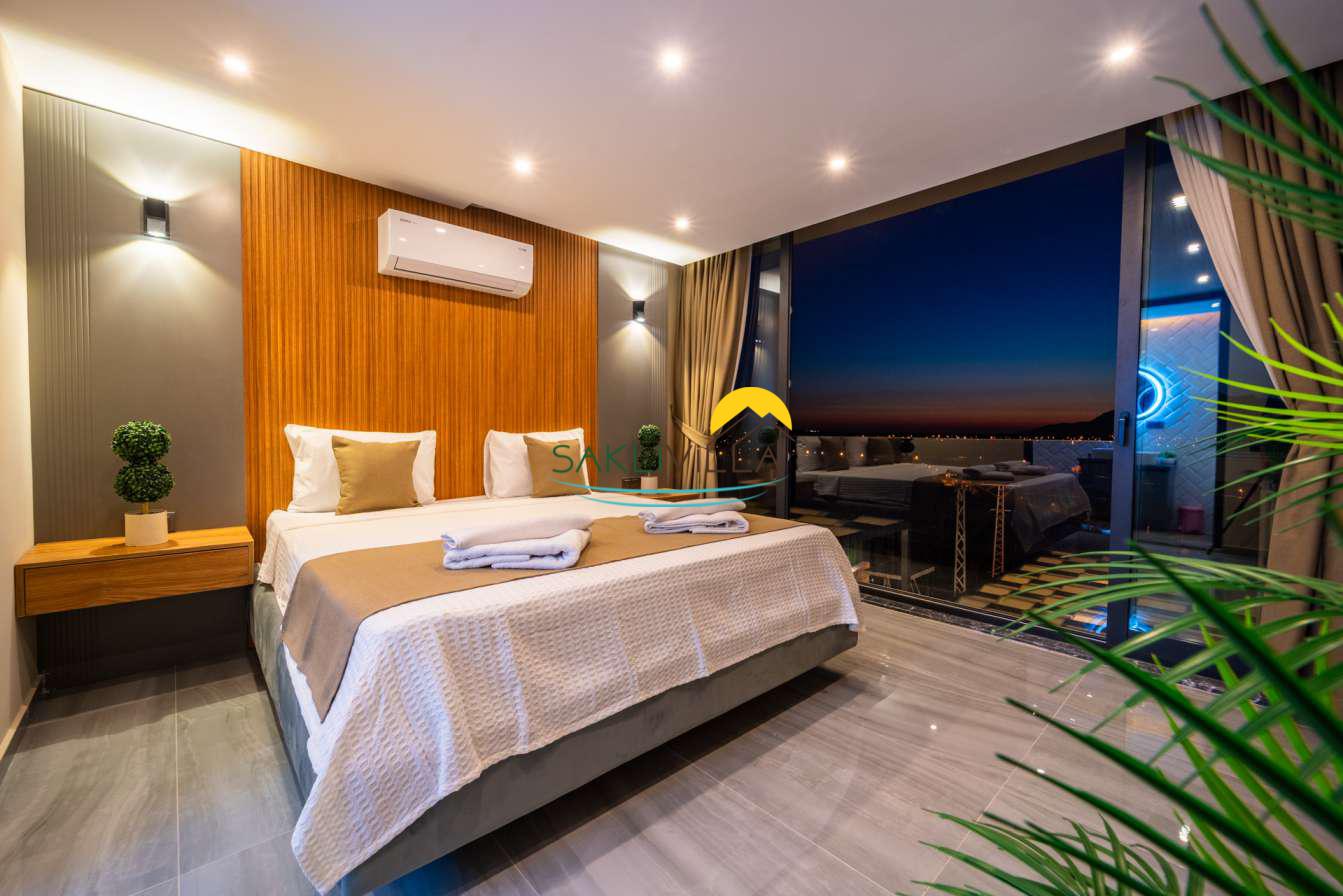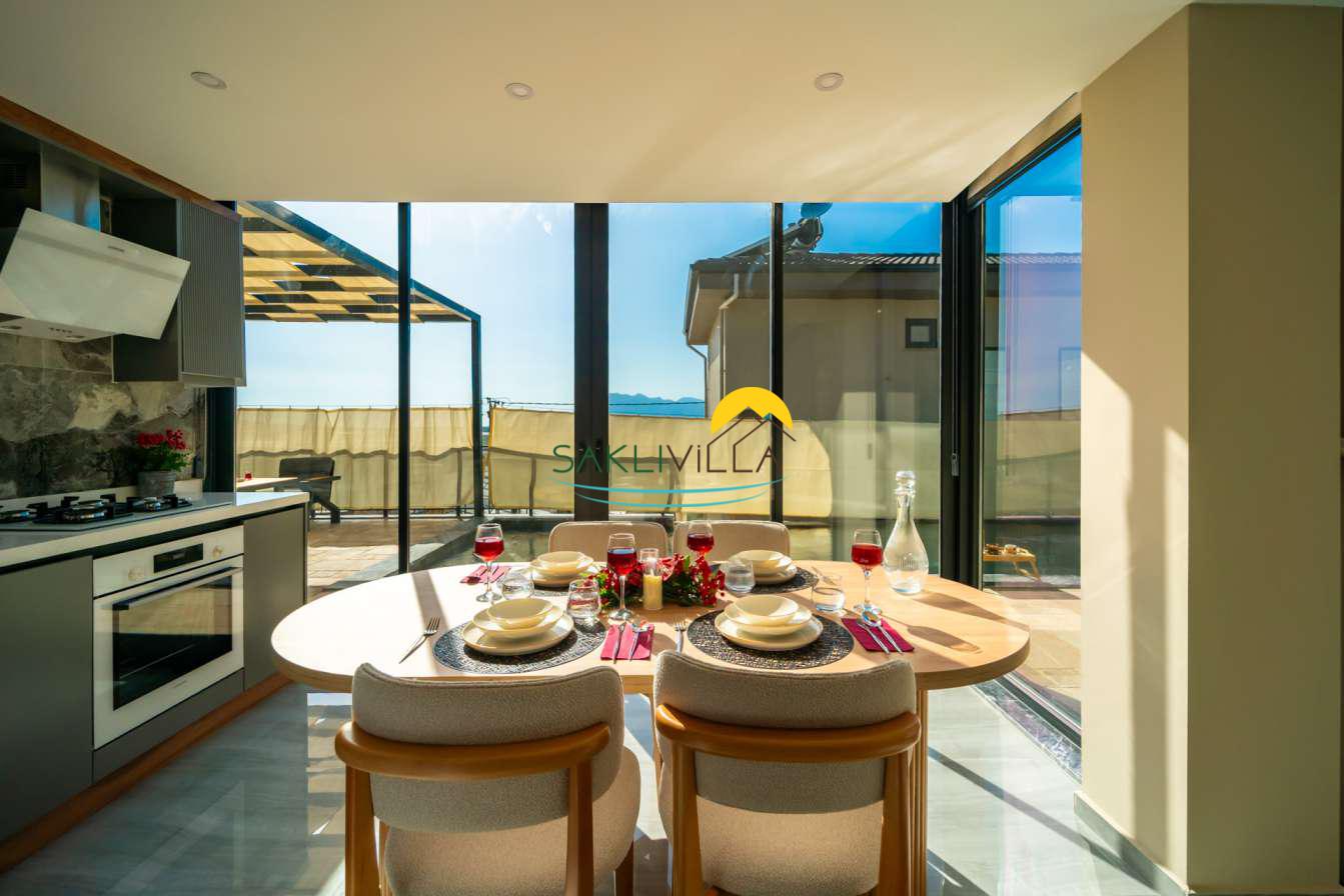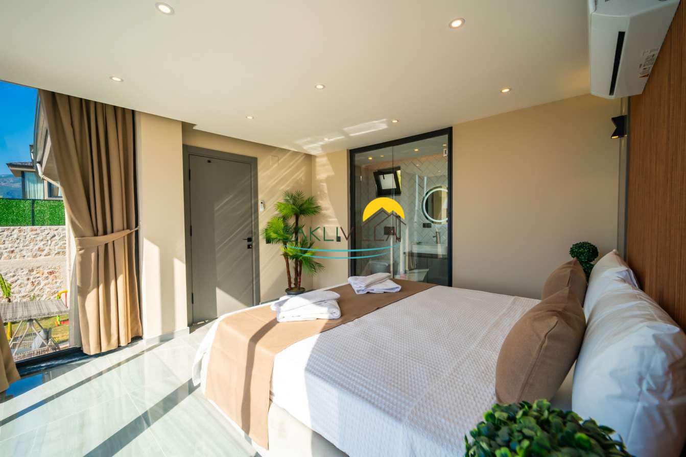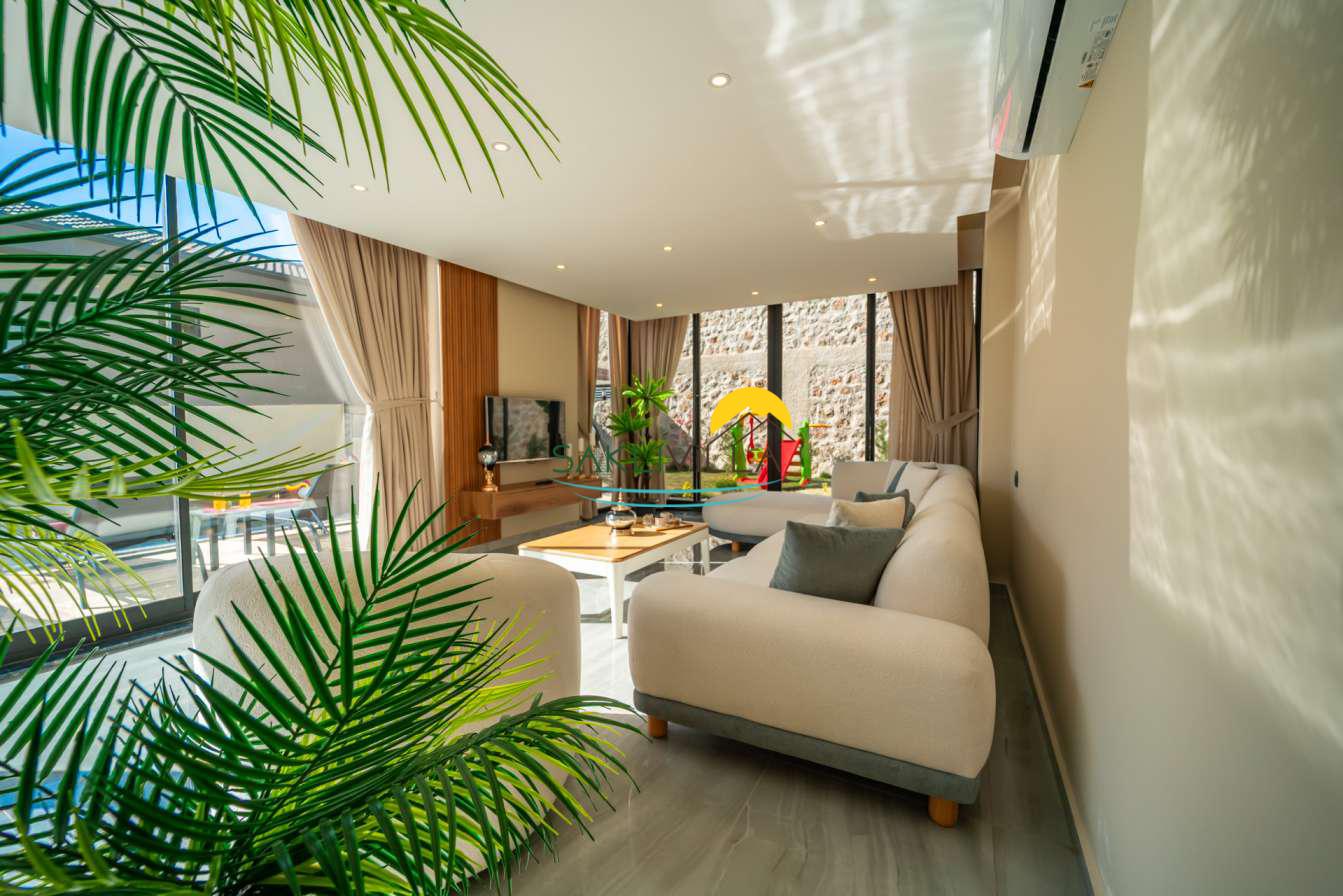 Villa içi mimarisi de göz dolduran özellikler taşımaktadır. Dubleks yapısı ile ferah bir yaşam alanı sunarken, iki yatak odası modern tasarım öğeleriyle döşenmiş ve her türlü konfora uygun olacak şekilde donatılmıştır. Yatak odalarındaki geniş ve rahat yataklar, kaliteli uyku deneyimi sağlamakta ve tatil süresince konukların yenilenmesini mümkün kılmaktadır. Salon ve oturma alanları ise, açık plan yerleşimi sayesinde sosyal etkileşimler ve dinlenme ihtiyacına optimal şekilde cevap vermektedir. Ayrıca, modern mutfak imkanı da konukların villa içerisindeyken kendi yemeklerini hazırlayabilmelerine olanak tanımaktadır.