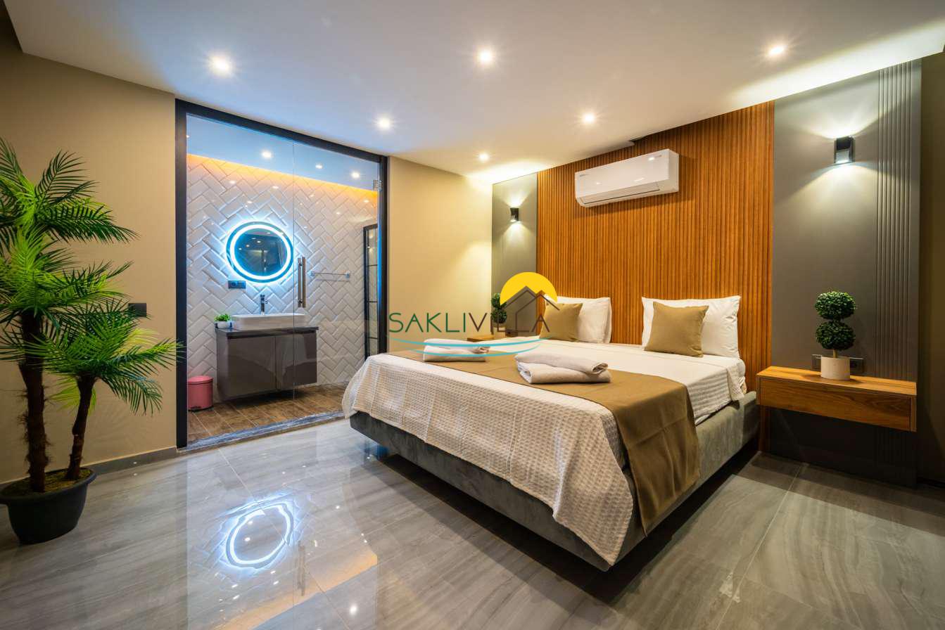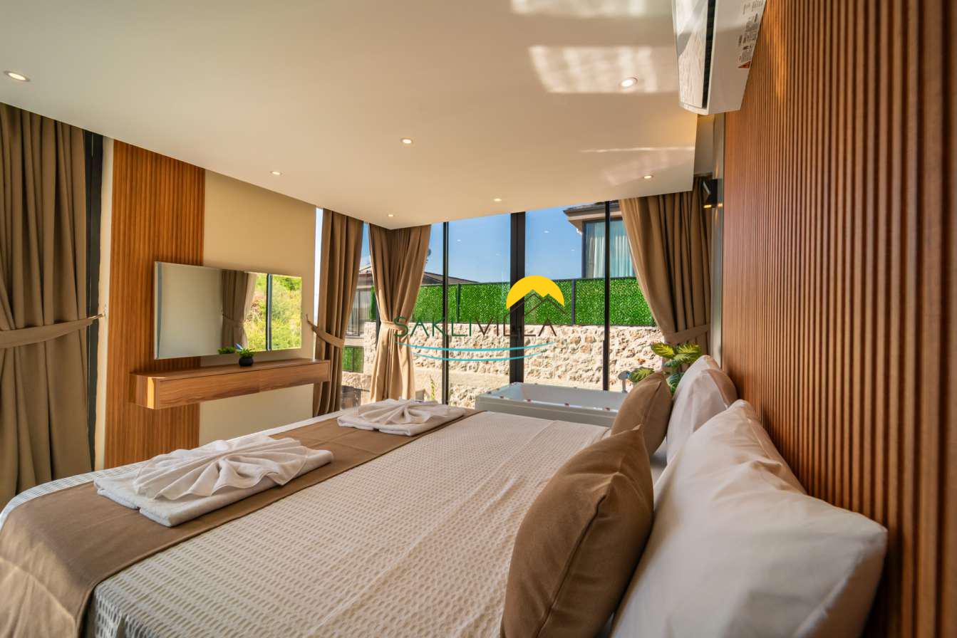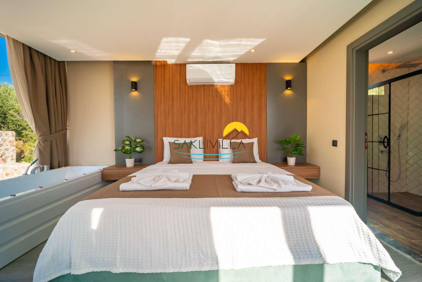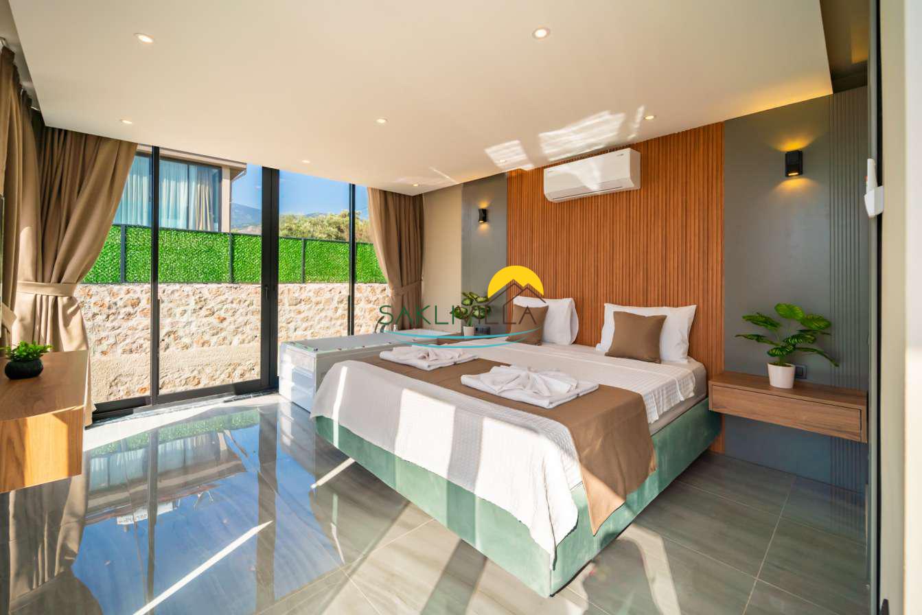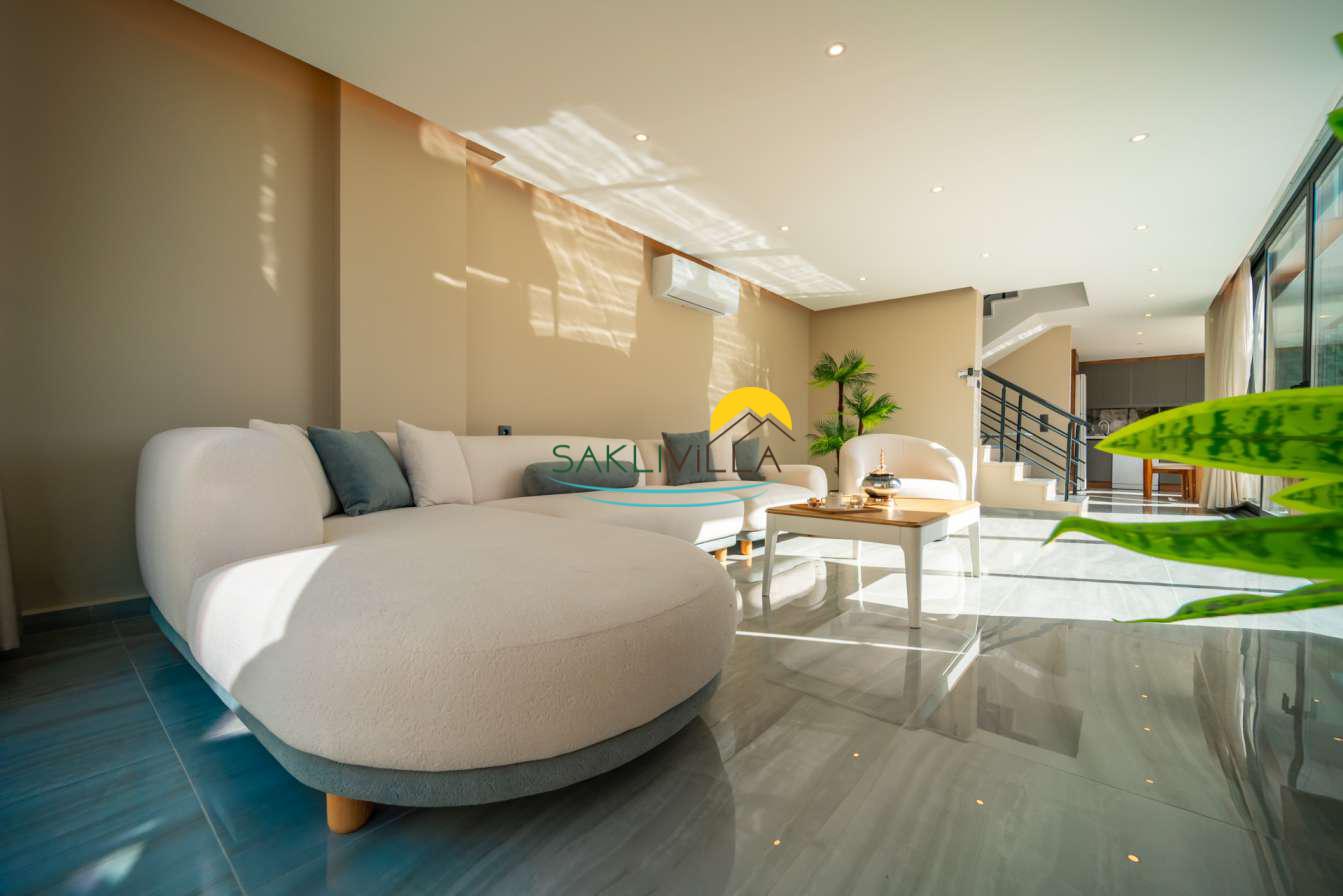 Villa içi mimarisi de göz dolduran özellikler taşımaktadır. Dubleks yapısı ile ferah bir yaşam alanı sunarken, iki yatak odası modern tasarım öğeleriyle döşenmiş ve her türlü konfora uygun olacak şekilde donatılmıştır. Yatak odalarındaki geniş ve rahat yataklar, kaliteli uyku deneyimi sağlamakta ve tatil süresince konukların yenilenmesini mümkün kılmaktadır. Salon ve oturma alanları ise, açık plan yerleşimi sayesinde sosyal etkileşimler ve dinlenme ihtiyacına optimal şekilde cevap vermektedir. Ayrıca, modern mutfak imkanı da konukların villa içerisindeyken kendi yemeklerini hazırlayabilmelerine olanak tanımaktadır.