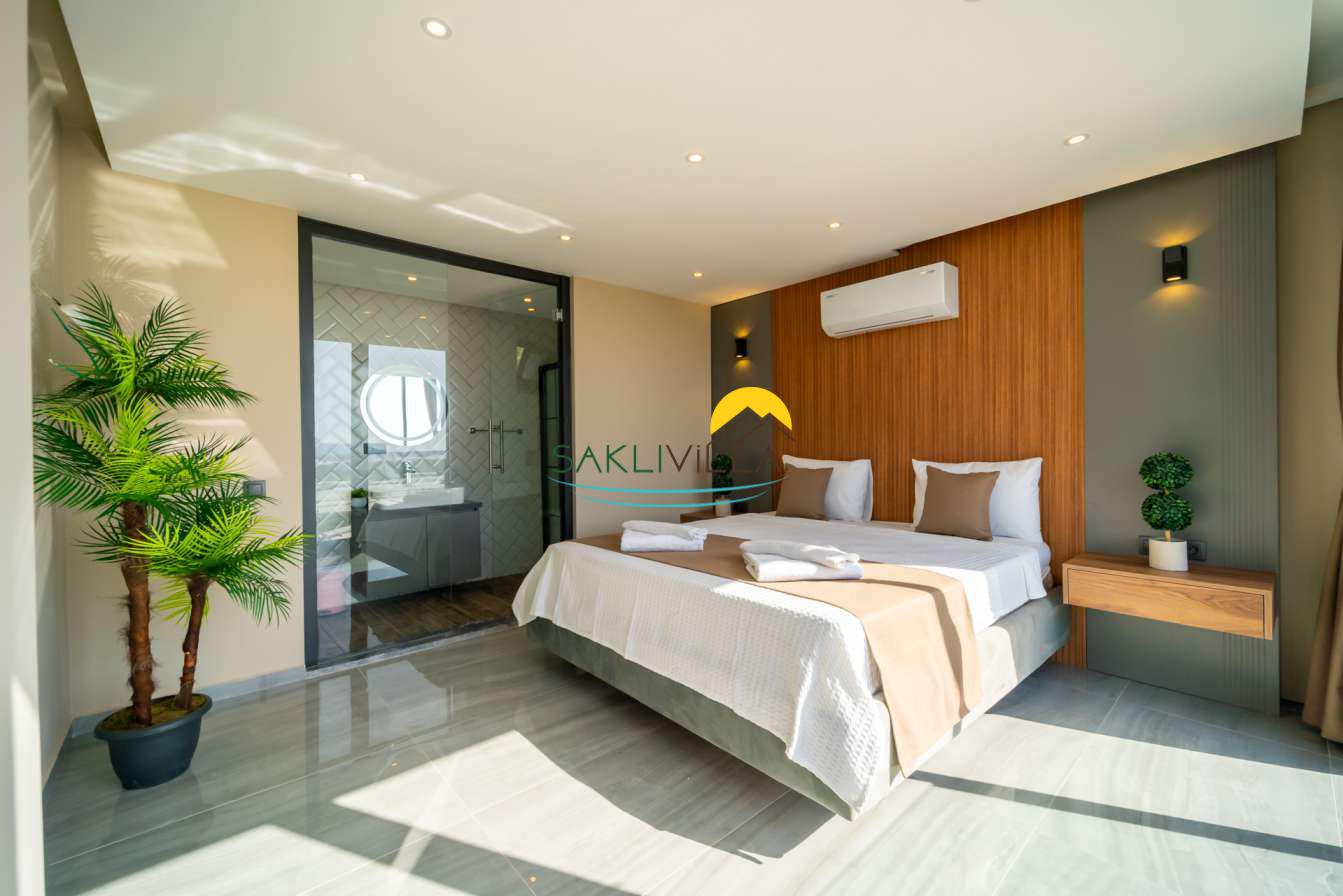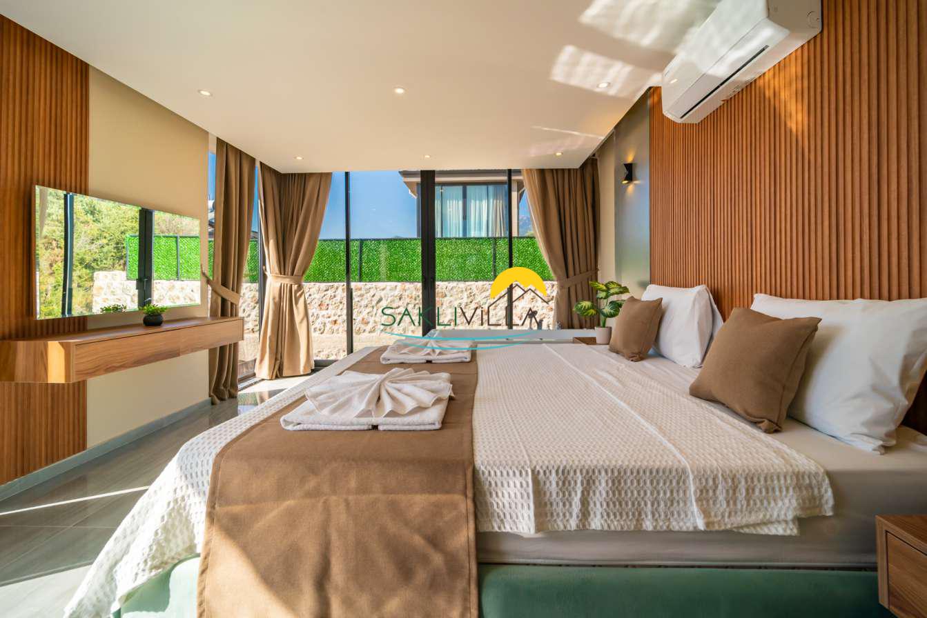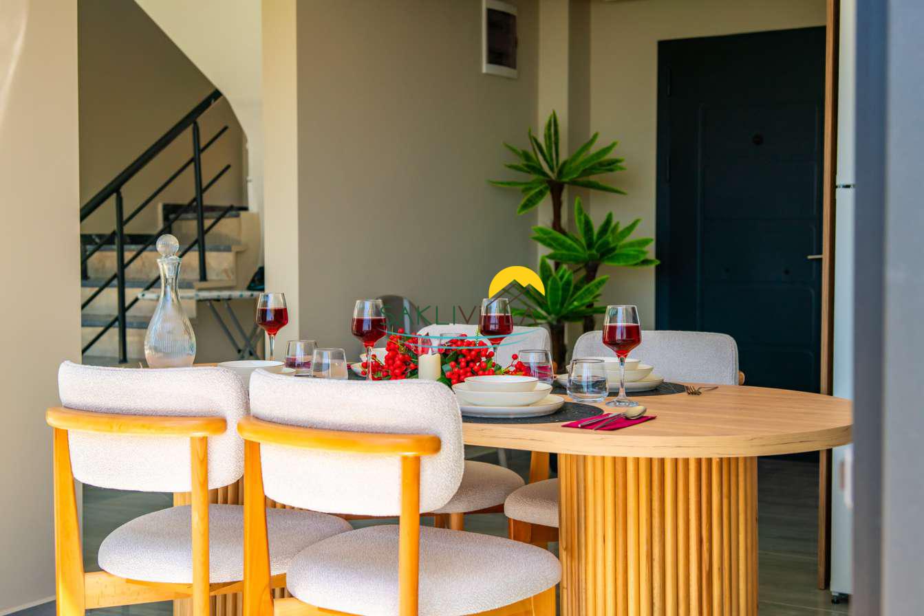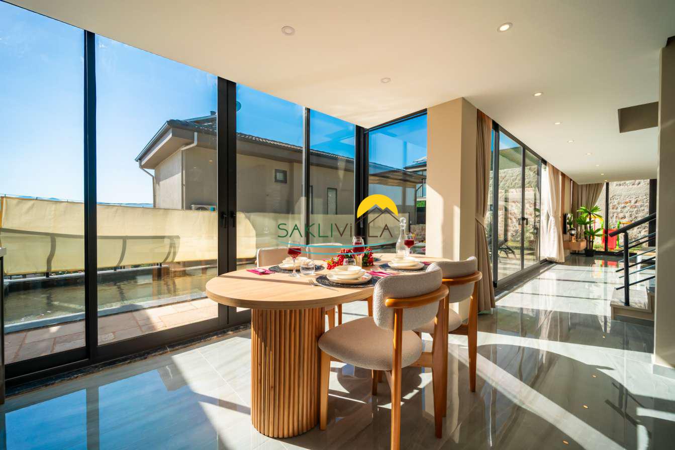 Villa içi mimarisi de göz dolduran özellikler taşımaktadır. Dubleks yapısı ile ferah bir yaşam alanı sunarken, iki yatak odası modern tasarım öğeleriyle döşenmiş ve her türlü konfora uygun olacak şekilde donatılmıştır. Yatak odalarındaki geniş ve rahat yataklar, kaliteli uyku deneyimi sağlamakta ve tatil süresince konukların yenilenmesini mümkün kılmaktadır. Salon ve oturma alanları ise, açık plan yerleşimi sayesinde sosyal etkileşimler ve dinlenme ihtiyacına optimal şekilde cevap vermektedir. Ayrıca, modern mutfak imkanı da konukların villa içerisindeyken kendi yemeklerini hazırlayabilmelerine olanak tanımaktadır.