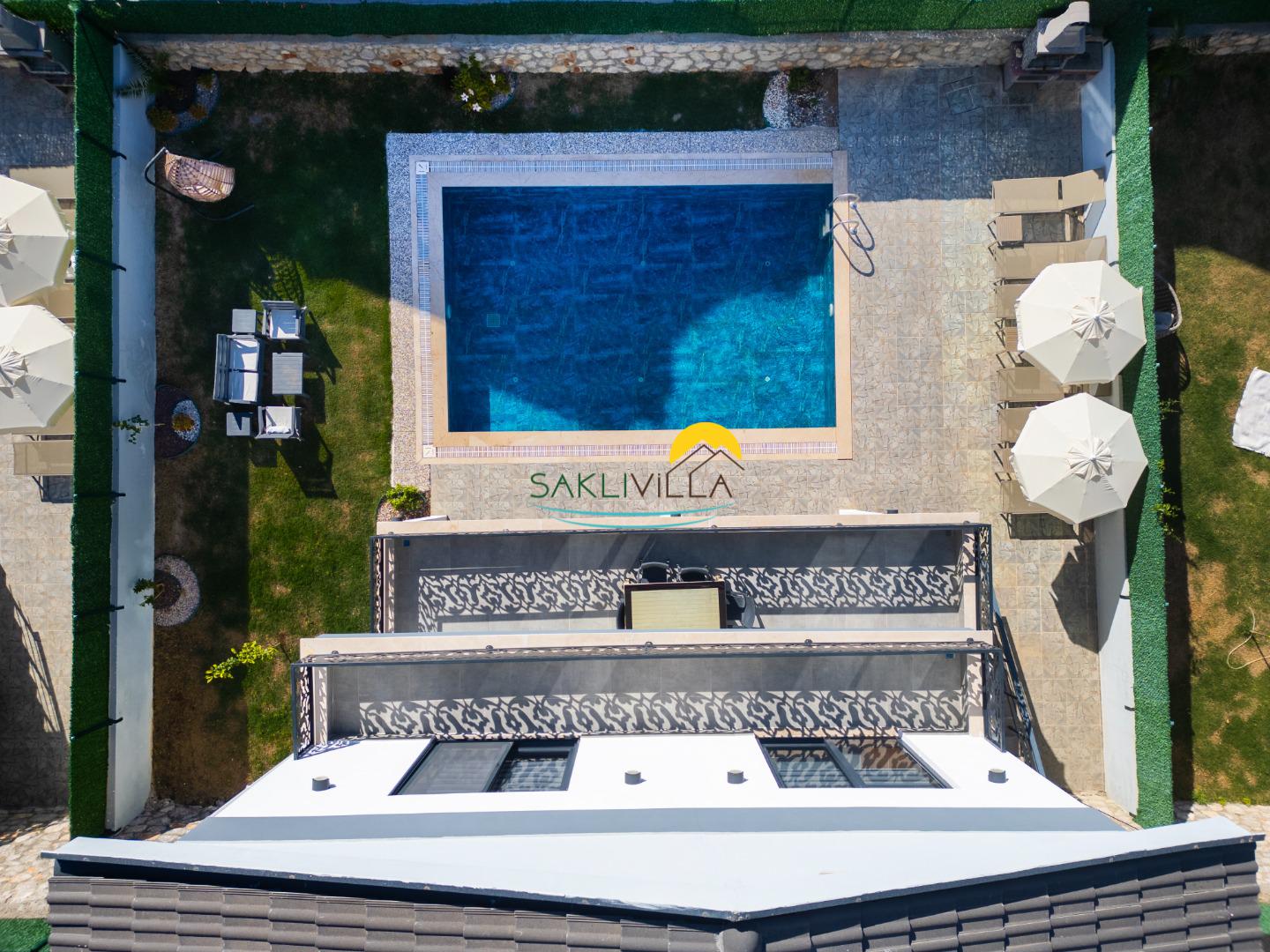 Havuz Terası:Tamamen villaya ait olan havuz çevresinde konaklayacak kişi sayısına yeterli şezlong ve şemsiye bulunmaktadır.