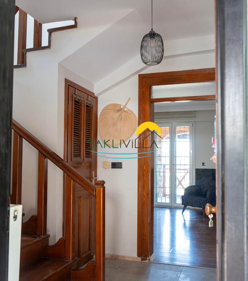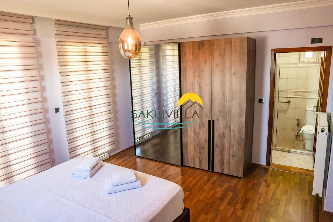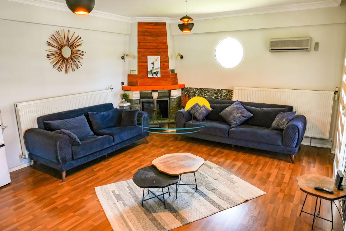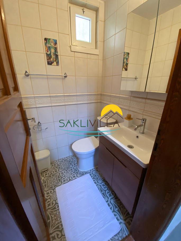 Kiralık villanın iç mekanları, konfor ve estetik anlayışıyla titizlikle düzenlenmiştir. Geniş ve ferah salon, modern oturma grubu, klima, LCD TV, uydu alıcısı ve kablosuz internet erişimi gibi olanaklarla donatılmıştır. Şık yemek masası ve sandalyeler, keyifli akşam yemekleri için ideal bir ortam sunarken, taş duvarların sunduğu doğal serinlik, gün boyu süren aktivitelerin ardından rahatlamanıza olanak tanır. Salon, hem dinlenmek hem de sevdiklerinizle vakit geçirmek için mükemmel bir alan olarak tasarlanmıştır.