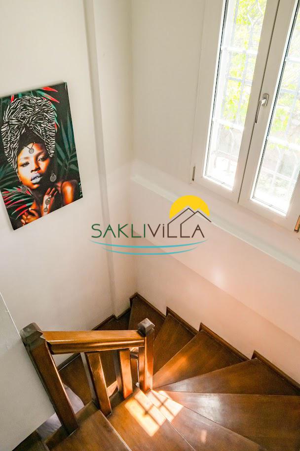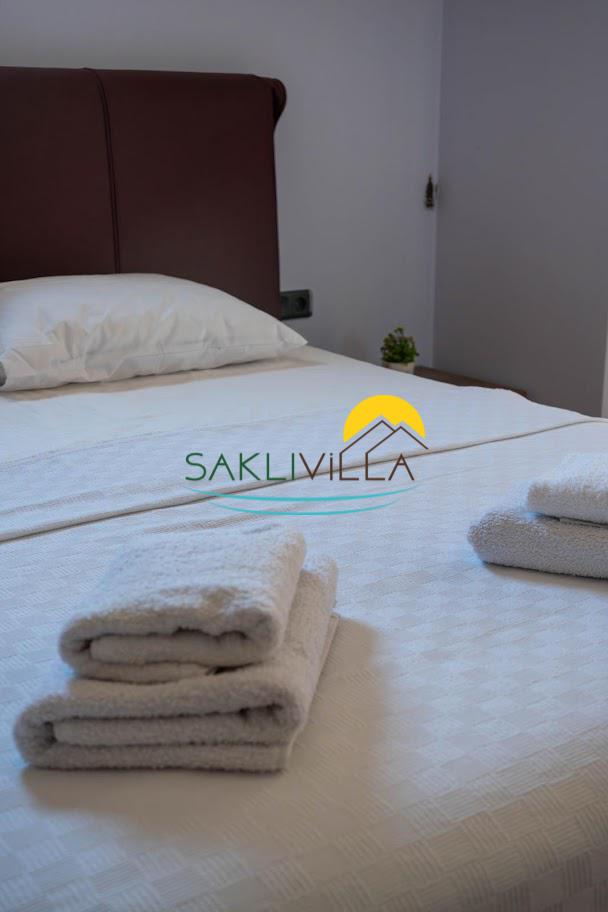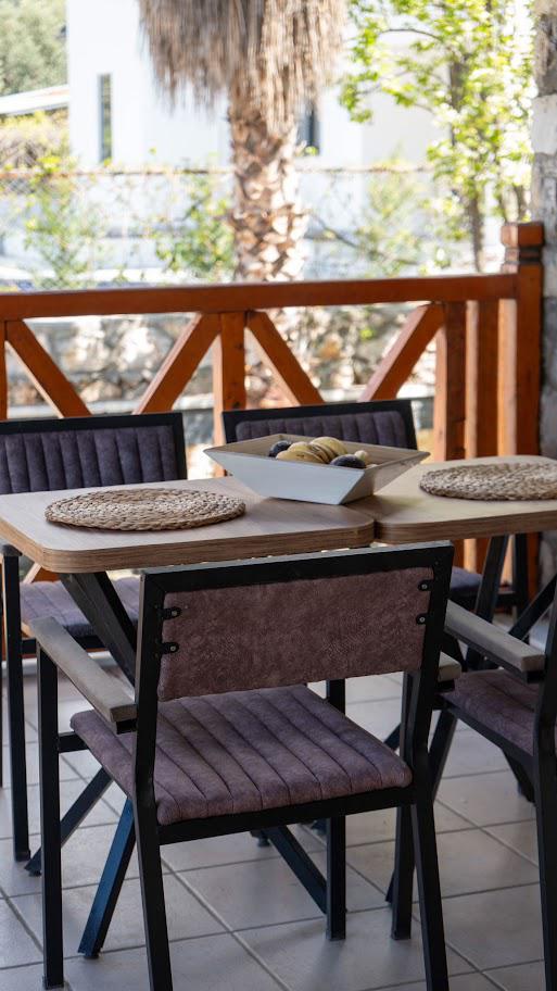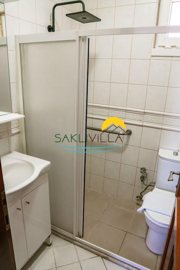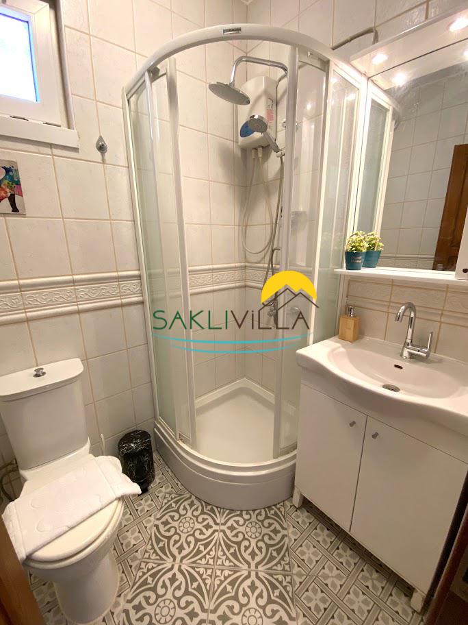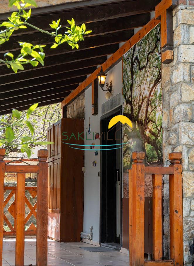 Kiralık villanın iç mekanları, konfor ve estetik anlayışıyla titizlikle düzenlenmiştir. Geniş ve ferah salon, modern oturma grubu, klima, LCD TV, uydu alıcısı ve kablosuz internet erişimi gibi olanaklarla donatılmıştır. Şık yemek masası ve sandalyeler, keyifli akşam yemekleri için ideal bir ortam sunarken, taş duvarların sunduğu doğal serinlik, gün boyu süren aktivitelerin ardından rahatlamanıza olanak tanır. Salon, hem dinlenmek hem de sevdiklerinizle vakit geçirmek için mükemmel bir alan olarak tasarlanmıştır.