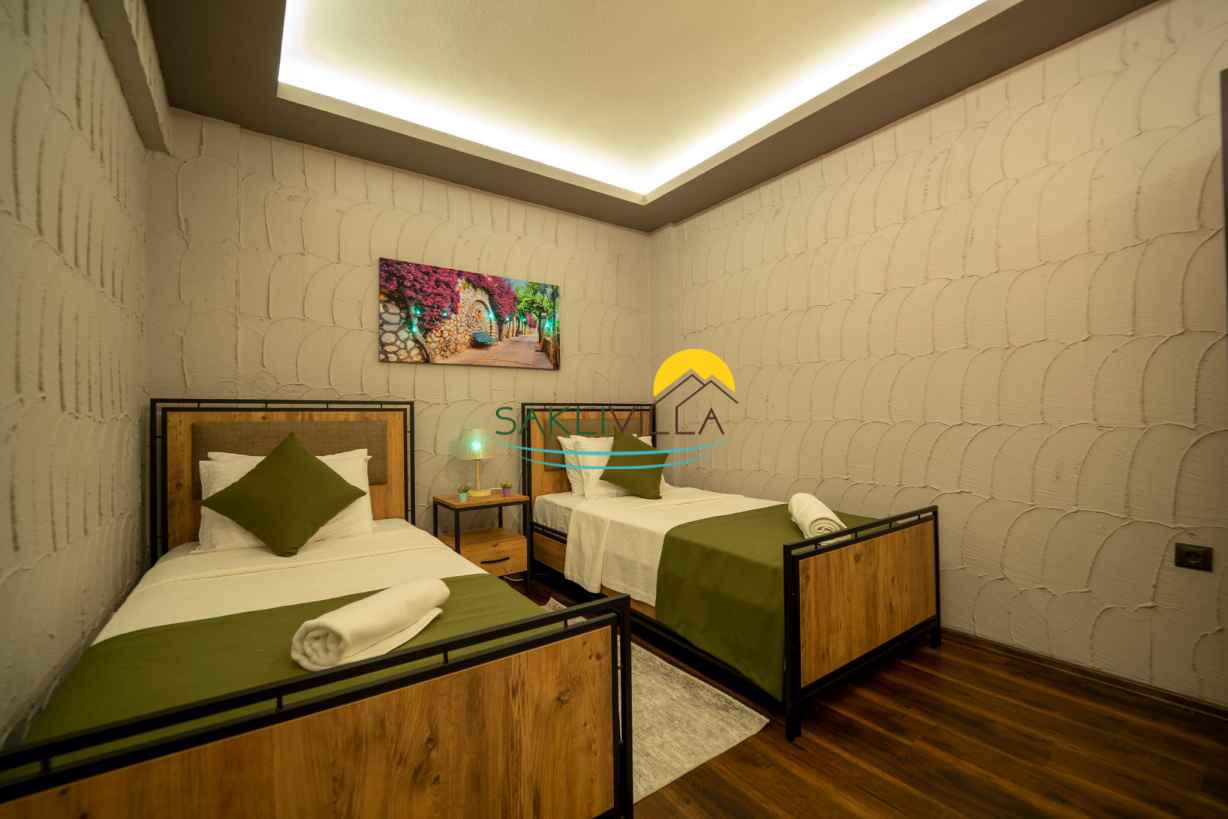 Villamız, 2 yatak odasına sahip olup 4 kişi konaklama kapasitesine sahiptir. 2 yatak odasında 1 çift kişilik ve 2 tek kişilik yatak bulunmaktadır. Açık plan oturma/yemek odası ve mutfak bölümünden, yüzme havuzu ve mangal/veranda alanına geçilir.