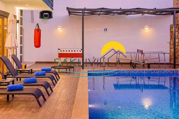Villamızın sunduğu ayrıcalıklardan biri de özel havuzudur. Korunaklı bir şekilde tasarlanmış olan havuz, konuklara keyifli ve özel bir yüzme deneyimi yaşatmaktadır. Havuzun etrafındaki şezlonglar ve güneşlenme alanı, konukların güneşin tadını çıkarırken rahatlayabileceği bir ortam sunmaktadır. Villamızda Masa Tenisi, Langırt, Trambolin, Dart, Boks Torbası ve Mini Basket Potası yer almakta olup eğlenceli vakit geçirebilirsiniz.