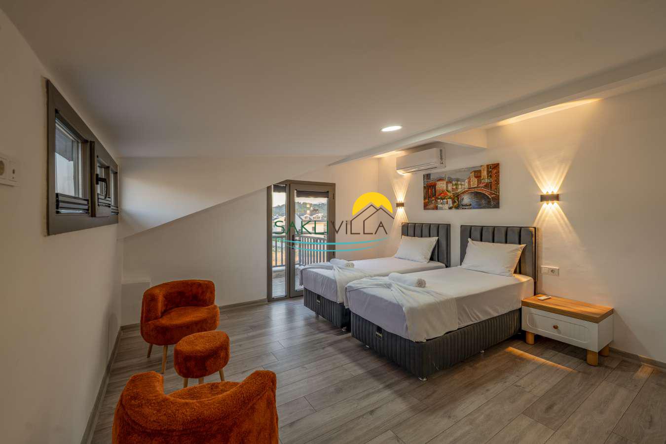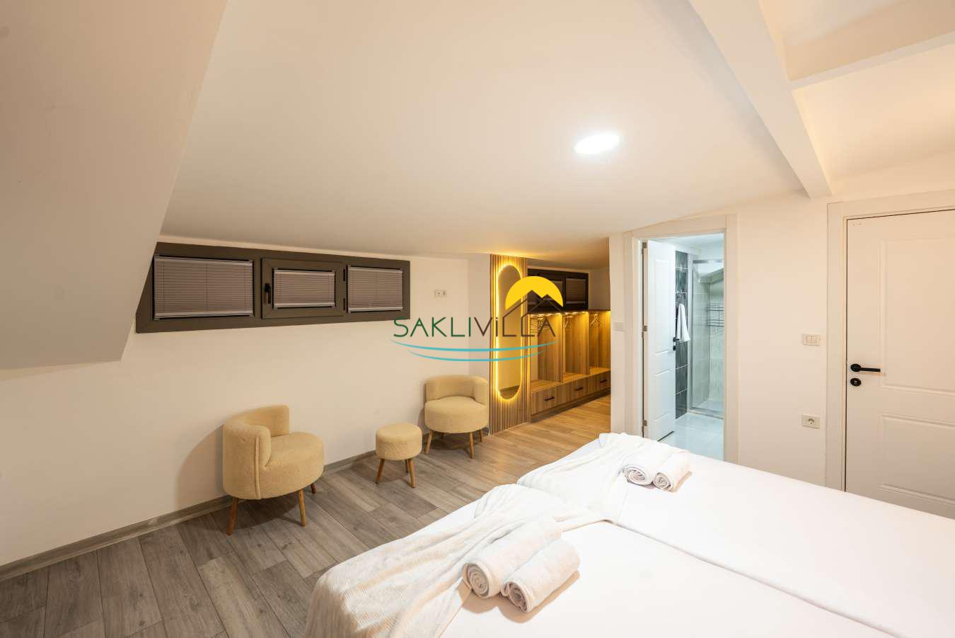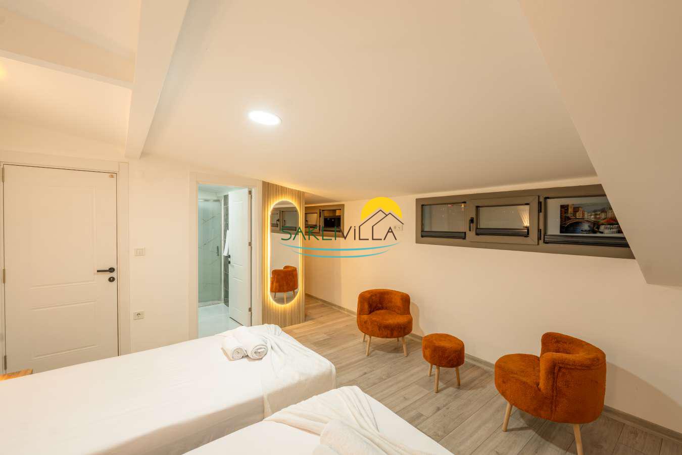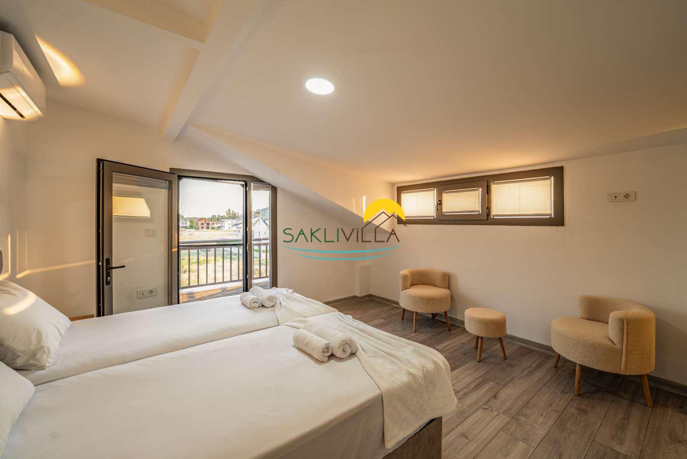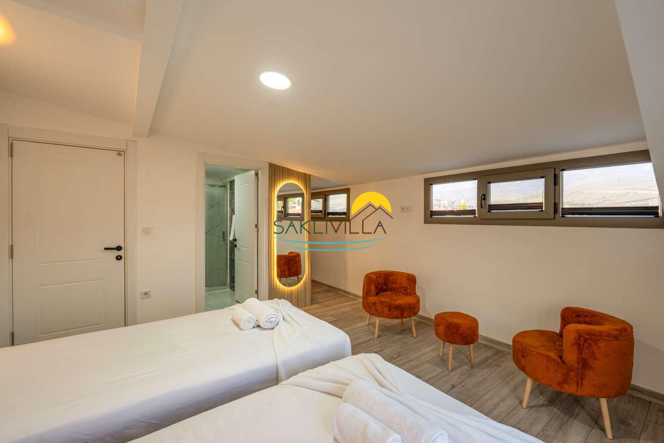 Toplamda dört süit yatak odasına sahip olan Villa Görgeç, sekiz kişiye kadar konaklama kapasitesi ile kalabalık aileler veya arkadaş grupları için idealdir. Her bir oda, konforlu ve kullanışlı olacak şekilde tasarlanmış; bu sayede misafirler rahat ve keyifli bir konaklama deneyimi yaşamaktadır. Villa içerisinde bulunan yatak düzeni oldukça esnek olup, dört adet tek kişilik yatak ve iki adet çift kişilik yatak mevcuttur. Ayrıca, talep edilirse tek kişilik yatakların birleşimiyle tüm odalar çift kişilik yatak haline getirilebilmektedir. Bu özellik, farklı konaklama ihtiyaçlarına kolaylıkla cevap verebilmekte ve misafirlerin kişisel tercihlerine göre uygun düzenlemelere imkan tanımaktadır.
