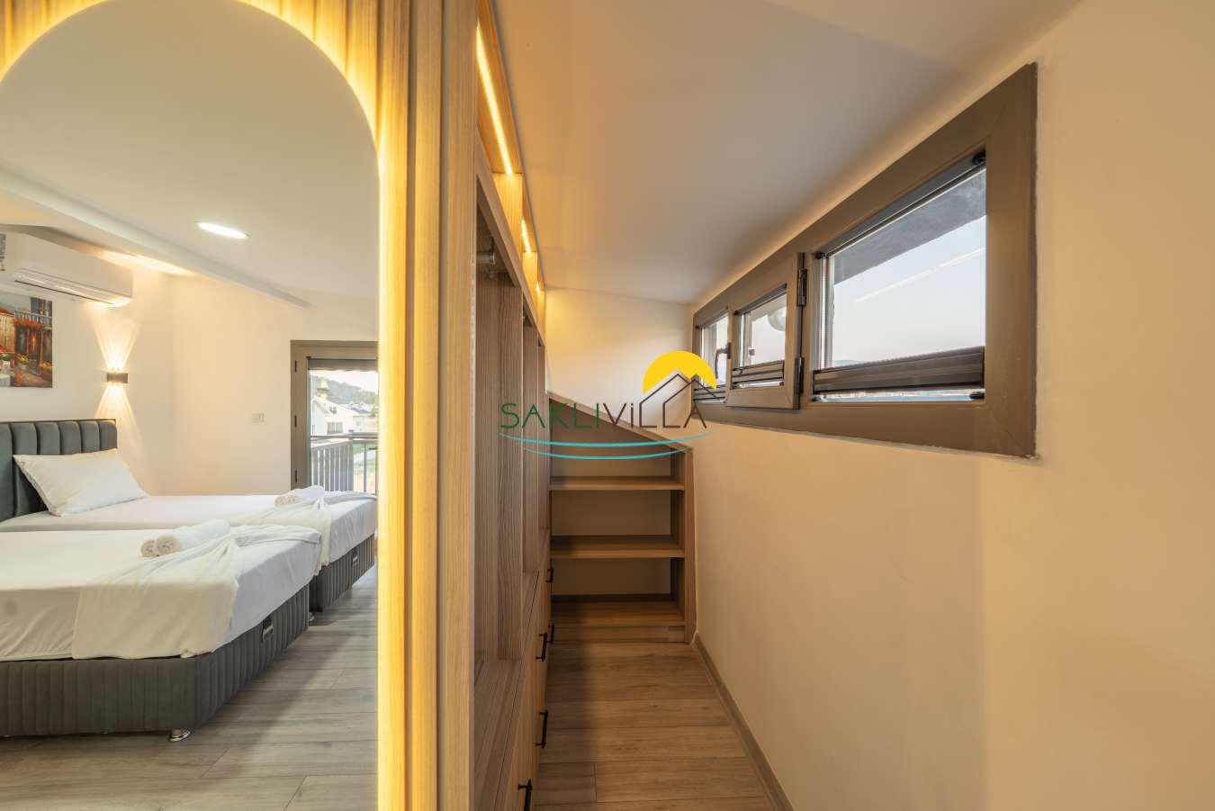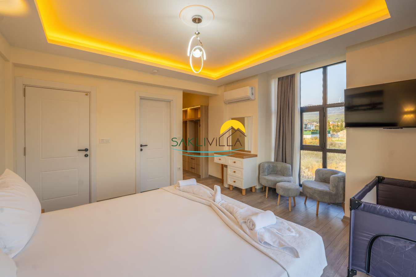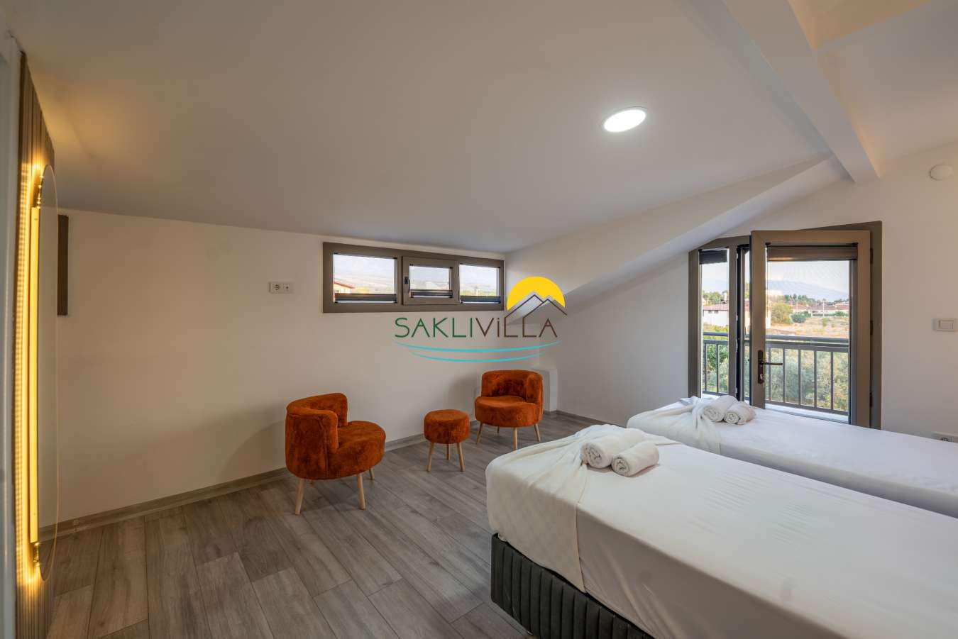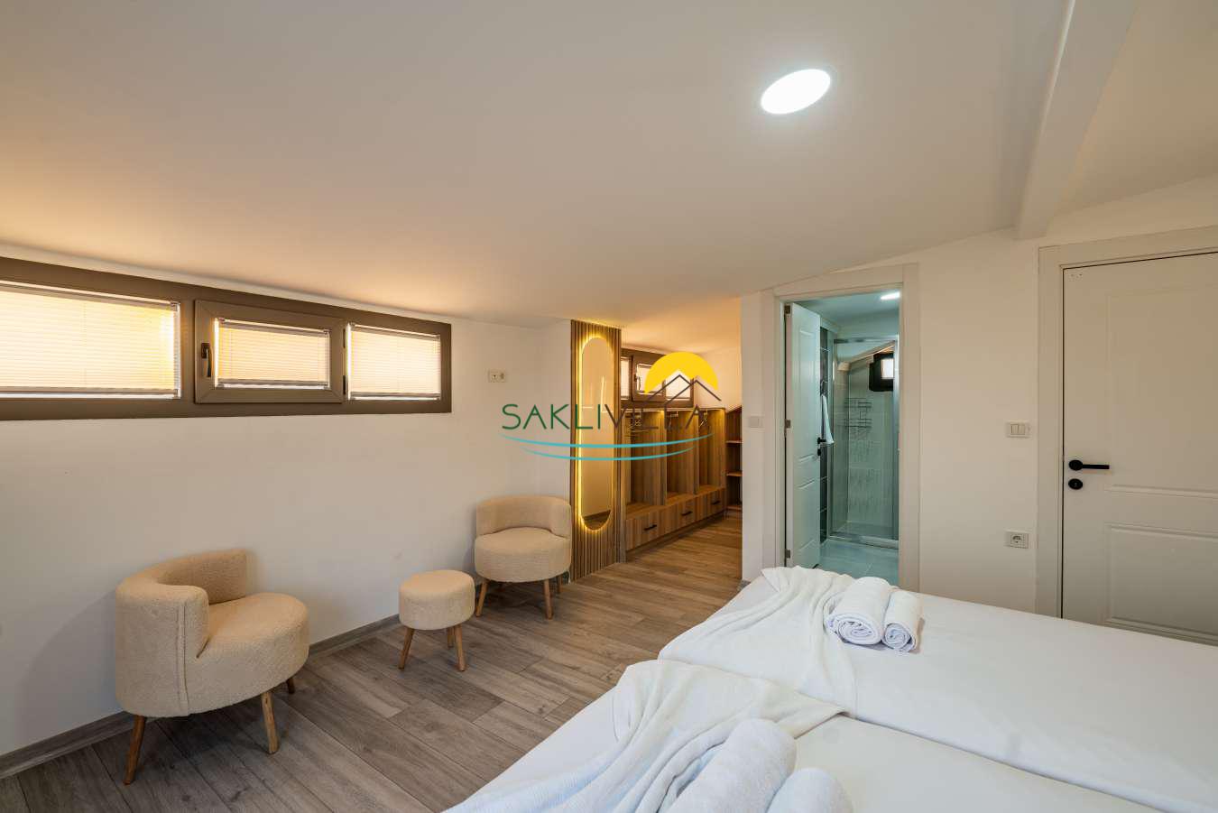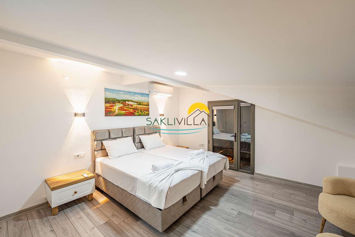 Toplamda dört süit yatak odasına sahip olan Villa Görgeç, sekiz kişiye kadar konaklama kapasitesi ile kalabalık aileler veya arkadaş grupları için idealdir. Her bir oda, konforlu ve kullanışlı olacak şekilde tasarlanmış; bu sayede misafirler rahat ve keyifli bir konaklama deneyimi yaşamaktadır. Villa içerisinde bulunan yatak düzeni oldukça esnek olup, dört adet tek kişilik yatak ve iki adet çift kişilik yatak mevcuttur. Ayrıca, talep edilirse tek kişilik yatakların birleşimiyle tüm odalar çift kişilik yatak haline getirilebilmektedir. Bu özellik, farklı konaklama ihtiyaçlarına kolaylıkla cevap verebilmekte ve misafirlerin kişisel tercihlerine göre uygun düzenlemelere imkan tanımaktadır.
