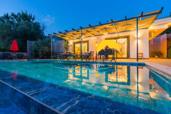 Havuz;Villamızın bahçesi içerisinde korunaklı özel havuz bulunmaktadır. Uzunluk: 8 metre, Genişlik: 4 metre, Derinlik: 1.5 metredir. Havuz terasında güneşlenme alanı, özel korunaklı havuz şezlonglar, güneş şemsiyesi, 4 kişilik yemek masası, oturma grubu bulunmaktadır.