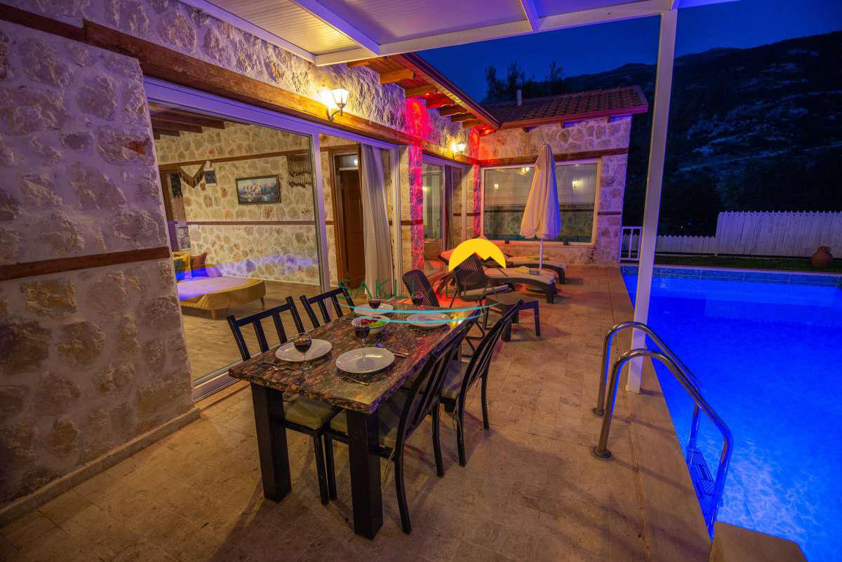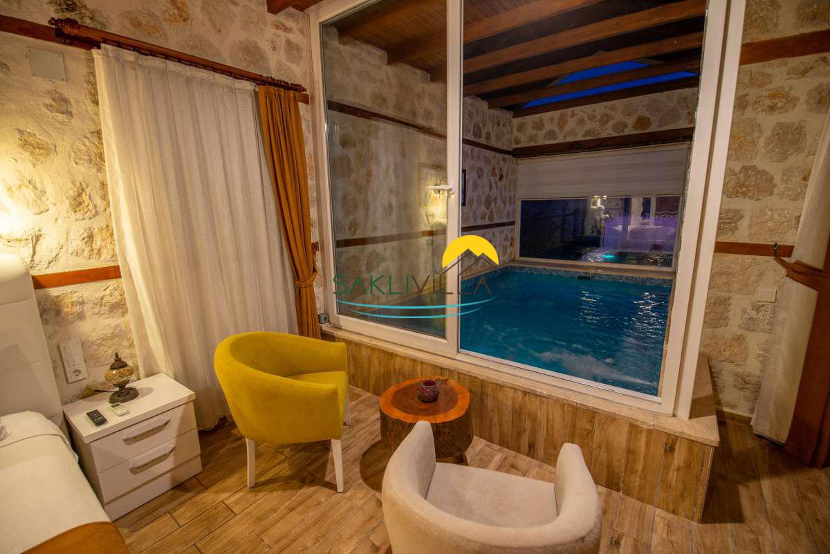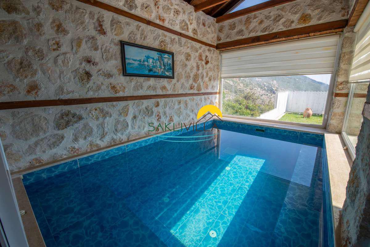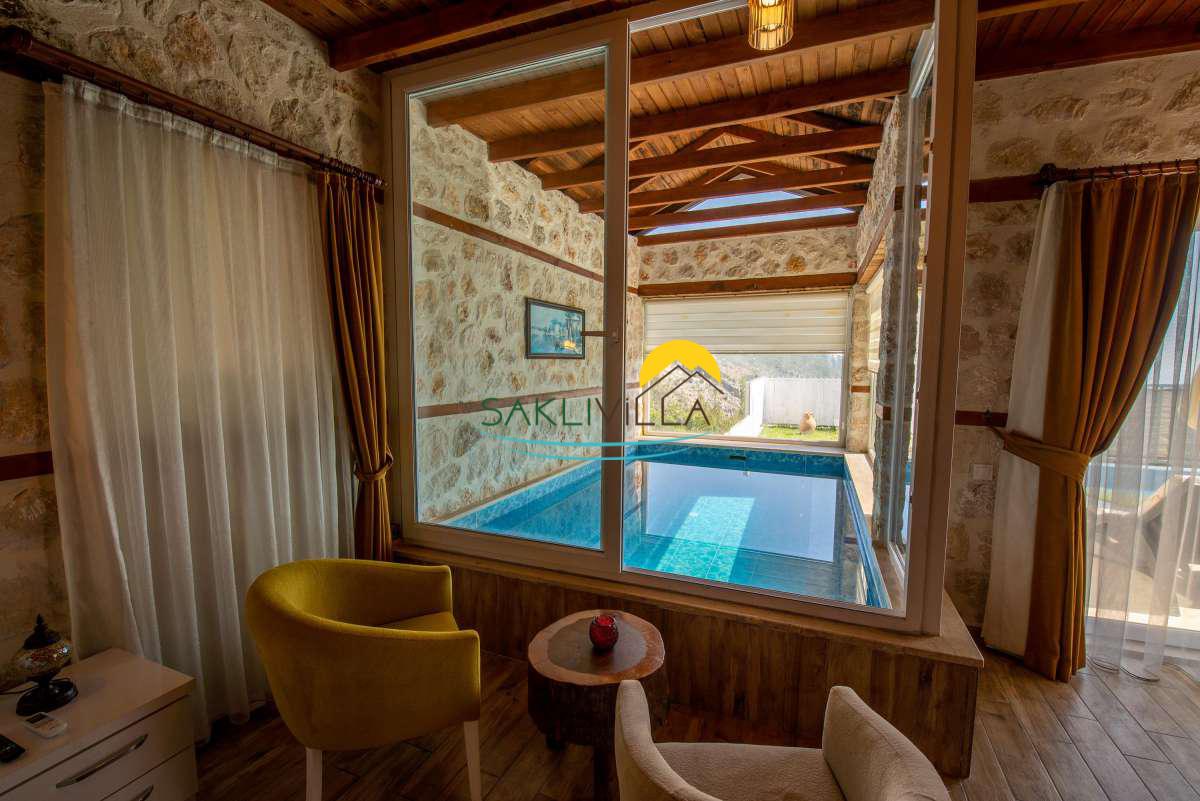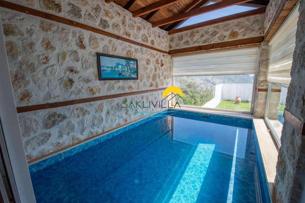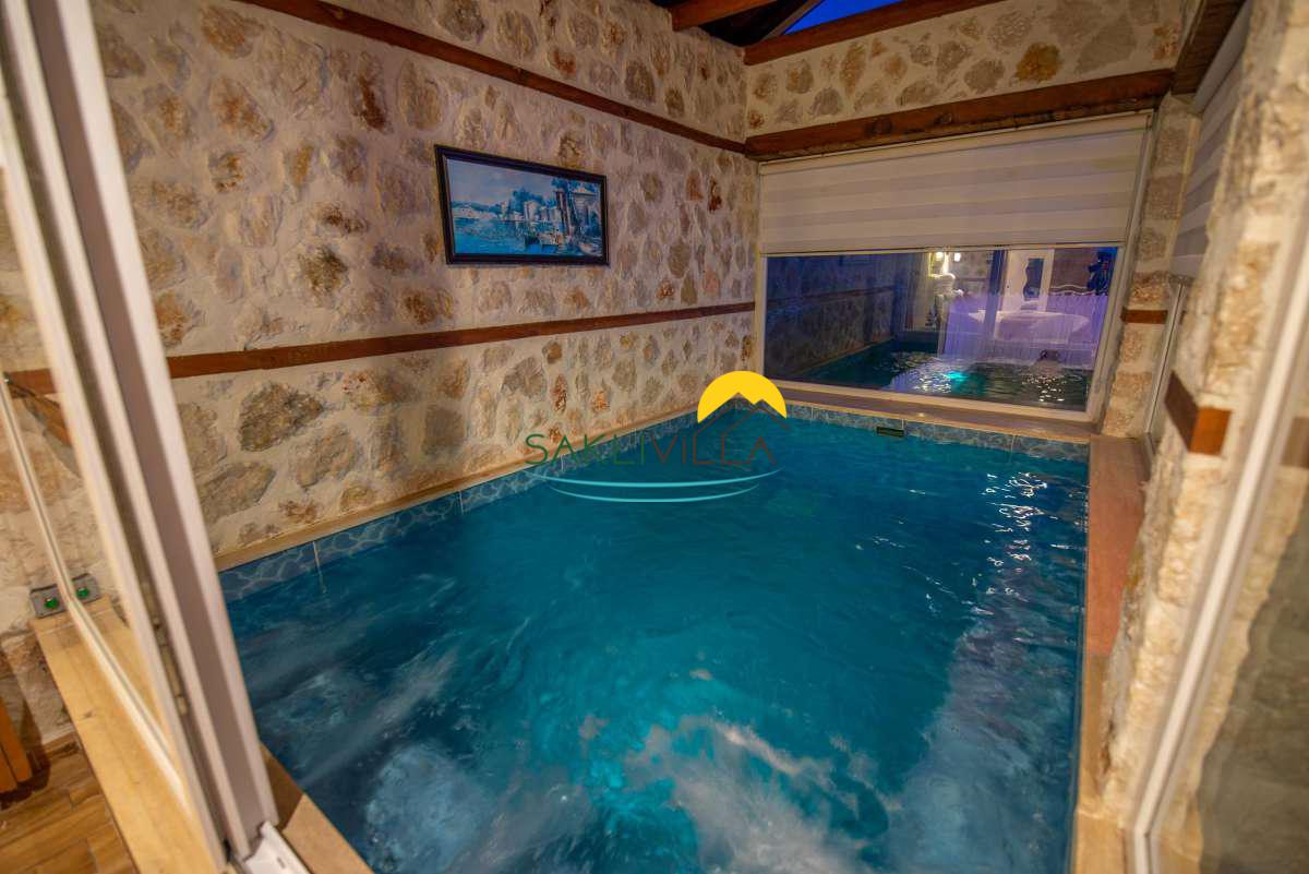 Taş mimarisi ve şık tasarımıyla dikkat çeken villamızda kapalı havuz vardır. Böylece villamız, misafirlerine dört mevsim tatil imkanı sunar. Ayrıca bu kapalı havuz, jakuzi özelliğine de sahiptir. 3,8 m. x 2,5 m. genişliğinde 1,2 m derinliğinde ısıtmalı iç havuza sahip olan bu muhteşem balayı villamız Kalkan'ın en özel villalarındandır.