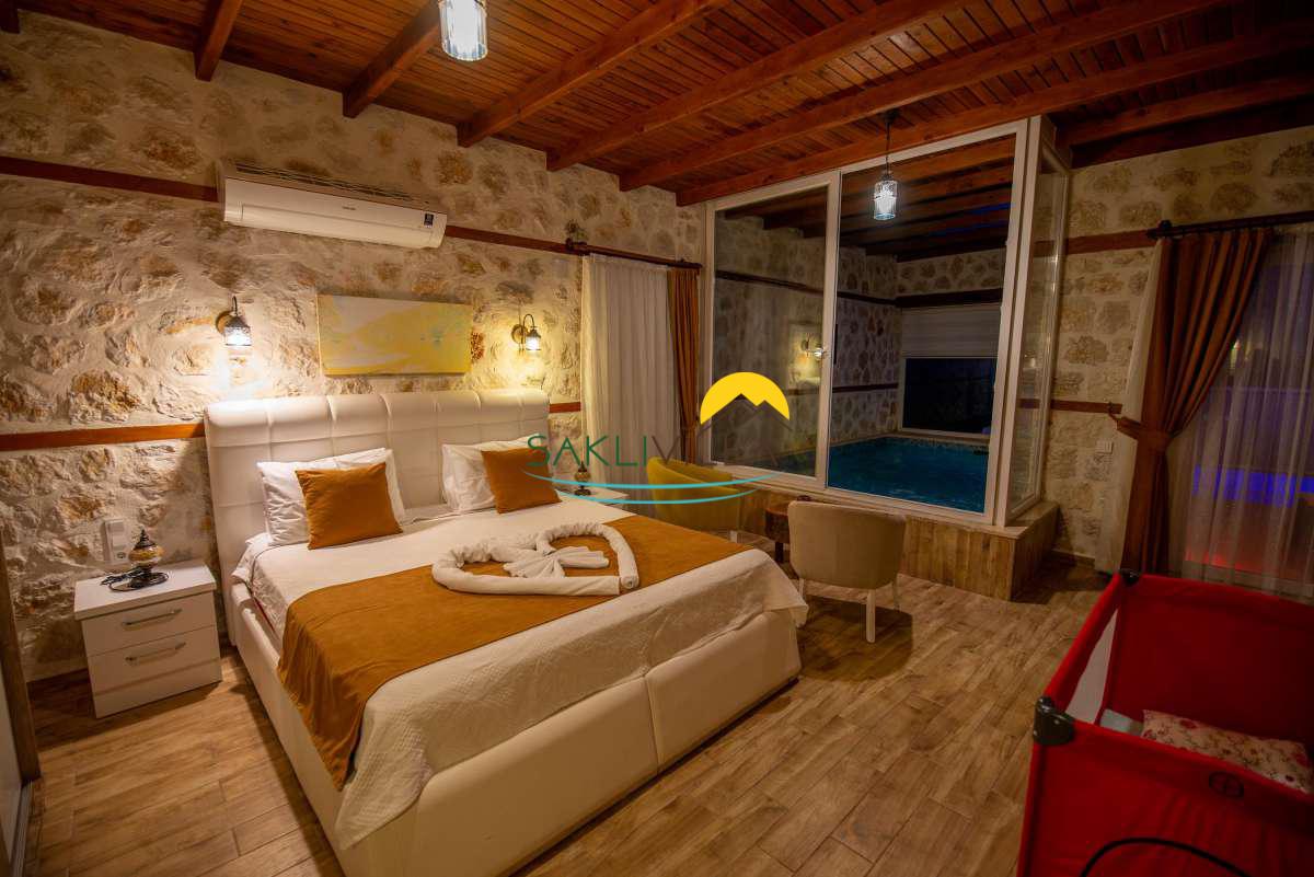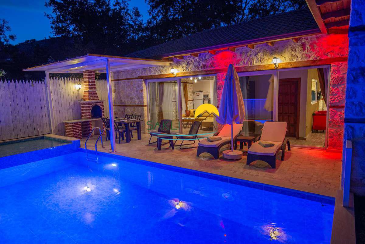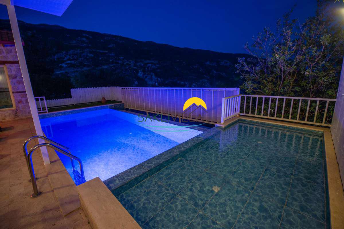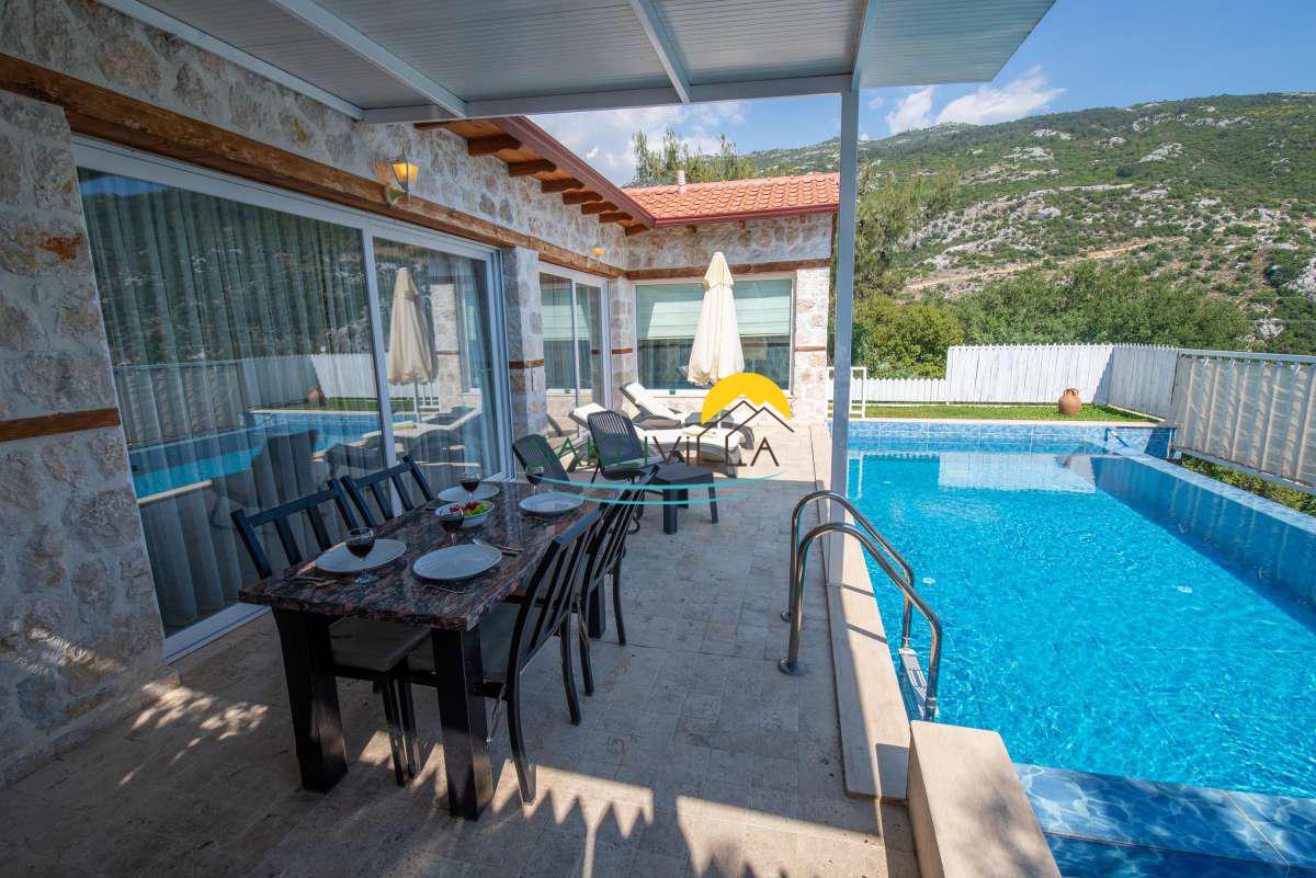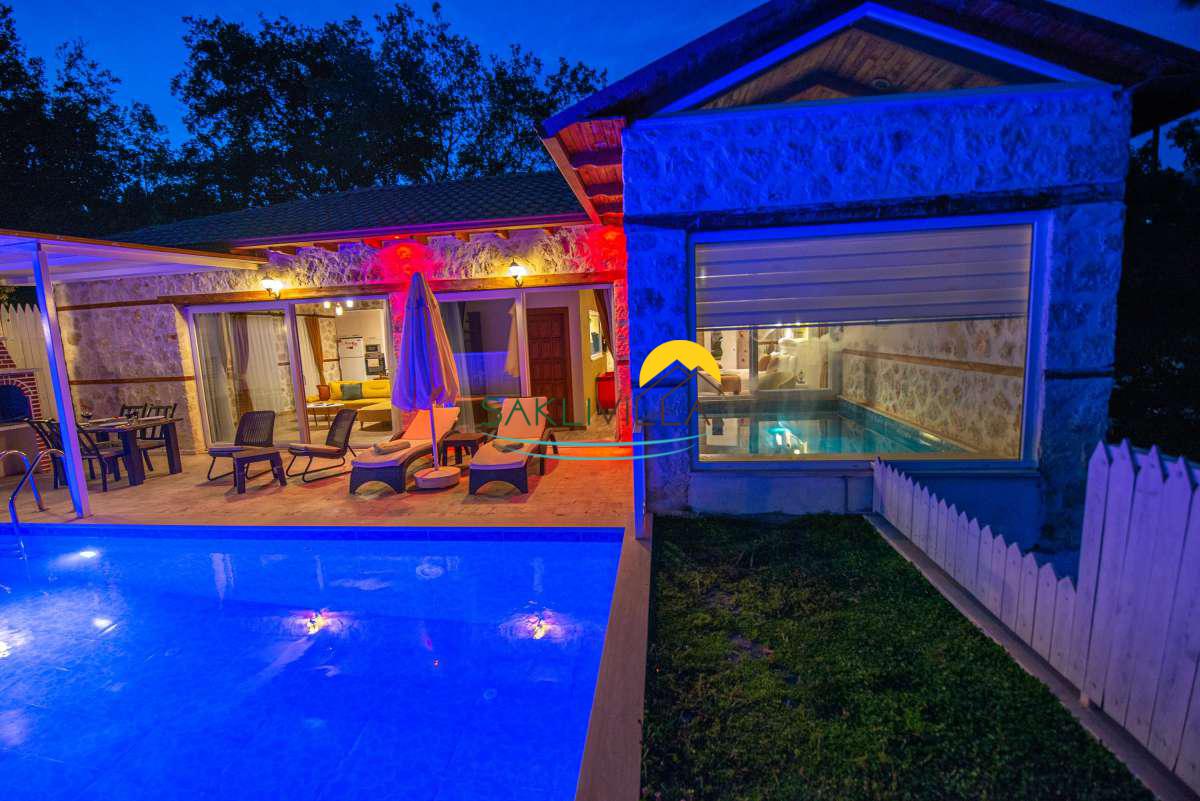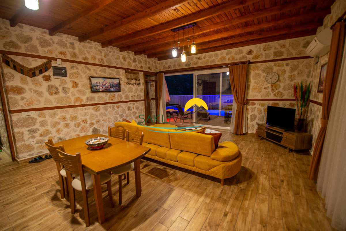 Taş mimarisi ve şık tasarımıyla dikkat çeken villamızda kapalı havuz vardır. Böylece villamız, misafirlerine dört mevsim tatil imkanı sunar. Ayrıca bu kapalı havuz, jakuzi özelliğine de sahiptir. 3,8 m. x 2,5 m. genişliğinde 1,2 m derinliğinde ısıtmalı iç havuza sahip olan bu muhteşem balayı villamız Kalkan'ın en özel villalarındandır.