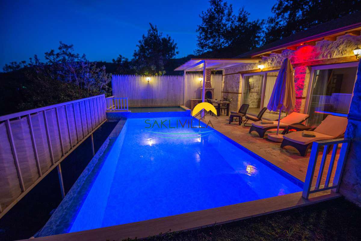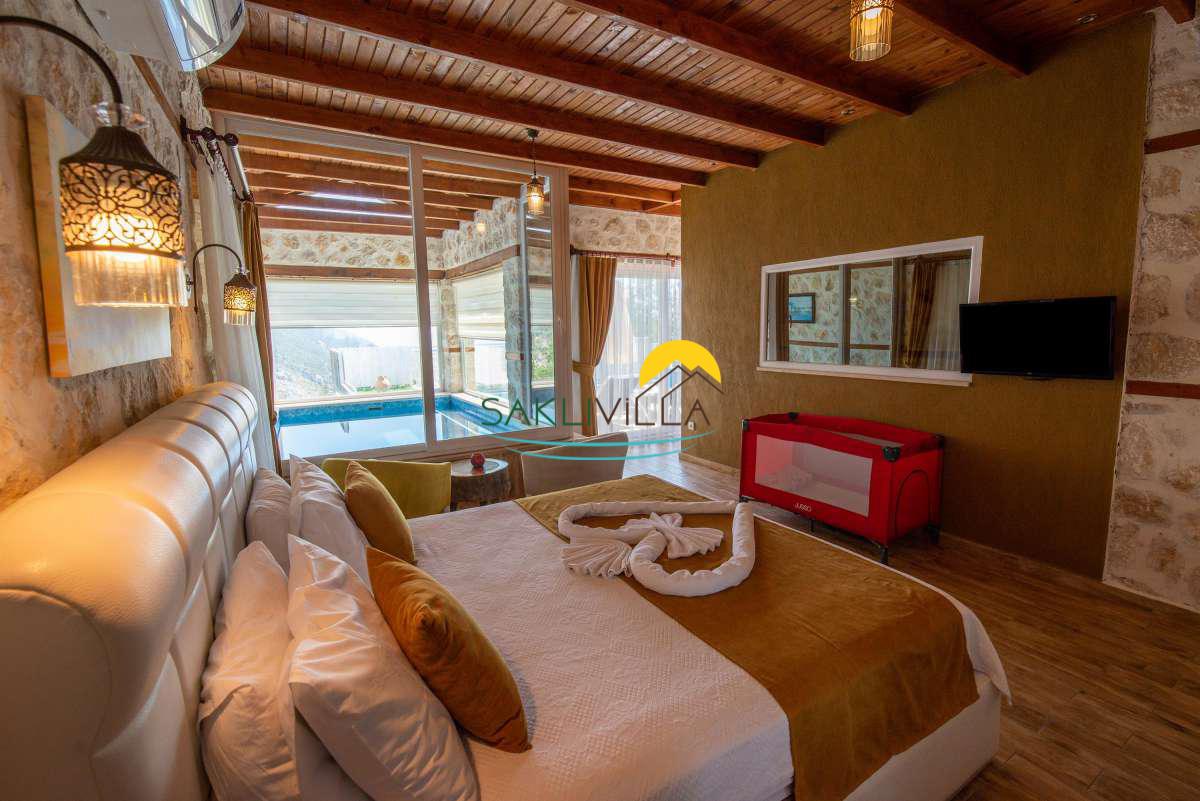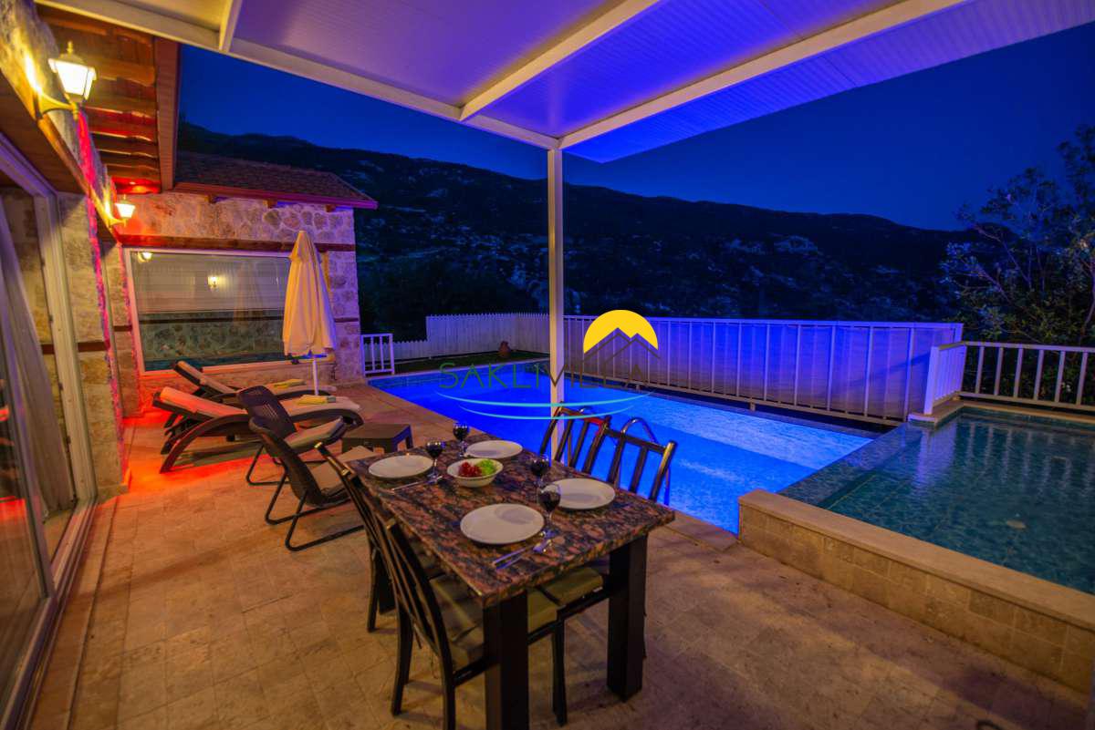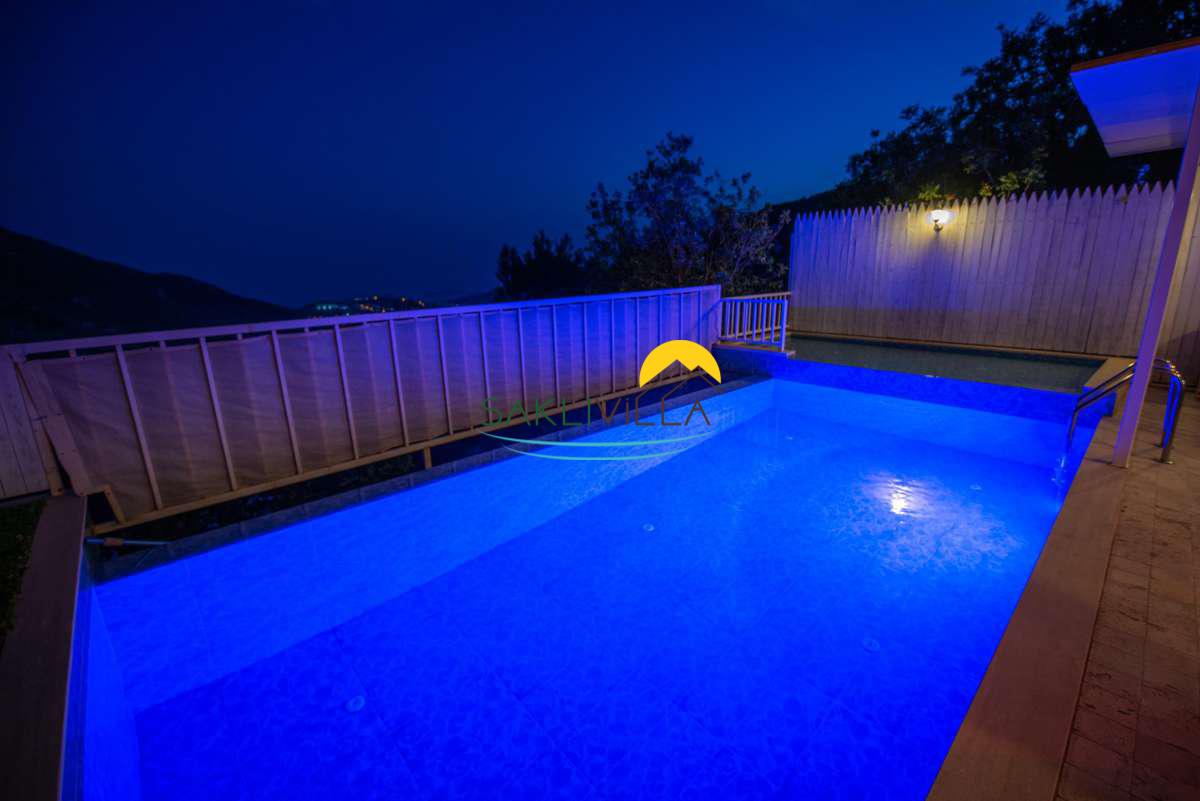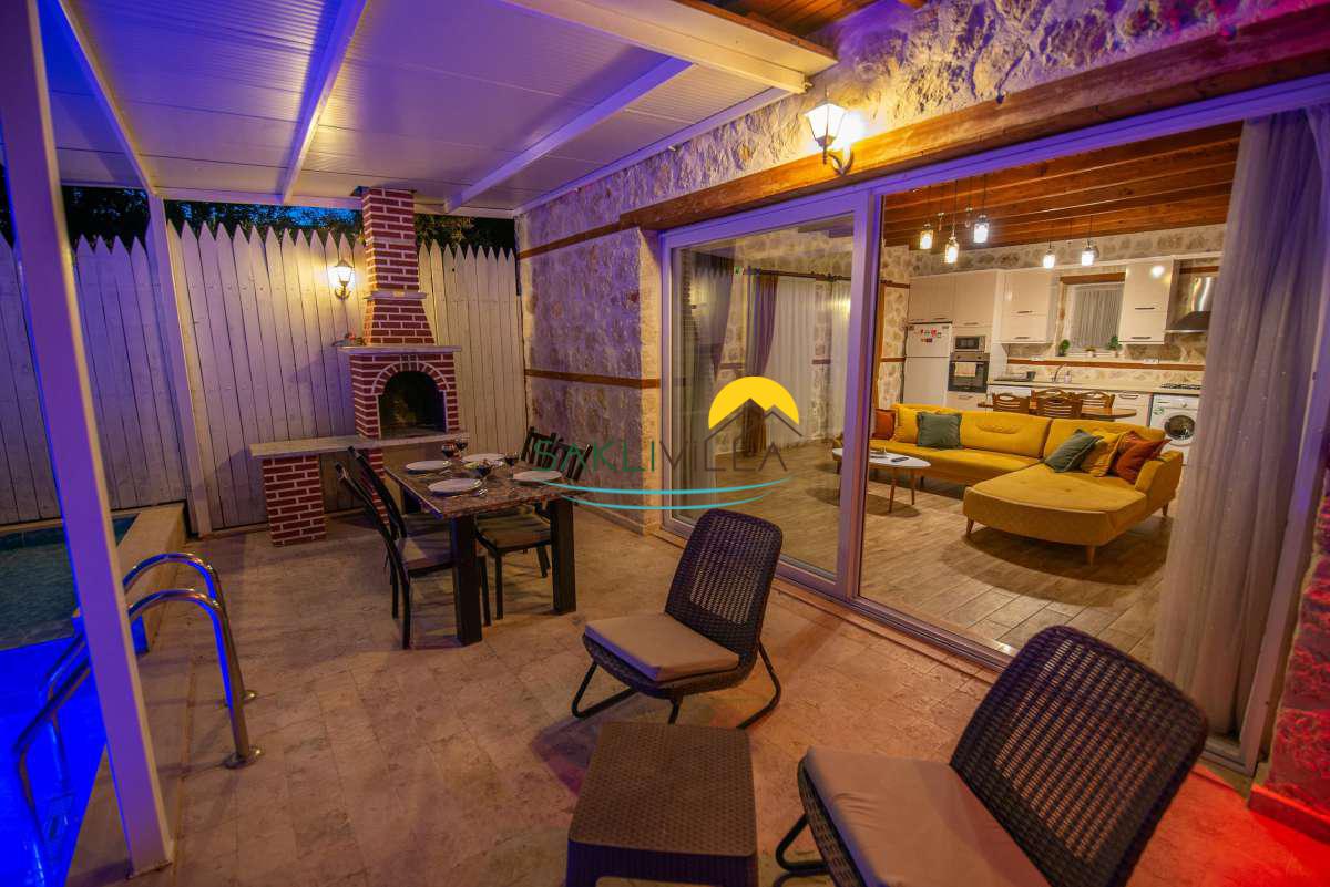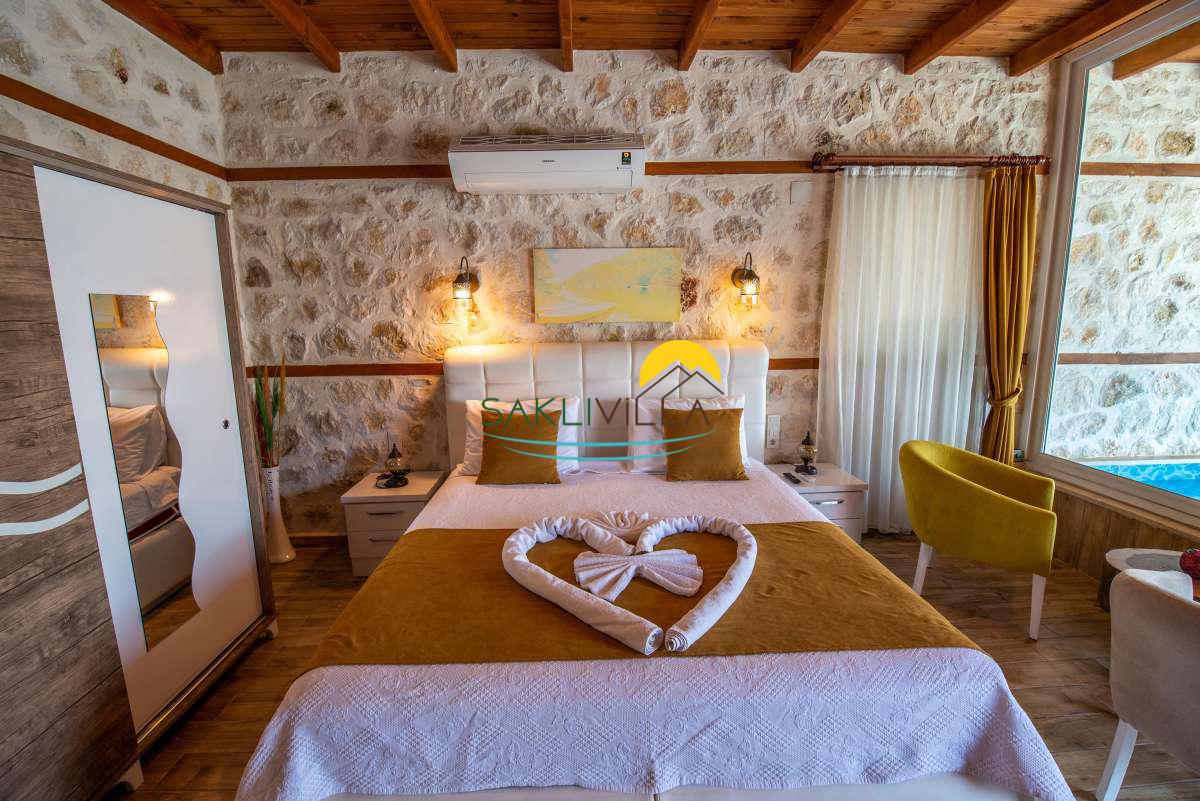 Taş mimarisi ve şık tasarımıyla dikkat çeken villamızda kapalı havuz vardır. Böylece villamız, misafirlerine dört mevsim tatil imkanı sunar. Ayrıca bu kapalı havuz, jakuzi özelliğine de sahiptir. 3,8 m. x 2,5 m. genişliğinde 1,2 m derinliğinde ısıtmalı iç havuza sahip olan bu muhteşem balayı villamız Kalkan'ın en özel villalarındandır.