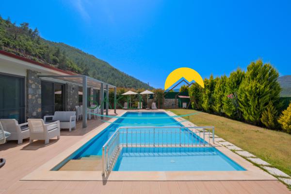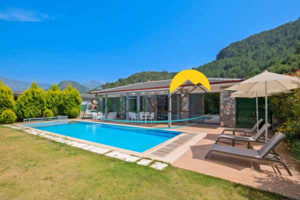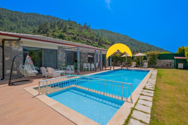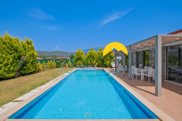 Özellikler: Özel açık yüzme havuzu, güneşlenme alanı, şezlonglar, özel bahçe, özel park yeri ve mangal alanı.