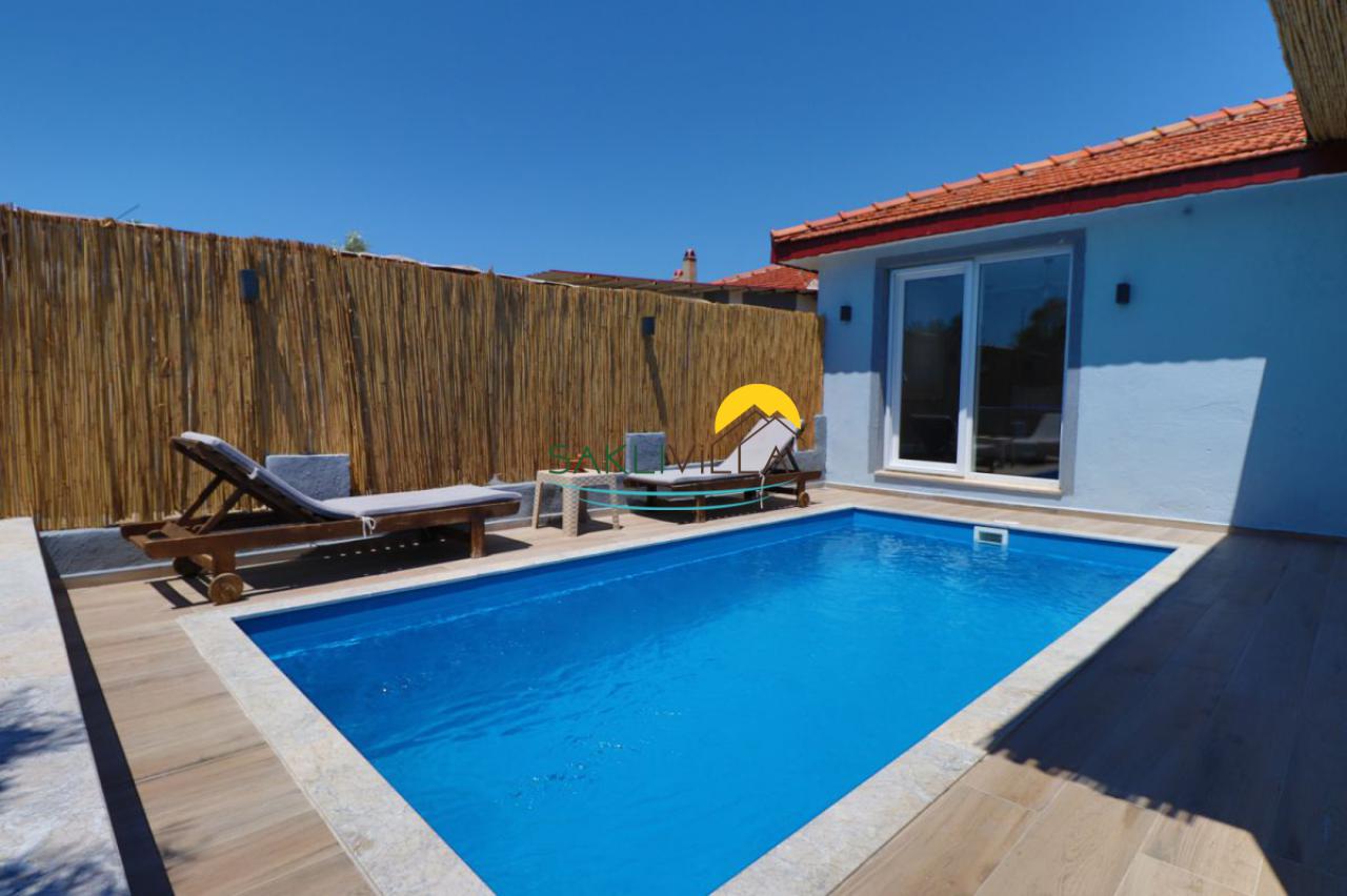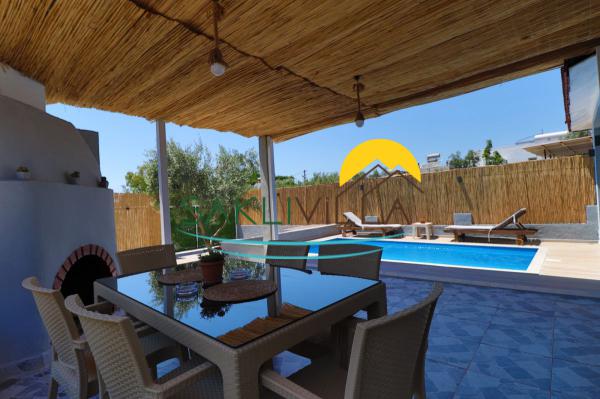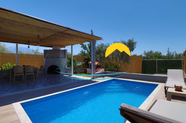 Havuz kenarında güneş şemsiyesi ve şezlonglar, yemek masası, salıncak, barbekü yer almaktadır.