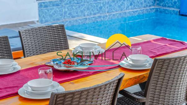 Villamız 2 yatak odası ve yüzme havuzuna açılan açık mutfaklı oturma/yemek odasından oluşur. Mutfak kısmında bulunan yemek masası 4 kişi kapasitelidir.