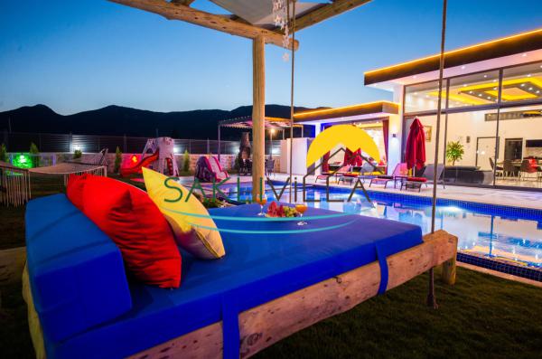 Villanın en dikkat çekici özelliklerinden biri, özel yüzme havuzunun yanında yer alan çocuk havuzudur. Bu havuz, ailelerin çocukları ile birlikte güvenli ve eğlenceli bir şekilde vakit geçirebilmesi için gerek duyulan korumayı sağlamakta, aynı zamanda çocukların su oyunları oynamasını da teşvik etmektedir. Yüzme havuzunun etrafı, mahremiyet sağlayabilecek şekilde düzenlenmiştir ki bu durum, misafirlerin tamamen rahat bir deneyim yaşamalarını mümkün kılar.