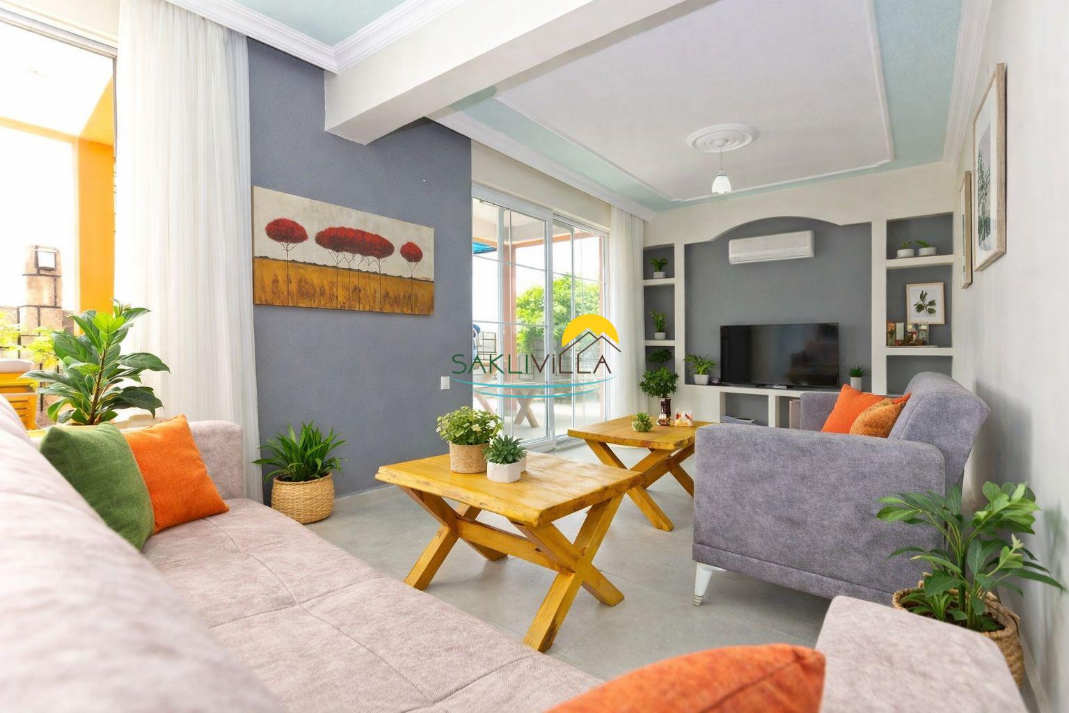 Salon: Geniş ve modern oturma odası Koltuk takımları, TV, Klima, Lavabo ve Havuz bölümüne çıkış bulunmaktadır.