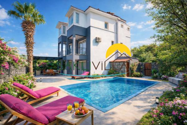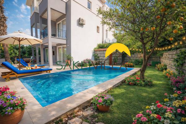 Özellikler: Özel açık yüzme havuzu, güneşlenme alanı, şezlonglar, özel bahçe, özel park yeri ve mangal alanı.