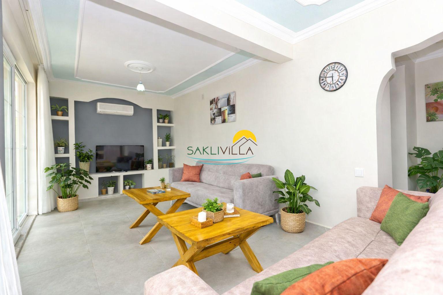 Salon: Geniş ve modern oturma odası Koltuk takımları, TV, Klima, Lavabo ve Havuz bölümüne çıkış bulunmaktadır.