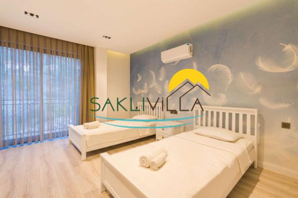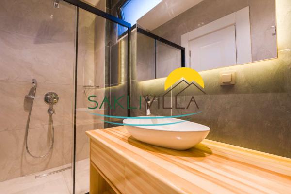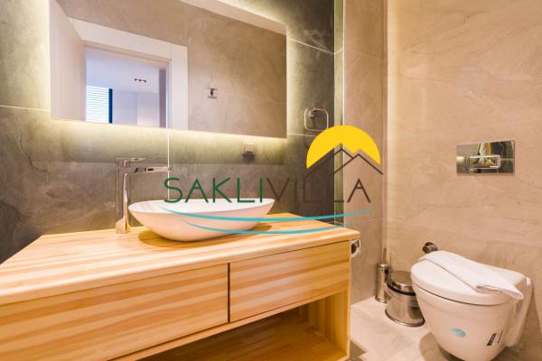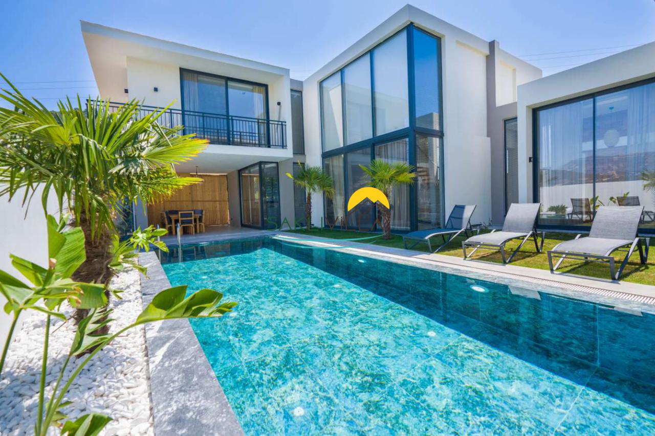 Villanın en dikkat çekici özelliklerinden biri ise özel korunaklı geniş havuzudur. Bu havuz, sadece sizin ve sevdiklerinizin keyifle vakit geçirebileceği bir alan sunmaktadır. Havuzun etrafındaki şezlonglarda güneşlenerek bronzlaşabilir ve serin sularında yüzerek serinleyebilirsiniz.