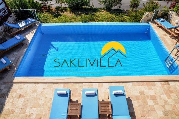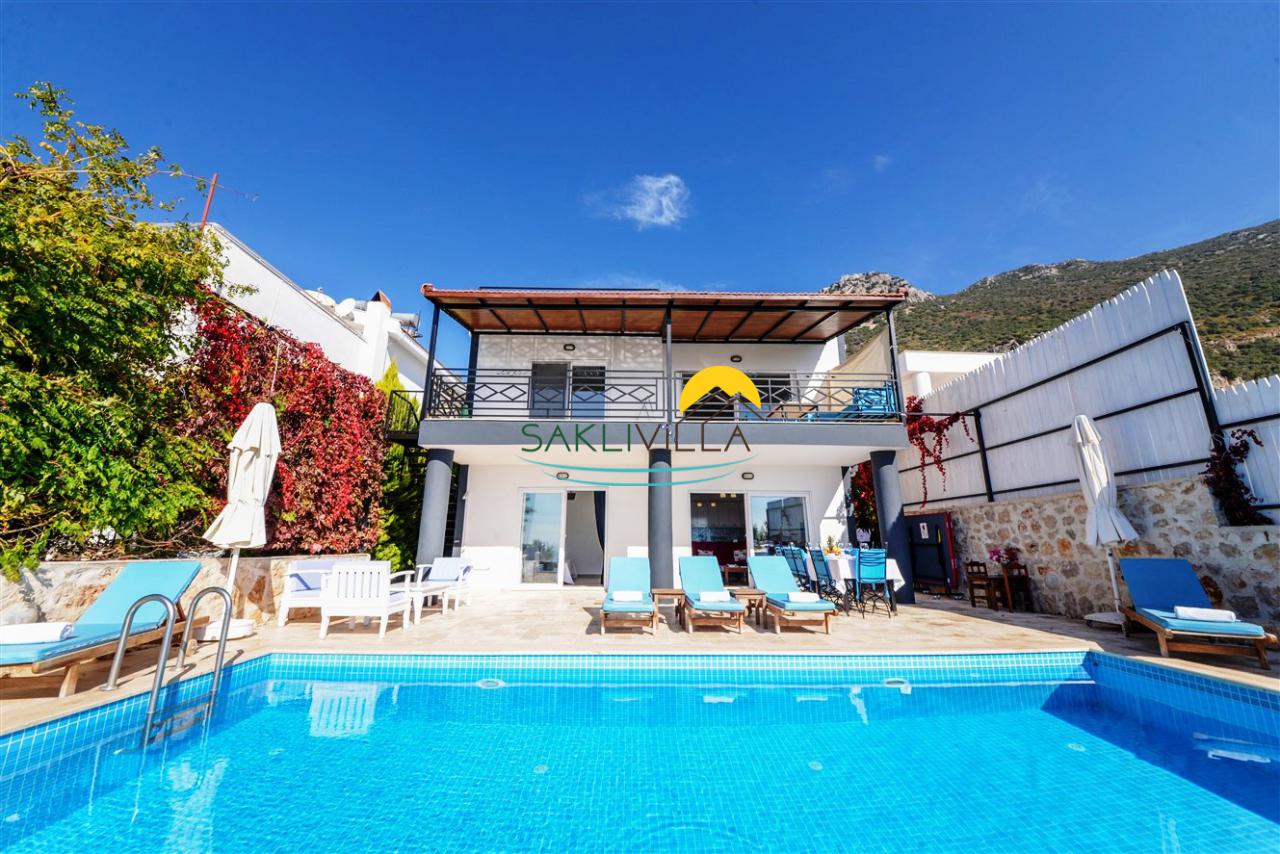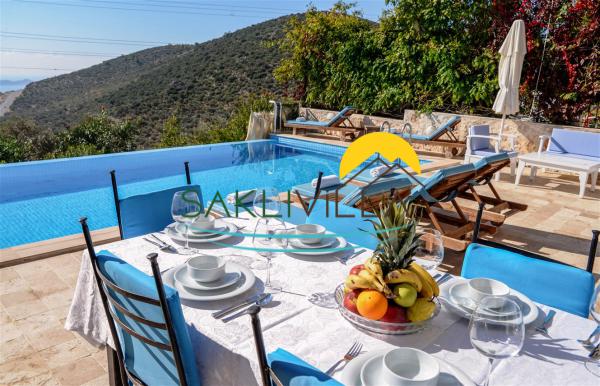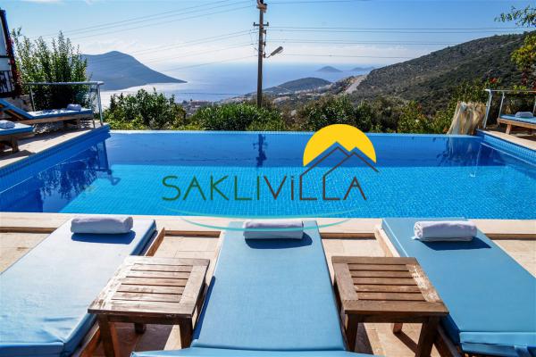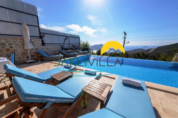 Panoramik Kalkan deniz manzarası, geniş salonu, geniş bahçesi, geniş odaları, havuz başında şezlong, yemek masası ve sandalyeleri ve barbeküsü gibi seçenekleri ile siz misafirlerimize romantik, kusursuz bir tatil sunar.
