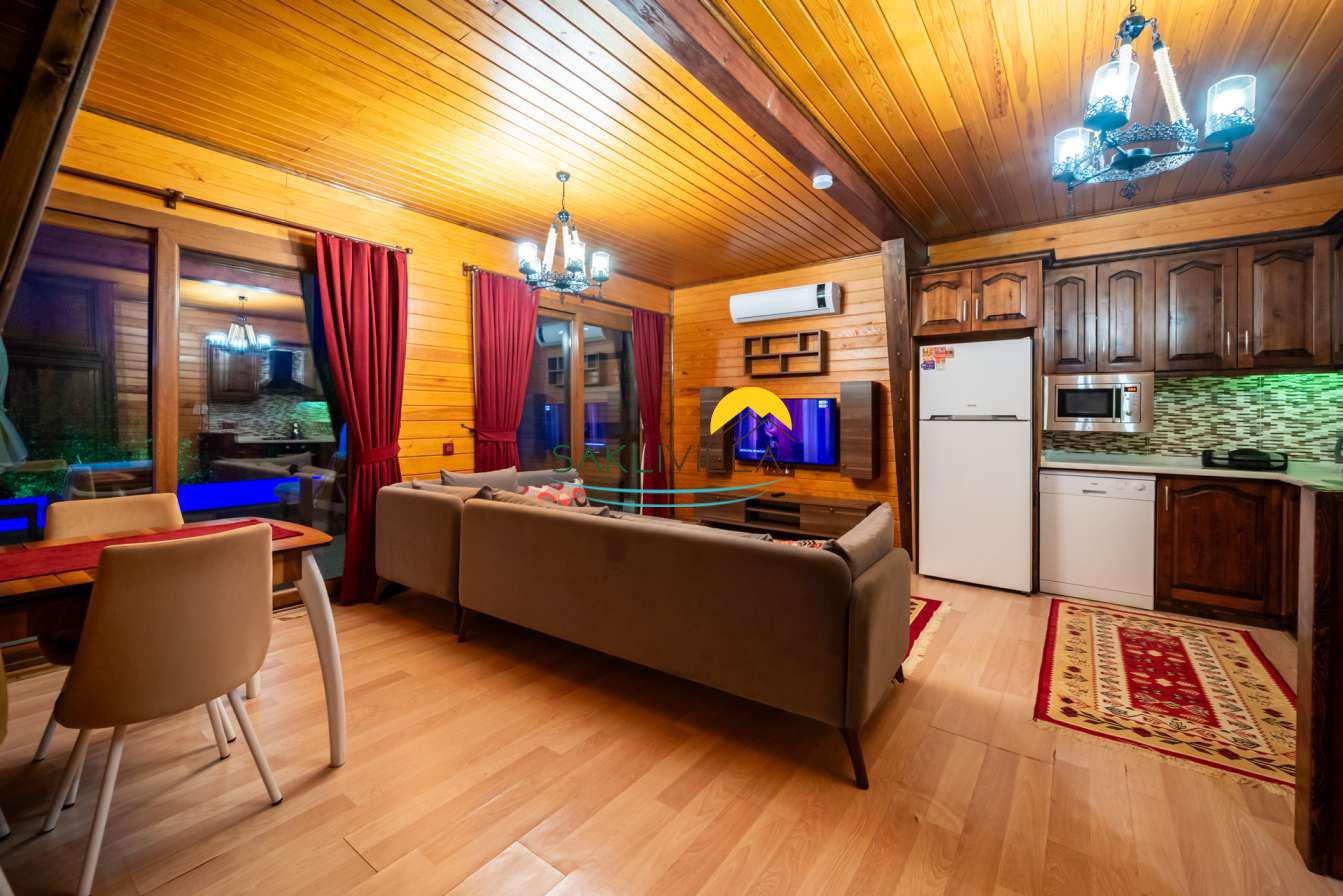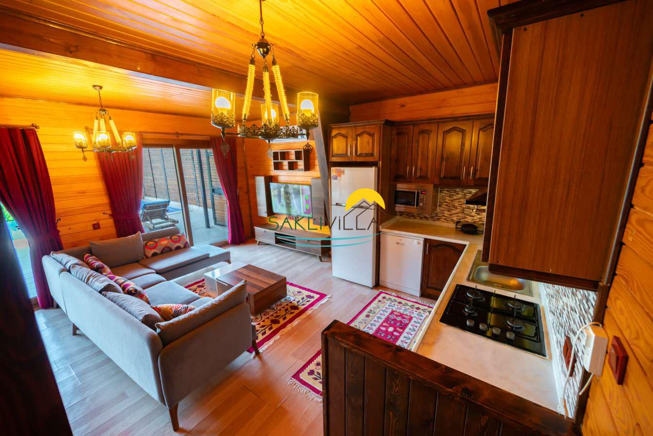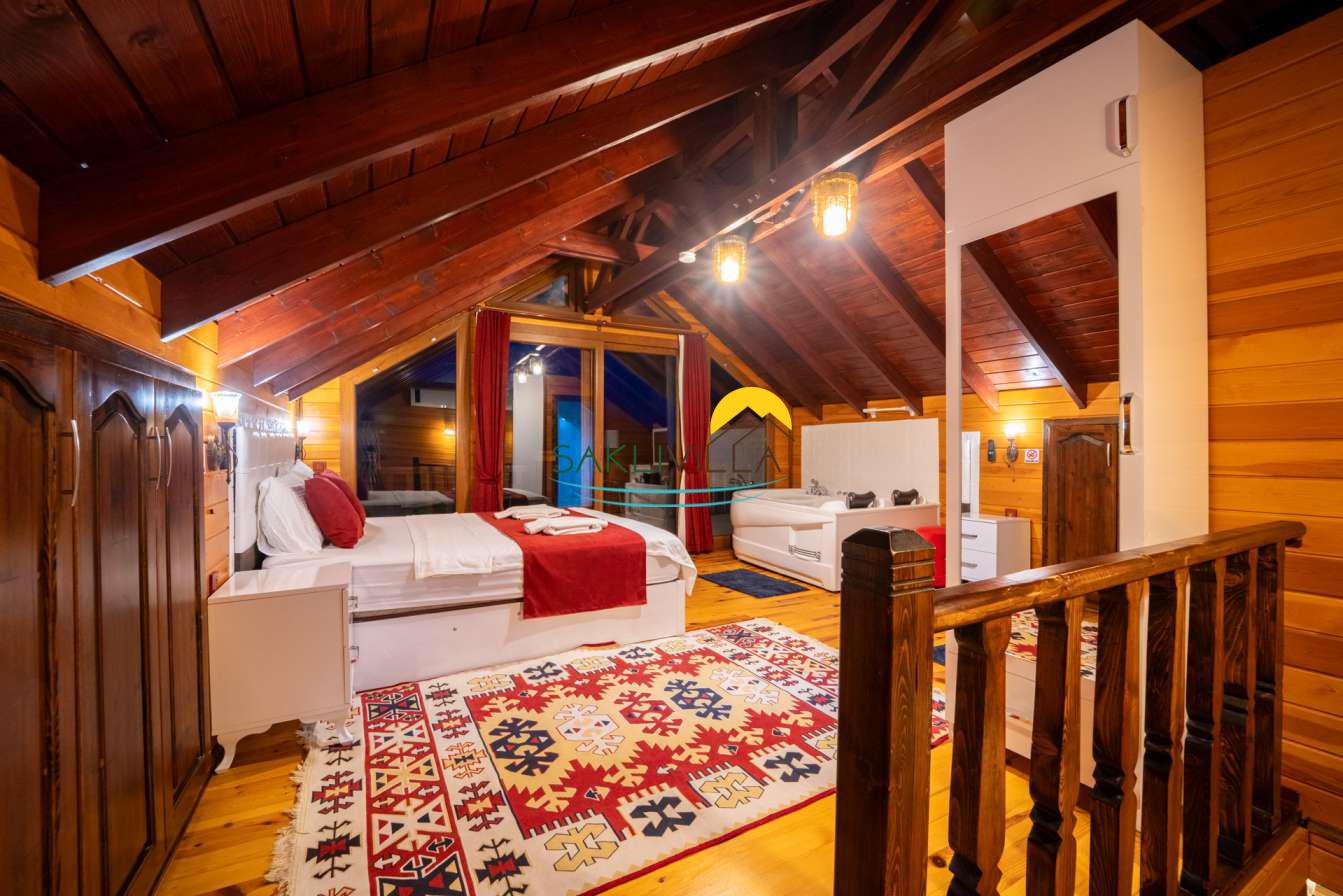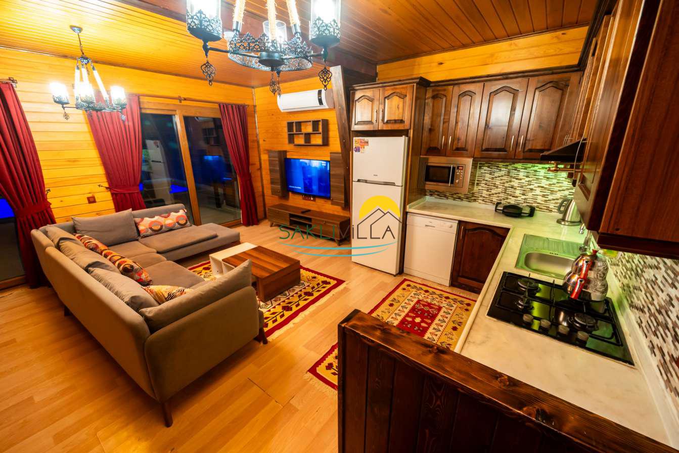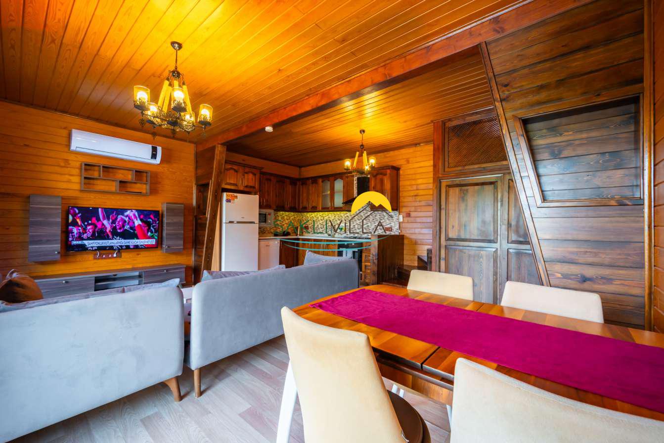 Ahşap mimarisi, doğanın estetiği ile bütünleşen bir tasarım anlayışını yansıtır. kiralık villa’nın iç mekanları da, modern konforu geleneksel bir atmosferle birleştirecek şekilde dekore edilmiştir. 2 yatak odası ve 4 kişi konaklama kapasitesi ile geniş bir aile ya da balayı çiftleri için ideal bir alan sunar. Her detayı düşünülmüş olan Villa Seyir, ferahlığı ve lüksü bir arada hissettirirken, misafirlere evlerinde gibi hissettirecek sıcak bir ortam sağlamaktadır.